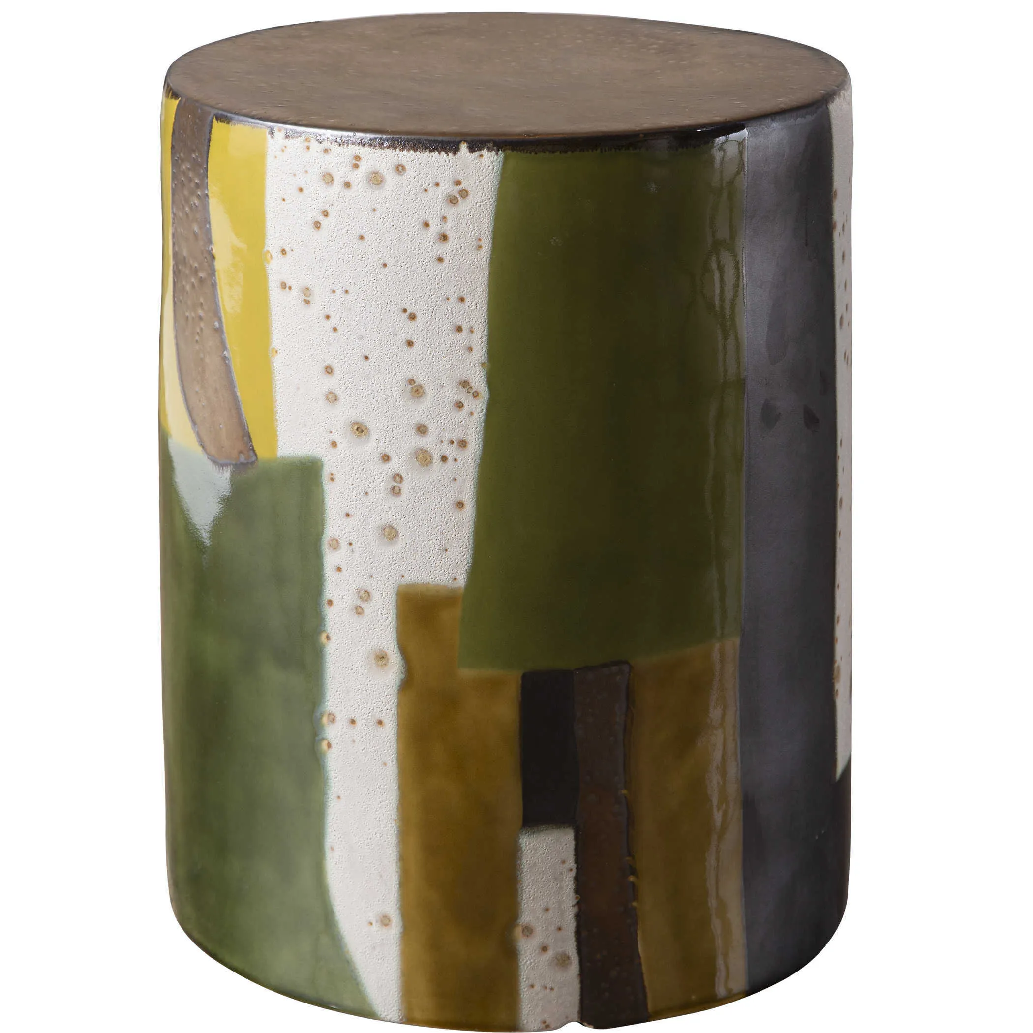 Made of ceramic, the Graph Garden Stool decoration is reminiscent of abstract cubist oil paintings. Executed in gorgeous shades of green, citron, and bronze, it functions as the perfect drink table and is a beautiful artistic accent to complement your favorite chair. May be used outdoors, but protection from freezing temperatures is recommended.