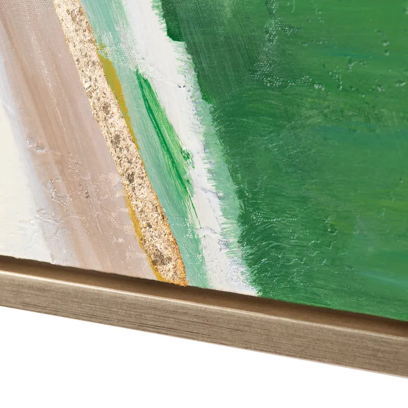 Introducing our Leblanc set of two oversized canvas paintings that will make a statement in any space. These abstract designs showcase bold colors of blues and greens, combined with calming shades of grey and cream, creating a beautiful contrast that catches the eye. What makes these paintings unique are the heavy gold foil embellishments and hand-painted textures, which add a tactile quality to the artwork. The gold foil catches the light and shimmers beautifully, adding a touch of luxury and sophistication to the paintings. The artwork is finished off with a beautiful gold frame, which adds a touch of elegance and refinement to the artwork.