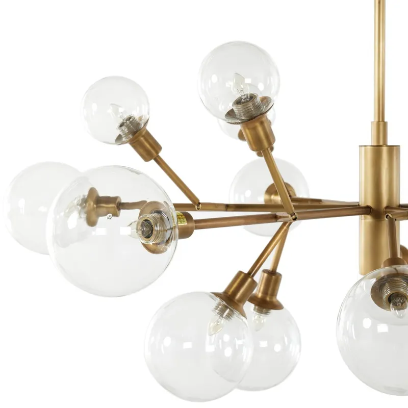 A unique cluster of sculptural iron arms are finished in a matte brass for edgy elegance. Three 12" pipes included; body length adjustable from 9" to 24". This piece is not compatible with sloped ceilings.