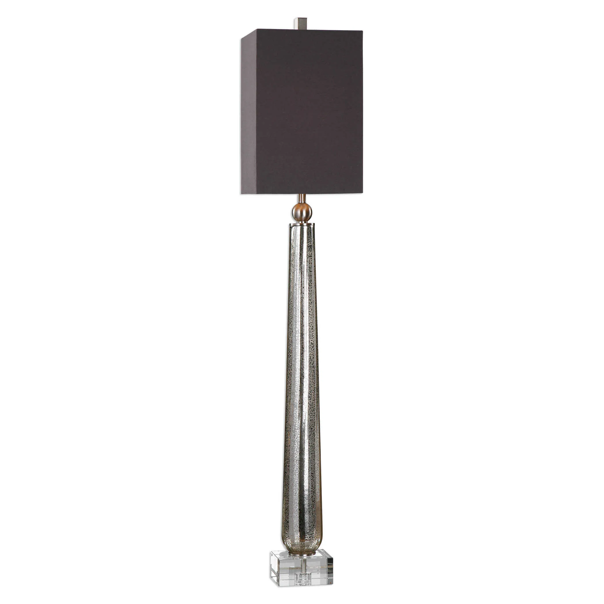 Tall tapered mercury glass with a subtle ribbed texture accented with brushed nickel plated details and a crystal foot. The square hardback shade features charcoal gray linen fabric with natural slubbing. 54H, Shade 15H X 10 Dia. (in)