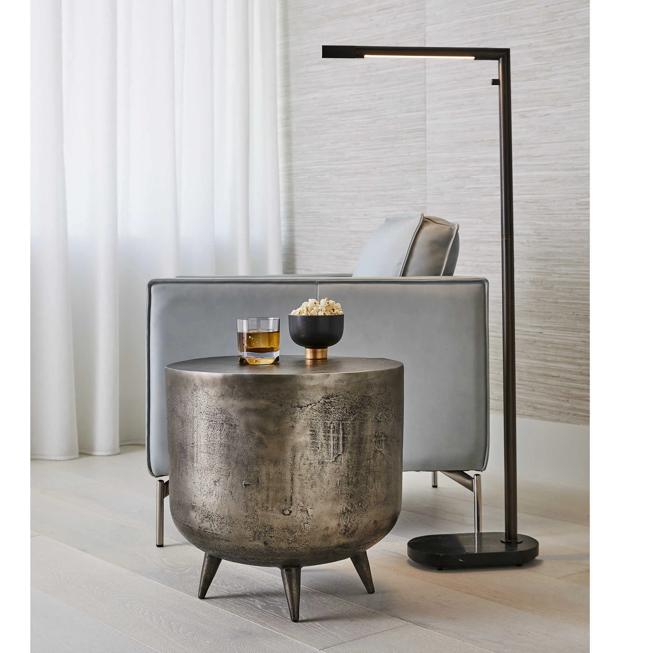 The sleek and minimalist design of the Highlight Floor Lamp is perfect when you need a lot of light but have limited space. Finished in an antique brass, both the post and LED arm are multi-directional and can independently rotate 350 degrees. The post is built to a height for reading by a sofa or chair and contains a knurled rotary dimmer directly underneath the arm. The capsule-shaped alabaster base can be easily rotated and tucked discreetly out of the way. The four feet were added for stabilization on carpet and allow cord control from any direction. The LED light is an integrated light system - no bulb required. Produces 54,000 estimated hours of illumination.