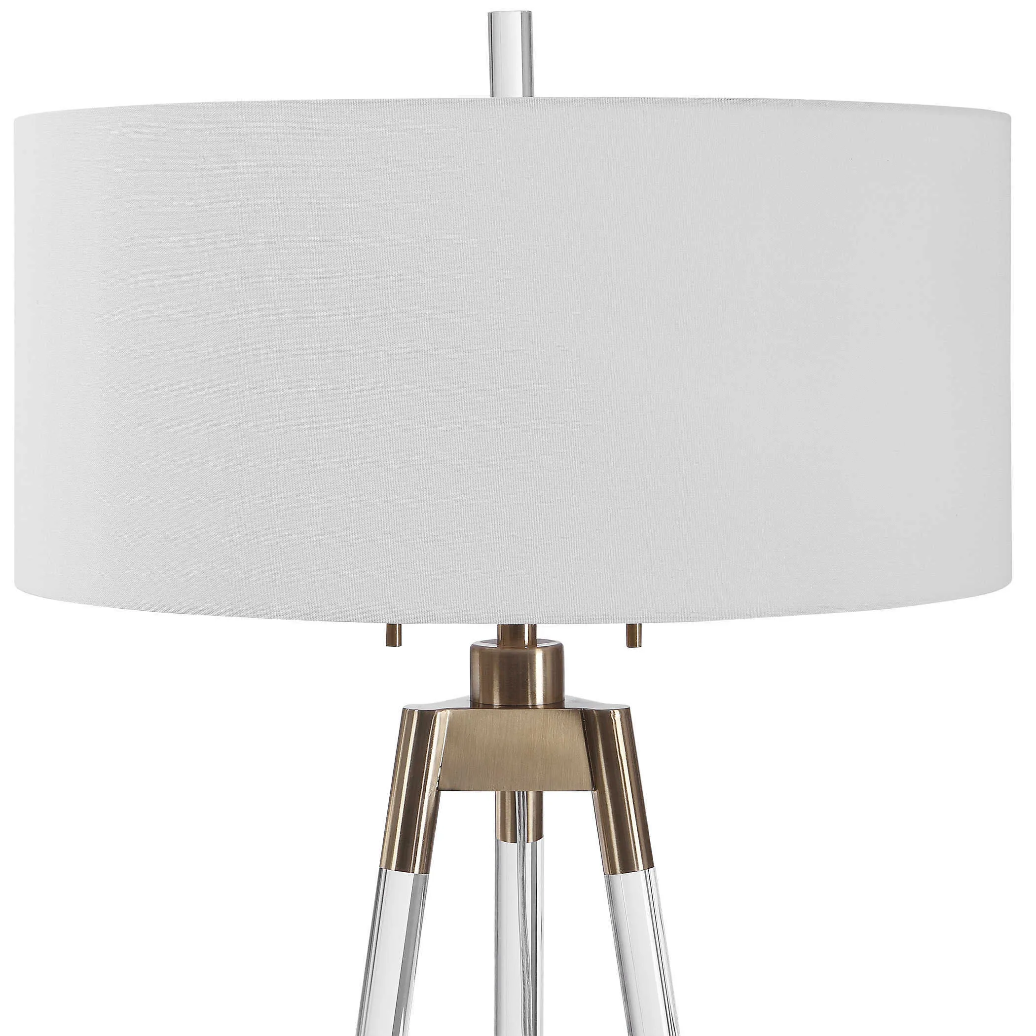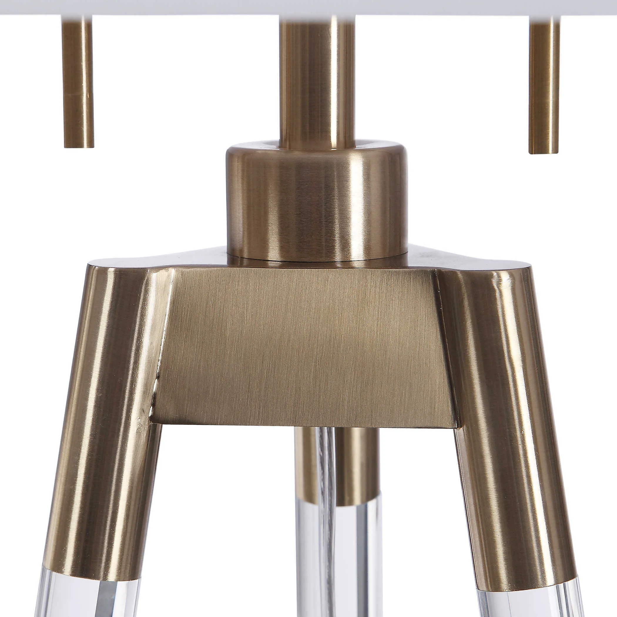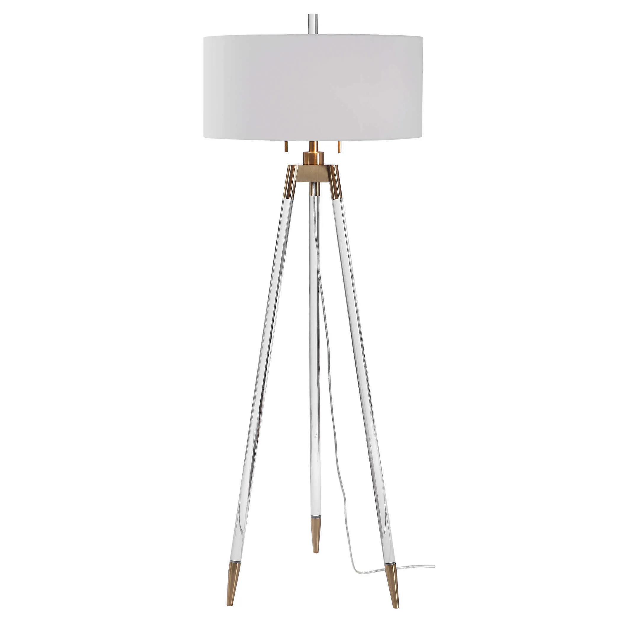 An elegant take on tripod style lighting, this floor lamp design features clear acrylic legs with brushed brass plated foot caps and matching accents. The round hardback shade is a white linen fabric.