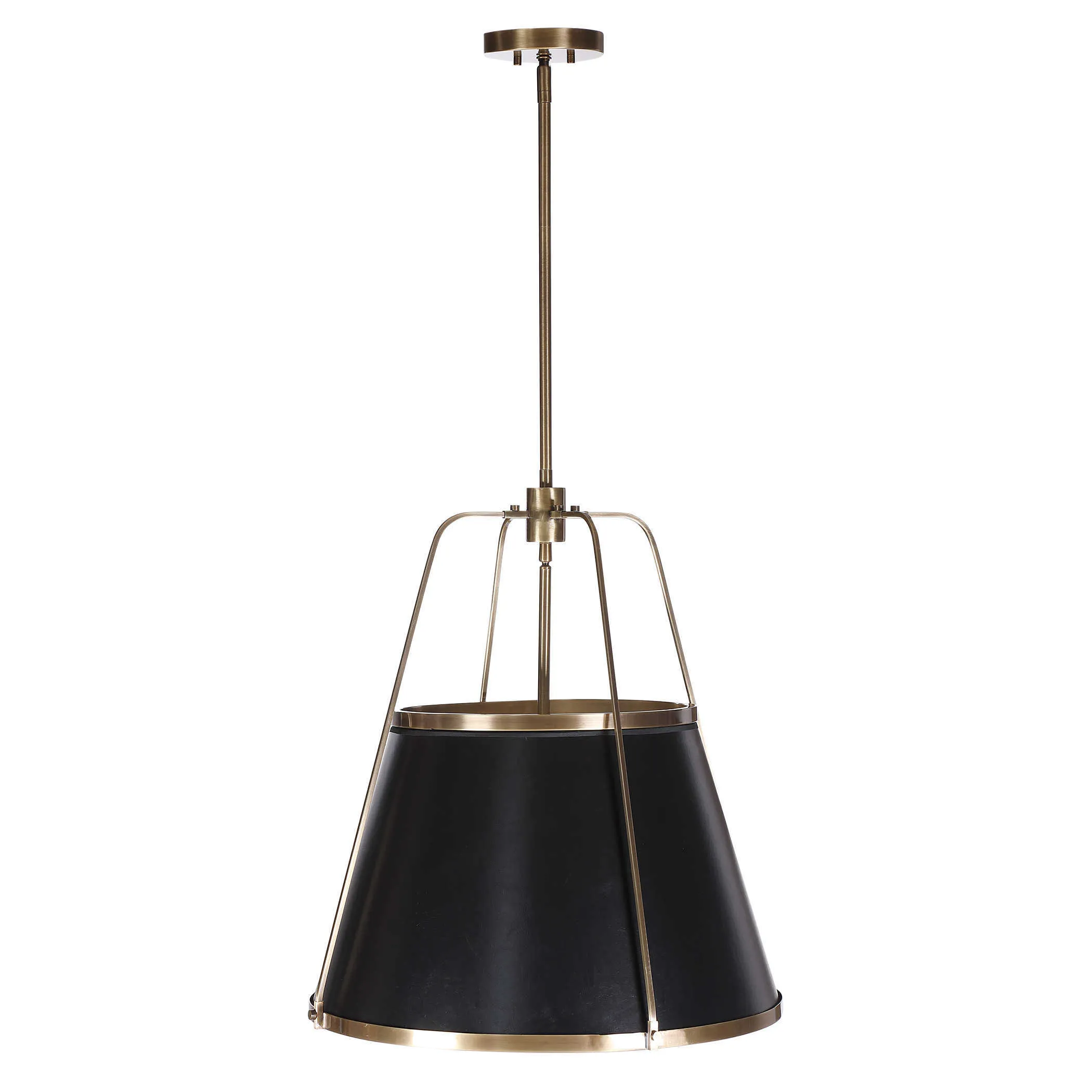 Rich classic and transitional lines come together in this 4 Lt. Pendant finished in Antique Brass with a black leather shade lined with rich white fabric. 4-60 watt max, Edison sockets. Bulbs not included. Supplied with 15' wire, 3-12" stems, and 1-6" stem for adjustable installation.