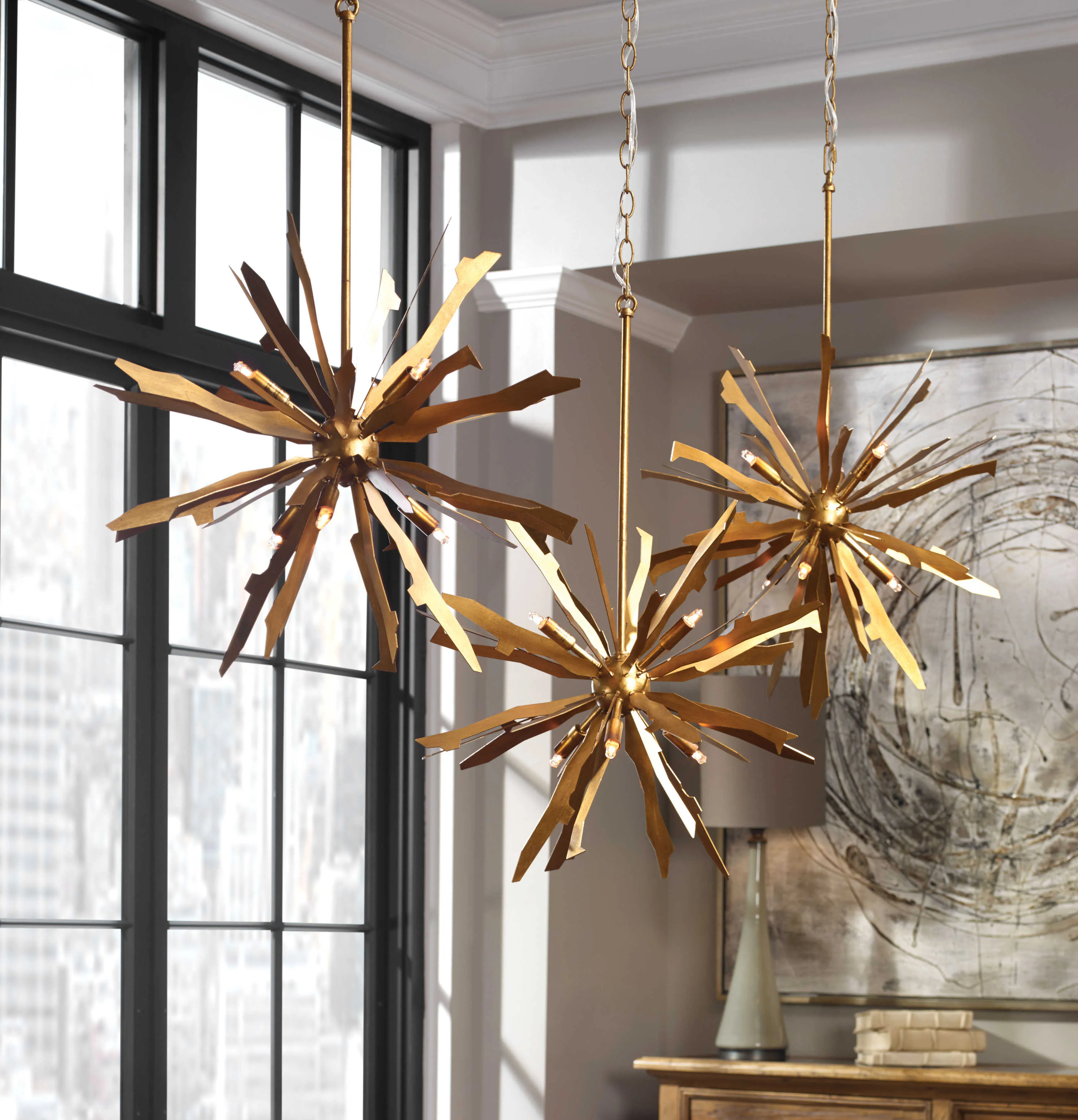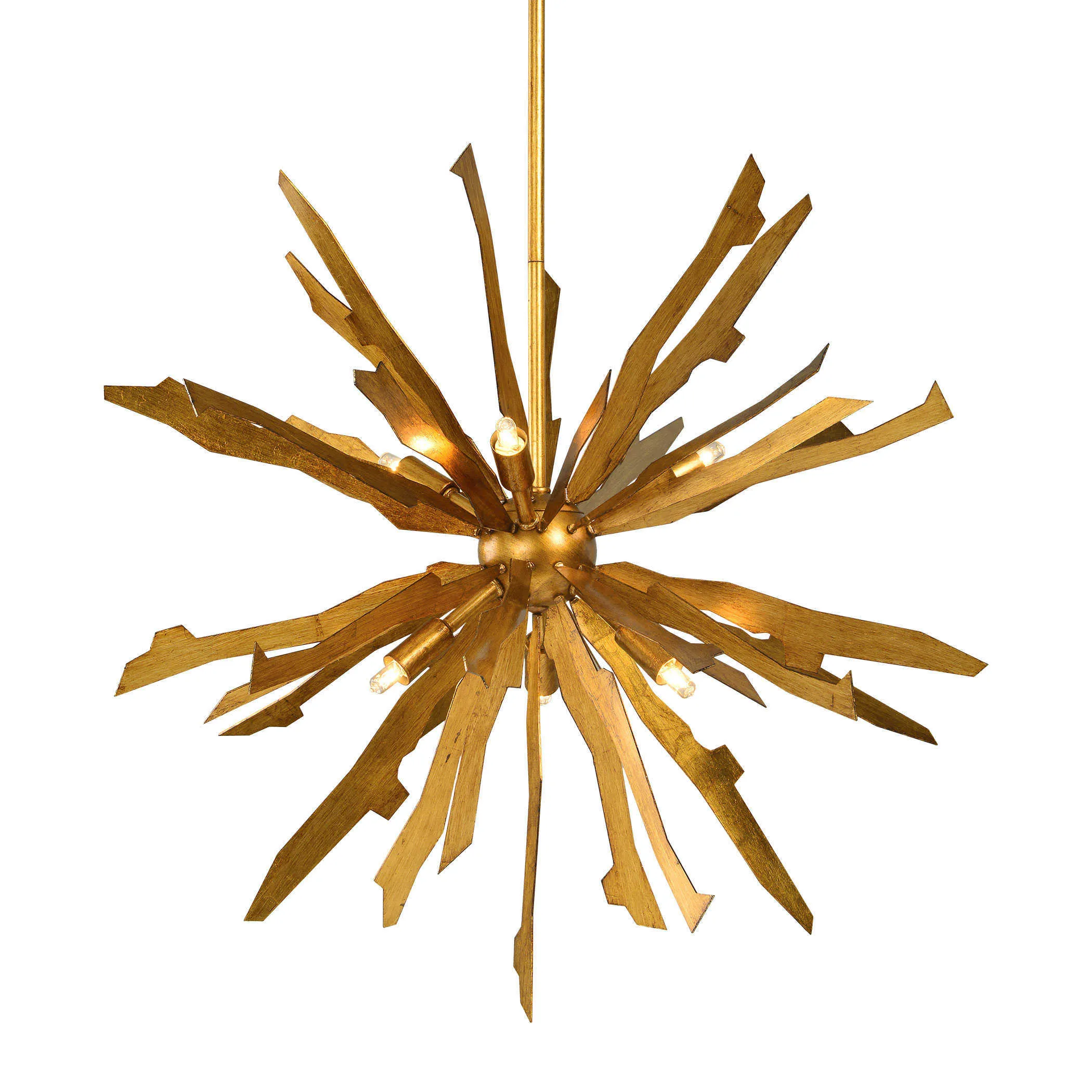 Antique gold leaf on starburst blades helps mix the mid-century feel with an old world feel giving us this great pendant. Includes 6-40w max G9 sockets. Supplied with 15' wire & 5' chain for adjustable installation.