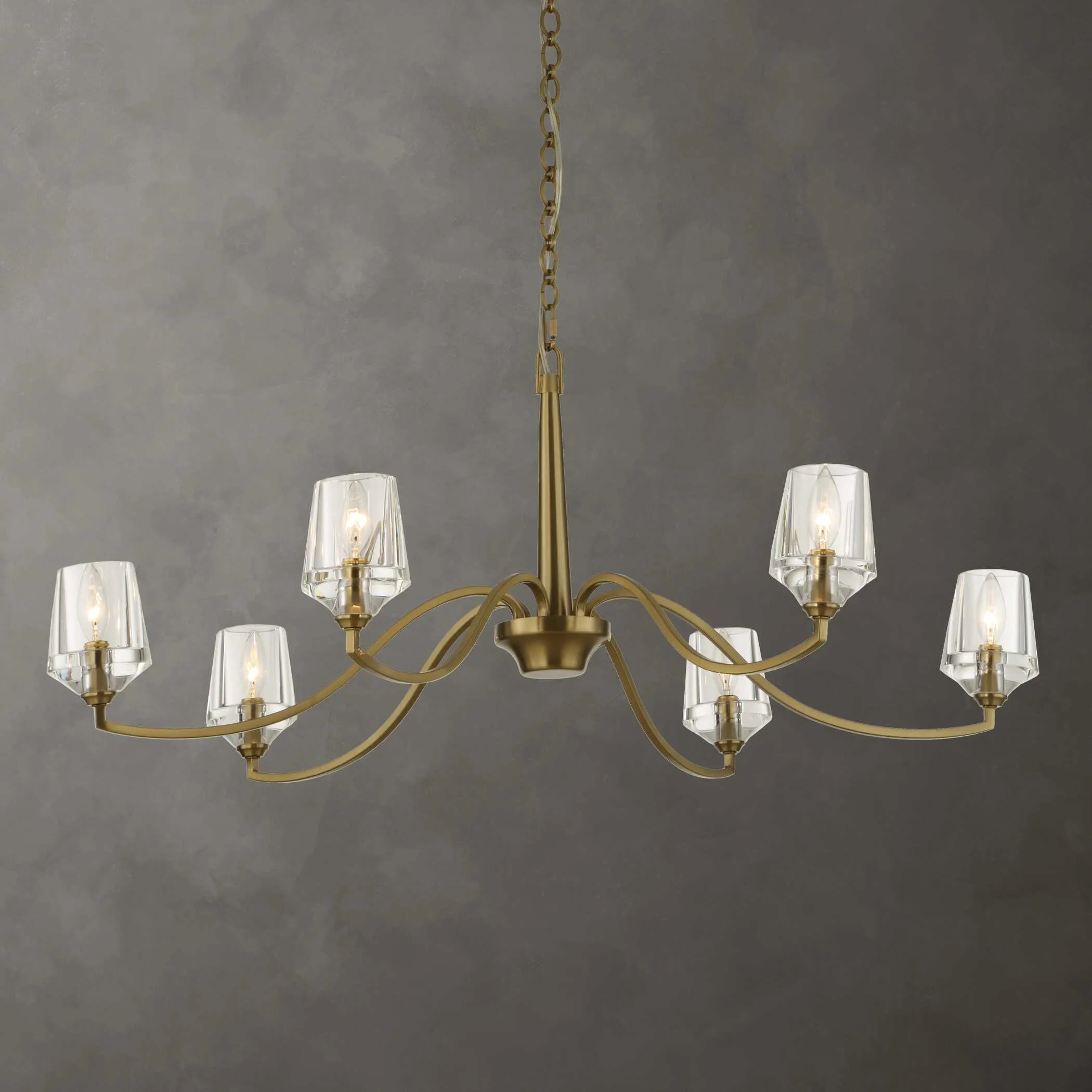 Sparkling Modern Elegance Best Describes The Modern Crystal Shades On This Sleek Oversized 6 Lt. Chandelier In A Warm Natural Brass Finish. 6-60 Watt Max Candelabra Sockets. Bulbs Not Included. Supplied With 20' Wire, 7' Specialty Decorative Chain For Adjustable Installation.