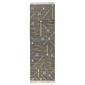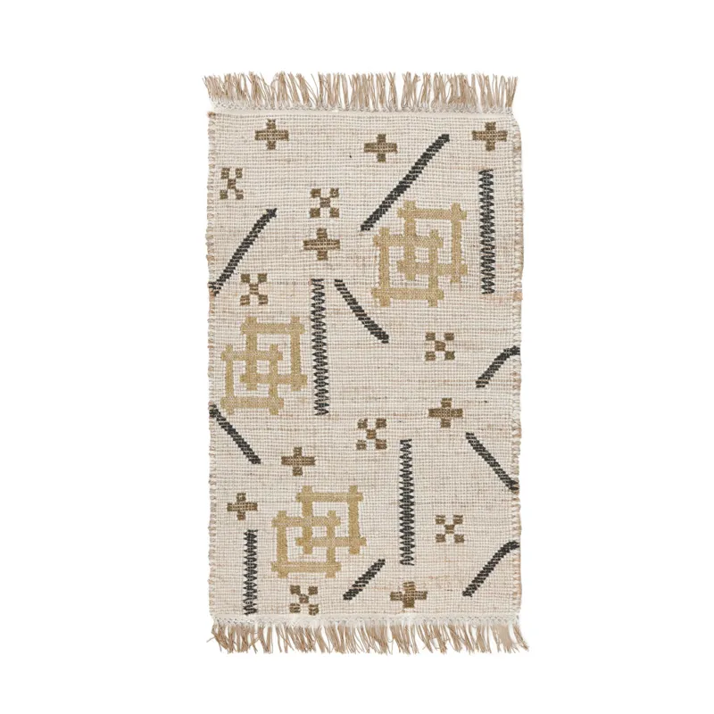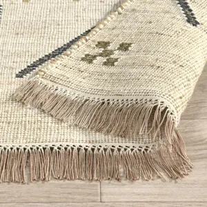 Reminiscent of traditional patterns, this handwoven rug features a sustainable blend of wool, jute, and cotton. Dyed cotton fringe softens each edge while contrasting, natural hues bring an organic vibe to the geometric pattern.