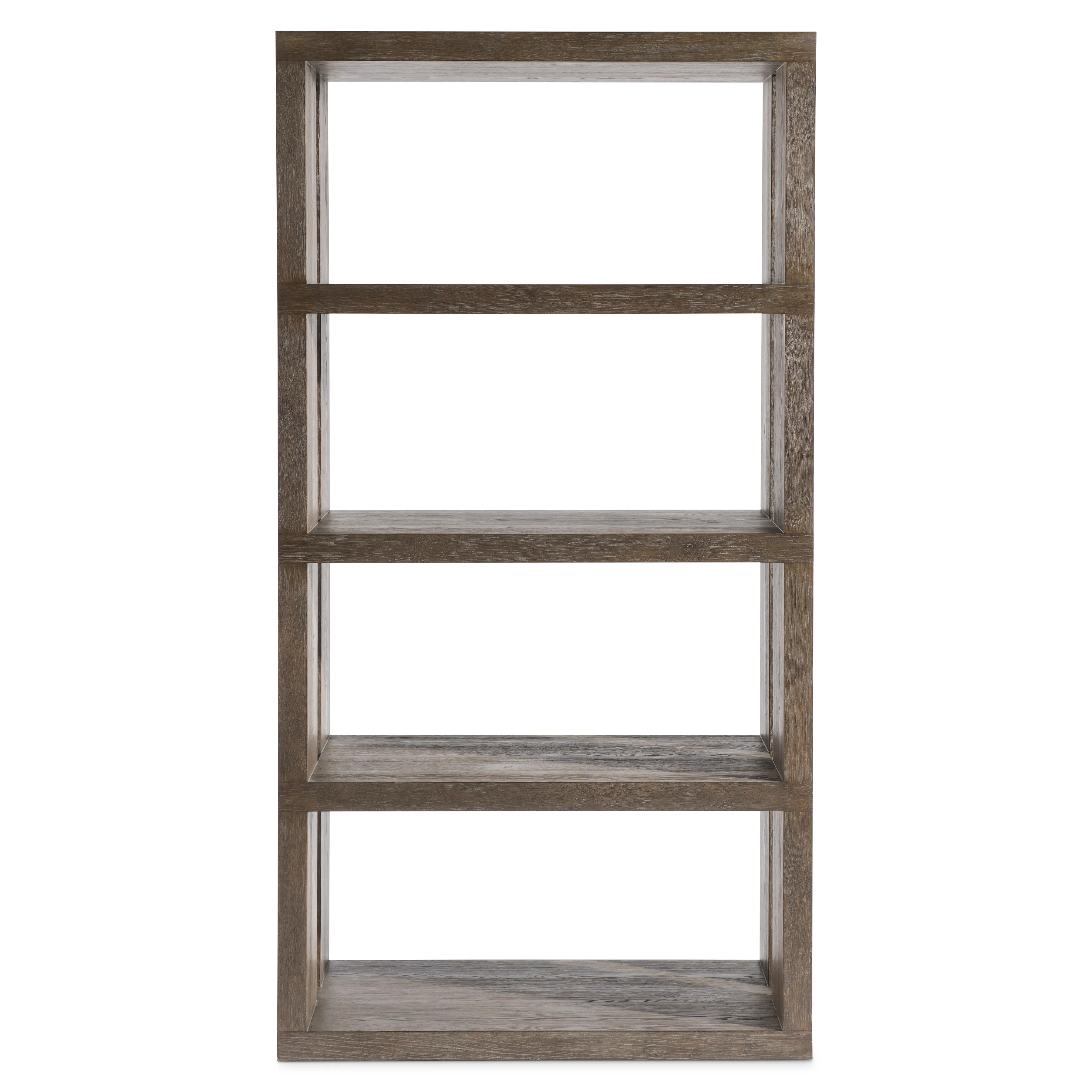 Wirebrushed Oak Etagere with four fixed shelves in Cassel finish. Adjustable glides. Anti-tip kit.