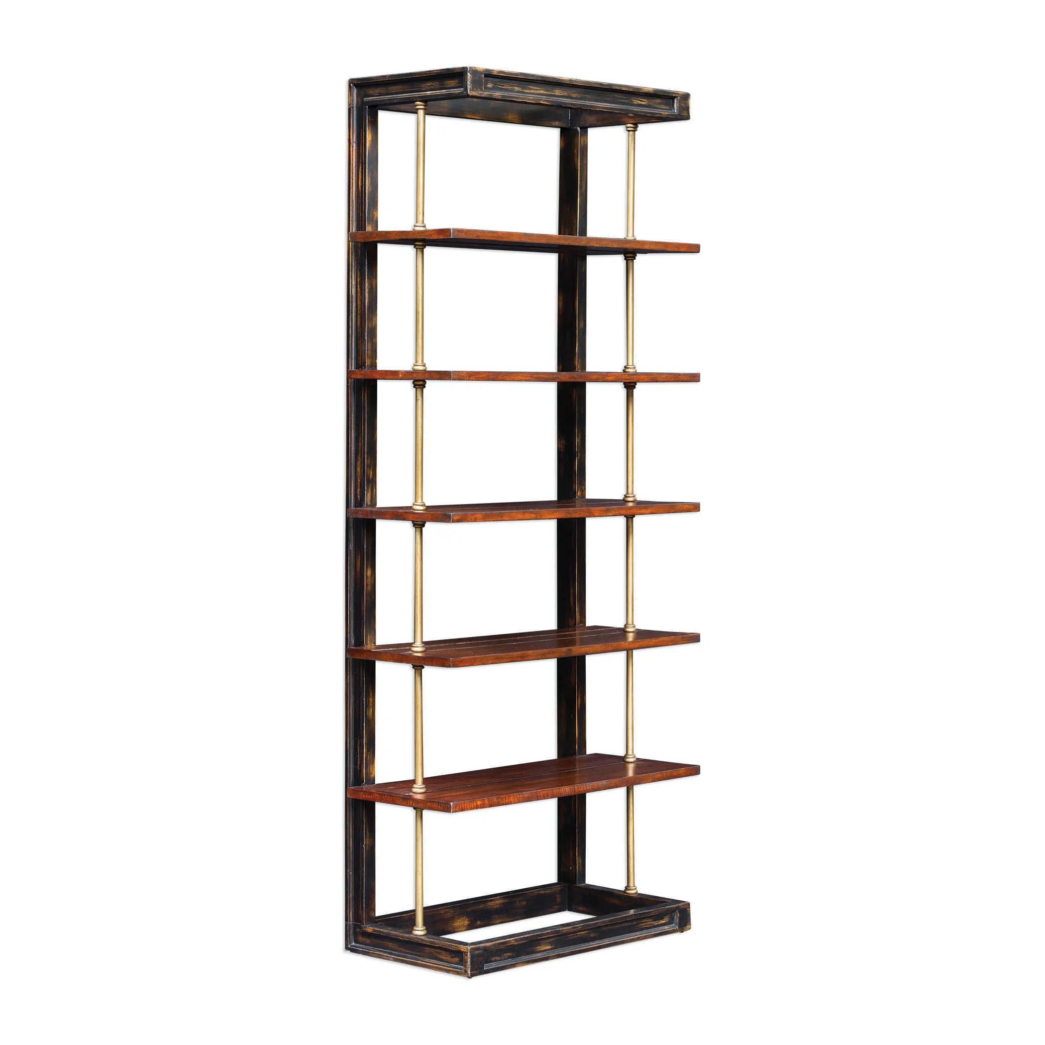 Antique brass finished iron support rods suspend dark honey stained display shelves, encased in an open style mango wood frame, and hand rubbed in worn black with honey undertones.