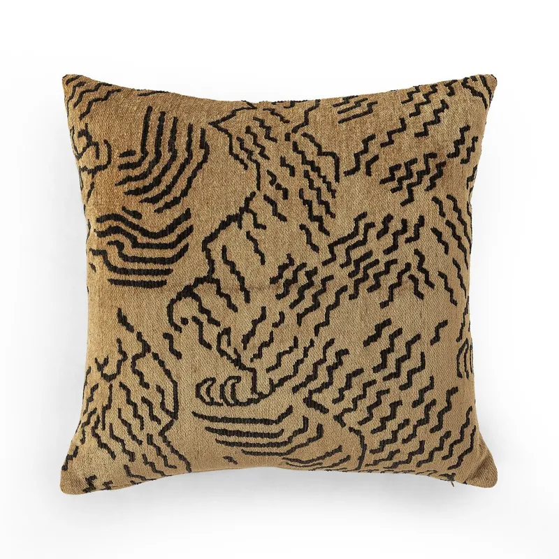 This striking throw pillow is upholstered in an abstract, Tibetan-inspired landscape motif, woven from soft chenille yarns with subtle texture for added depth, dimension and drama.