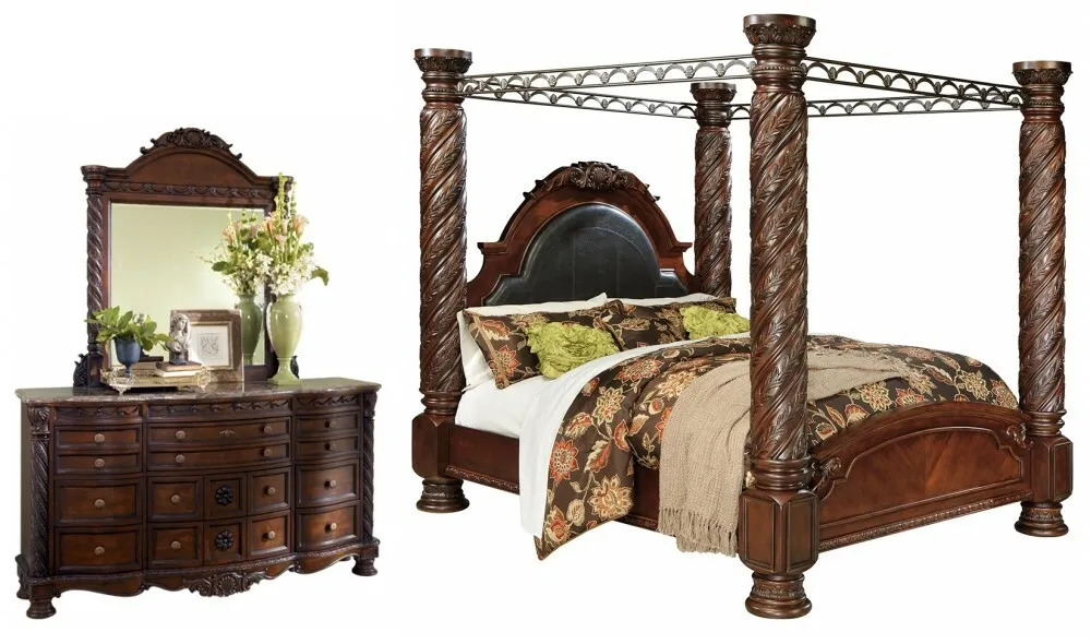 North Shore King Poster Bed with Canopy: Inspired by the grandeur and grace of Old World traditional style, this king canopy bed is nothing short of stunning. A choice blend of materials is accented by detailed ornamental appliques. Large-scale decorative pilasters and a sweeping canopy make a grand stance. Mattress and foundation/box spring sold separately.