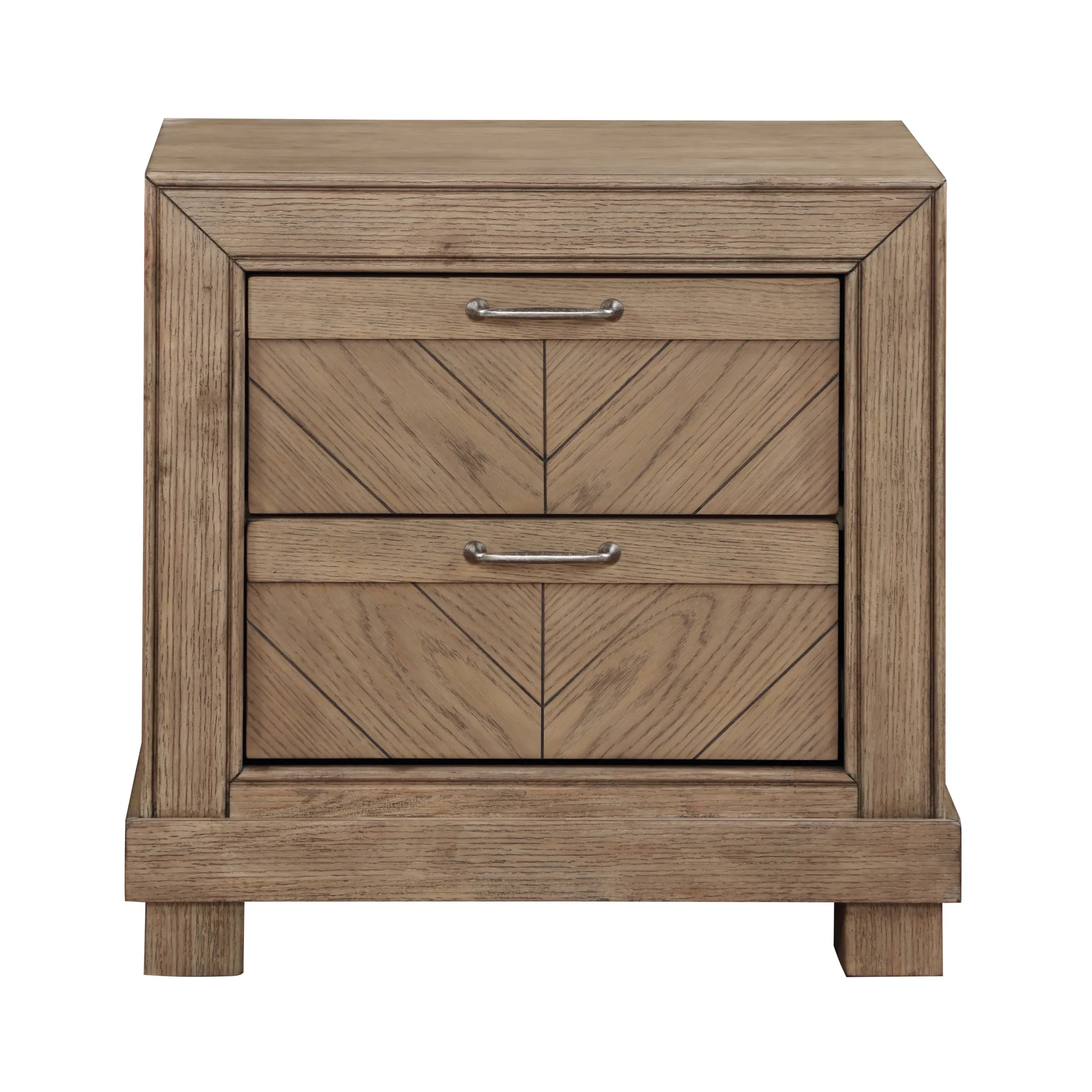 Rustic charm meets California Casual style in the Montana Sand 3-Piece Queen Bedroom Set. Finished in a weathered sand stain with satin nickel hardware, this set brings a relaxed, refined aesthetic to any bedroom. The Queen Bed features a bold chevron-patterned headboard, adding texture and character to its rustic appeal. The included Nightstands offer fully extendable deep drawers, providing ample storage while maintaining a clean, streamlined look. This 3-piece set includes a Queen Bed and two Nightstands, creating a stylish and functional retreat for any home.