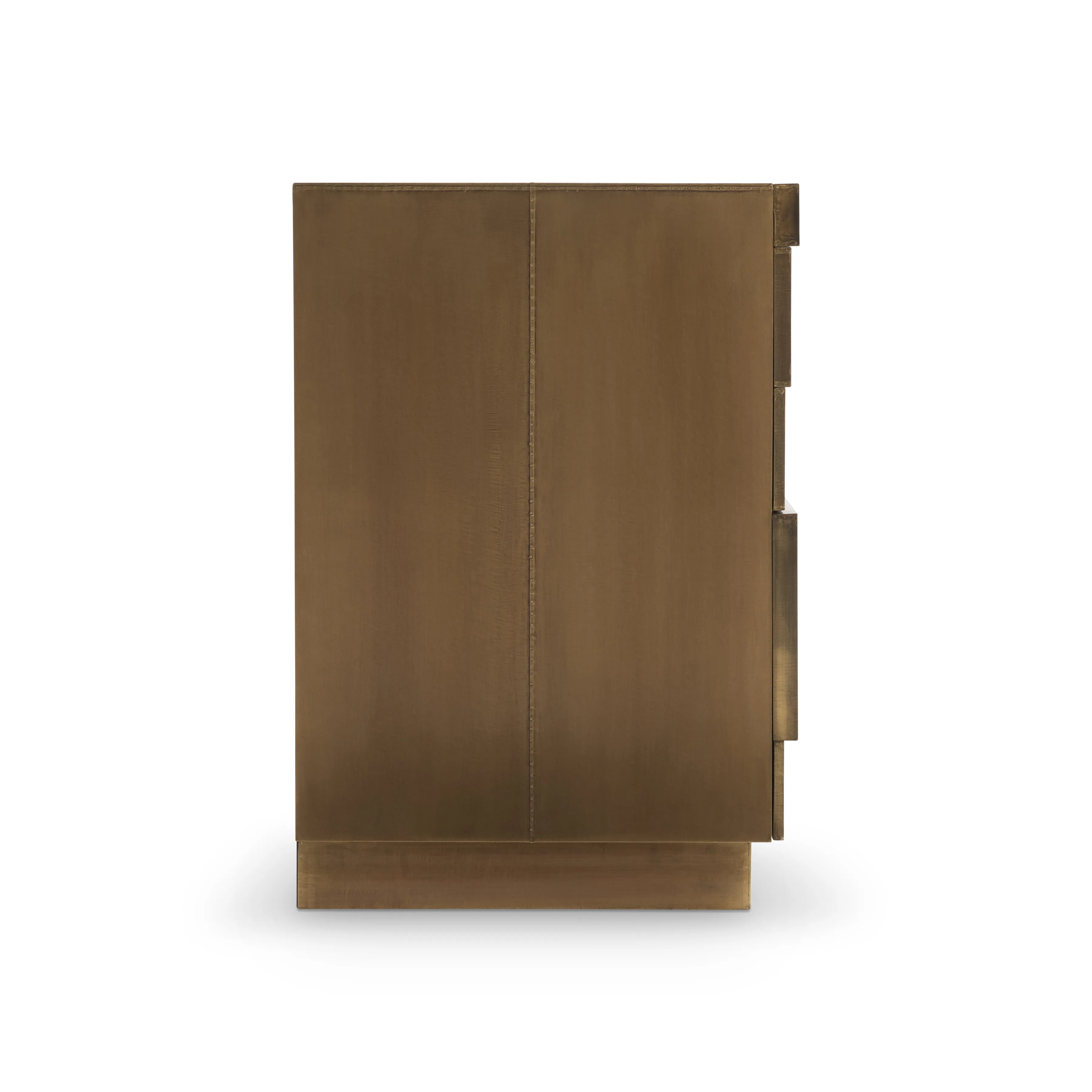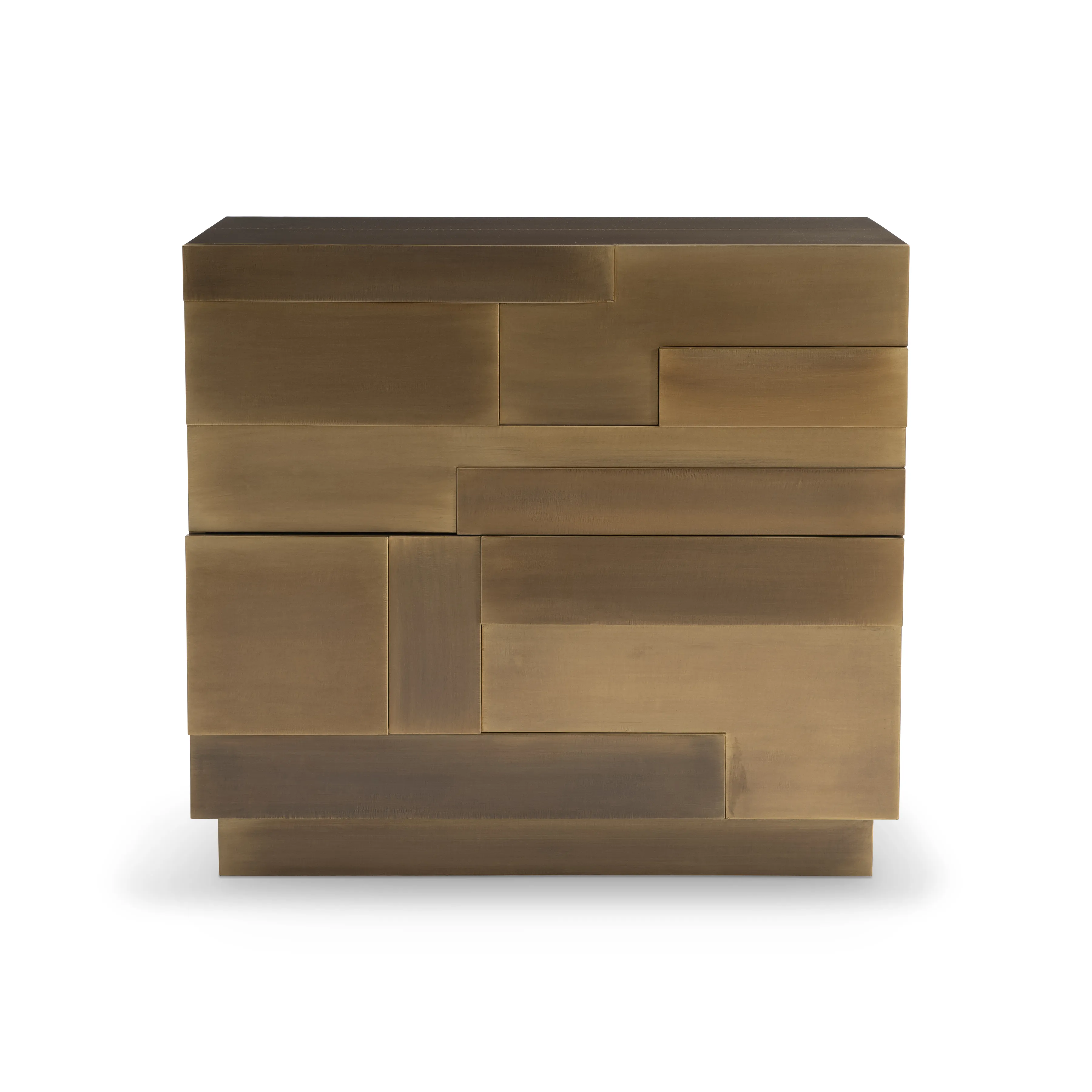 - Brass-clad with German silver technique in Aged Brass finish with patchwork multilevel drawer fronts