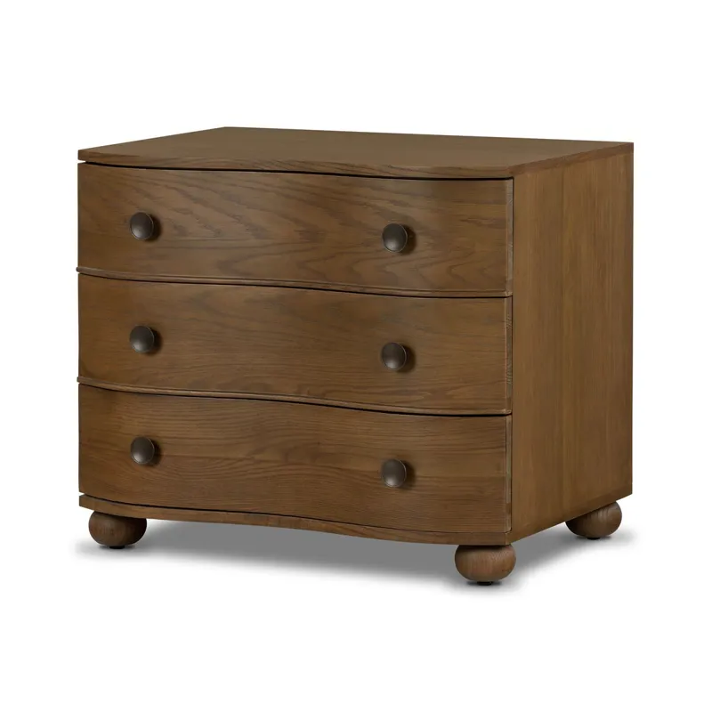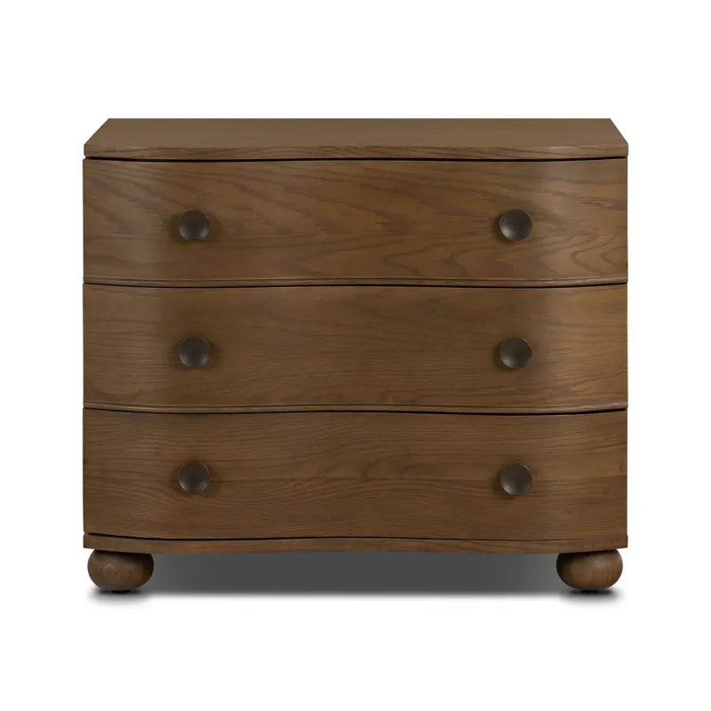 Made from solid oak and finished in a toasted oak, this three-drawer nightstand is inspired by European antiques to bring both style and storage space to the bedroom.