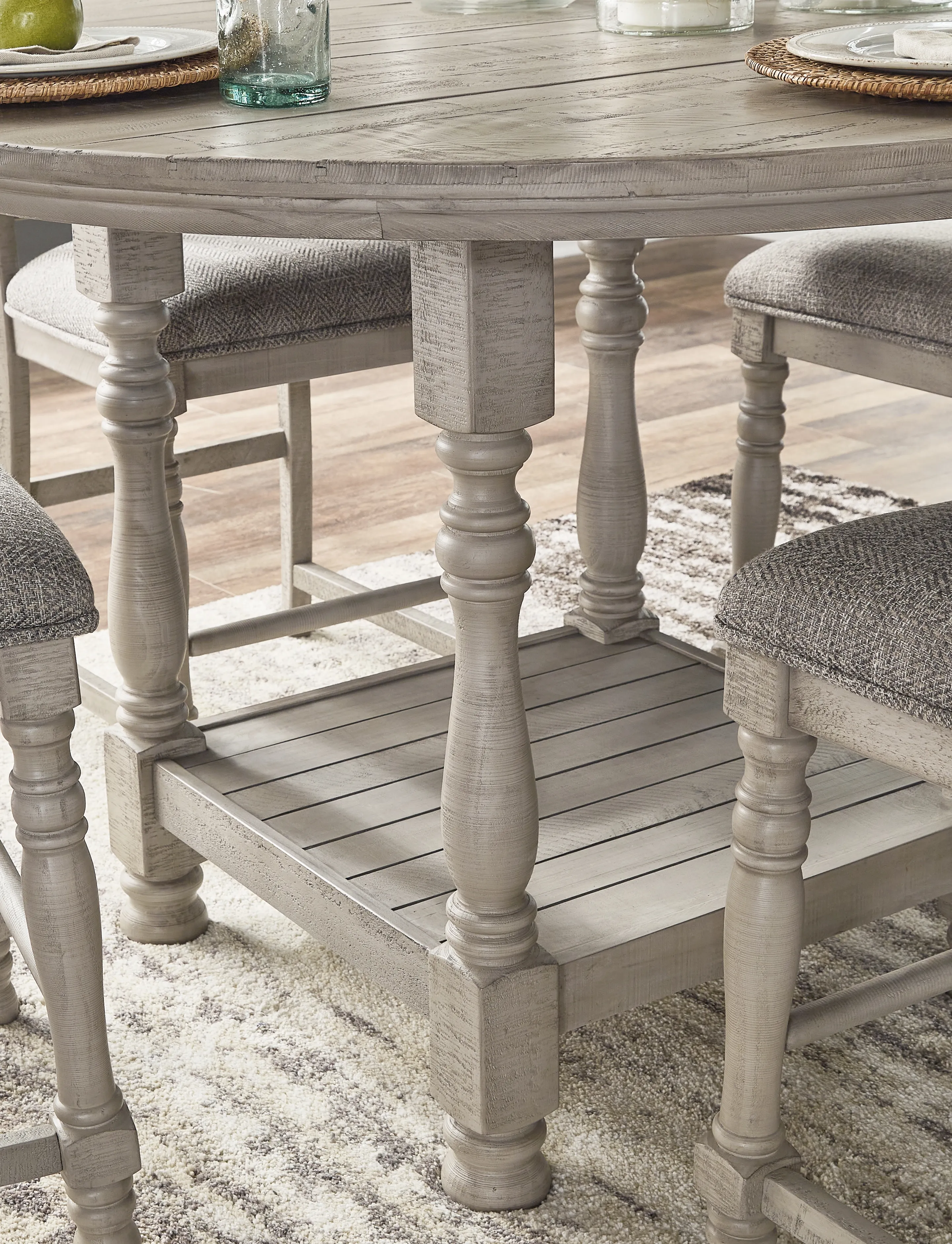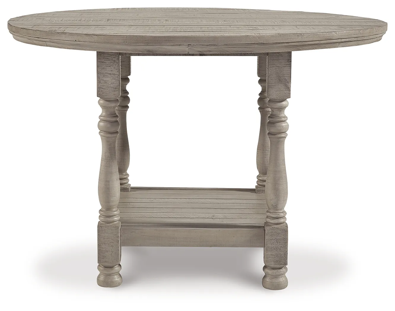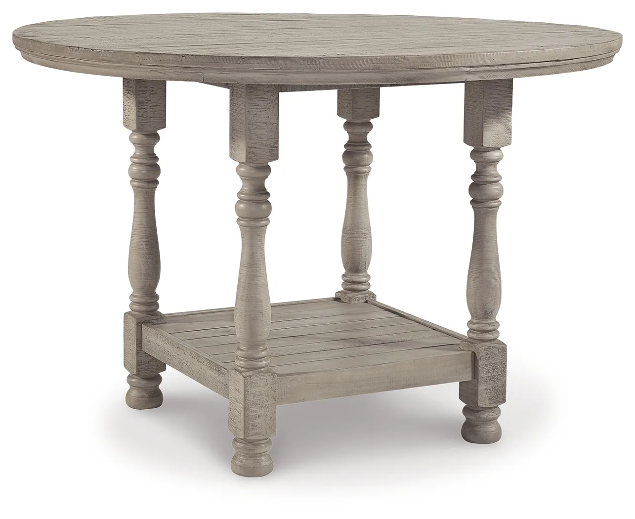 Embrace the feel of a mansion in the countryside when you revel in the romance of this round counter height table. With its detailed posts and weathered gray finish, the table has a sense of timeless beauty. A lower shelf provides a picturesque finishing touch.