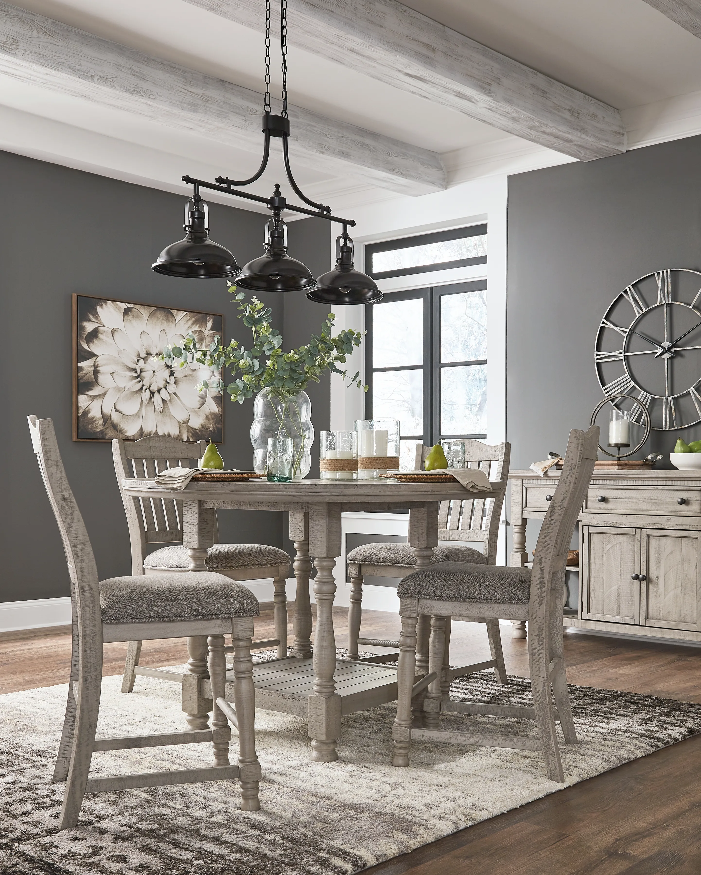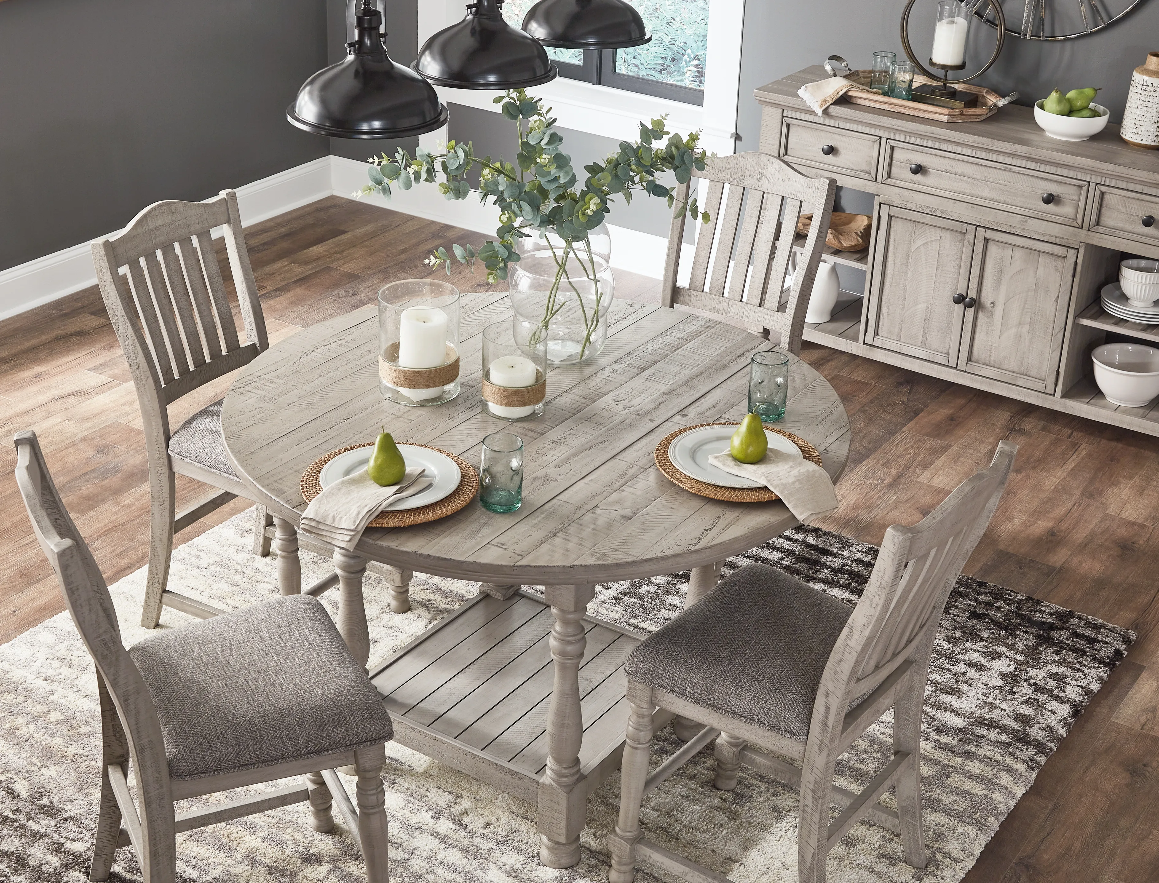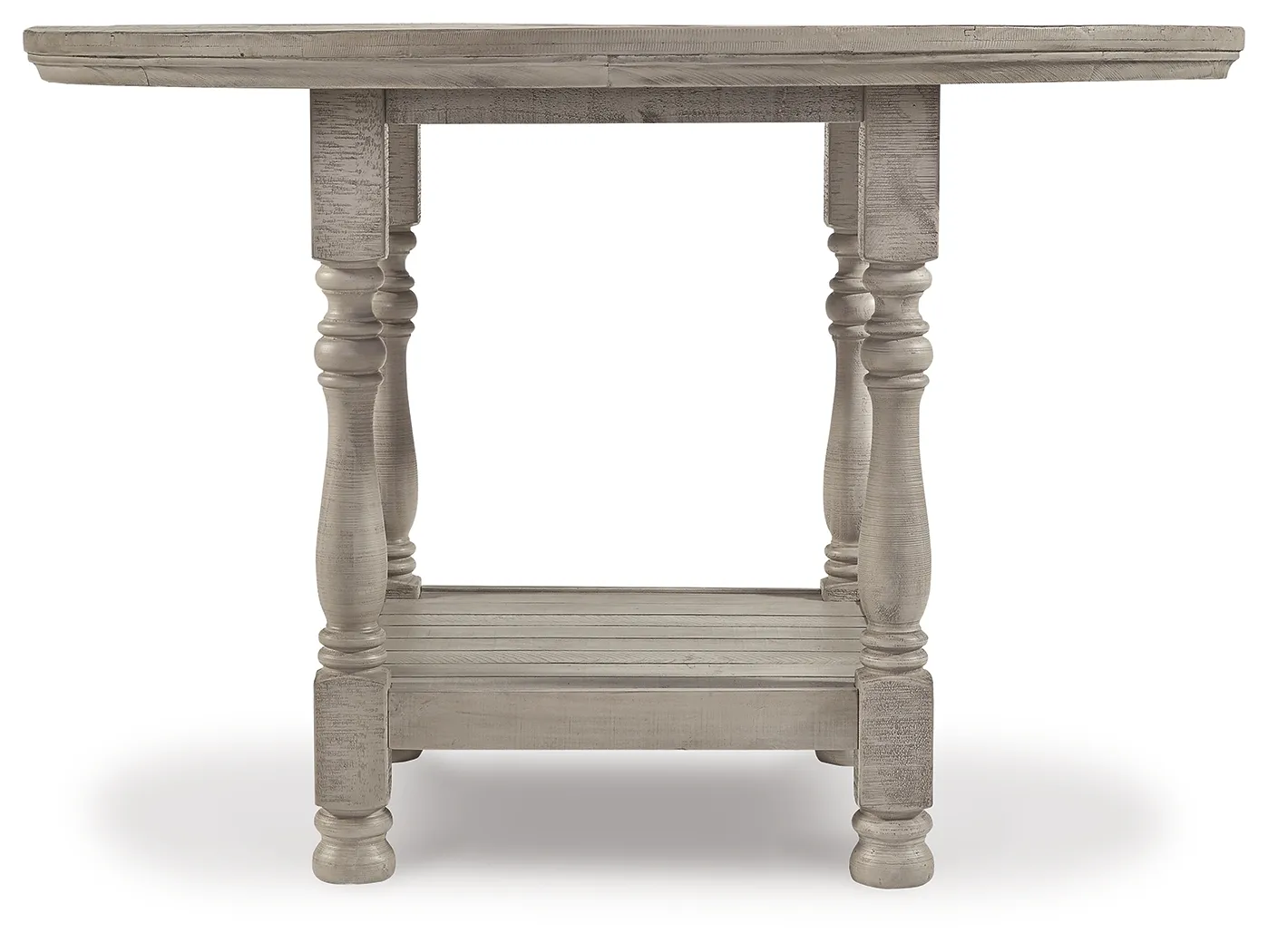 Embrace the feel of a mansion in the countryside when you revel in the romance of this round counter height table. With its detailed posts and weathered gray finish, the table has a sense of timeless beauty. A lower shelf provides a picturesque finishing touch.