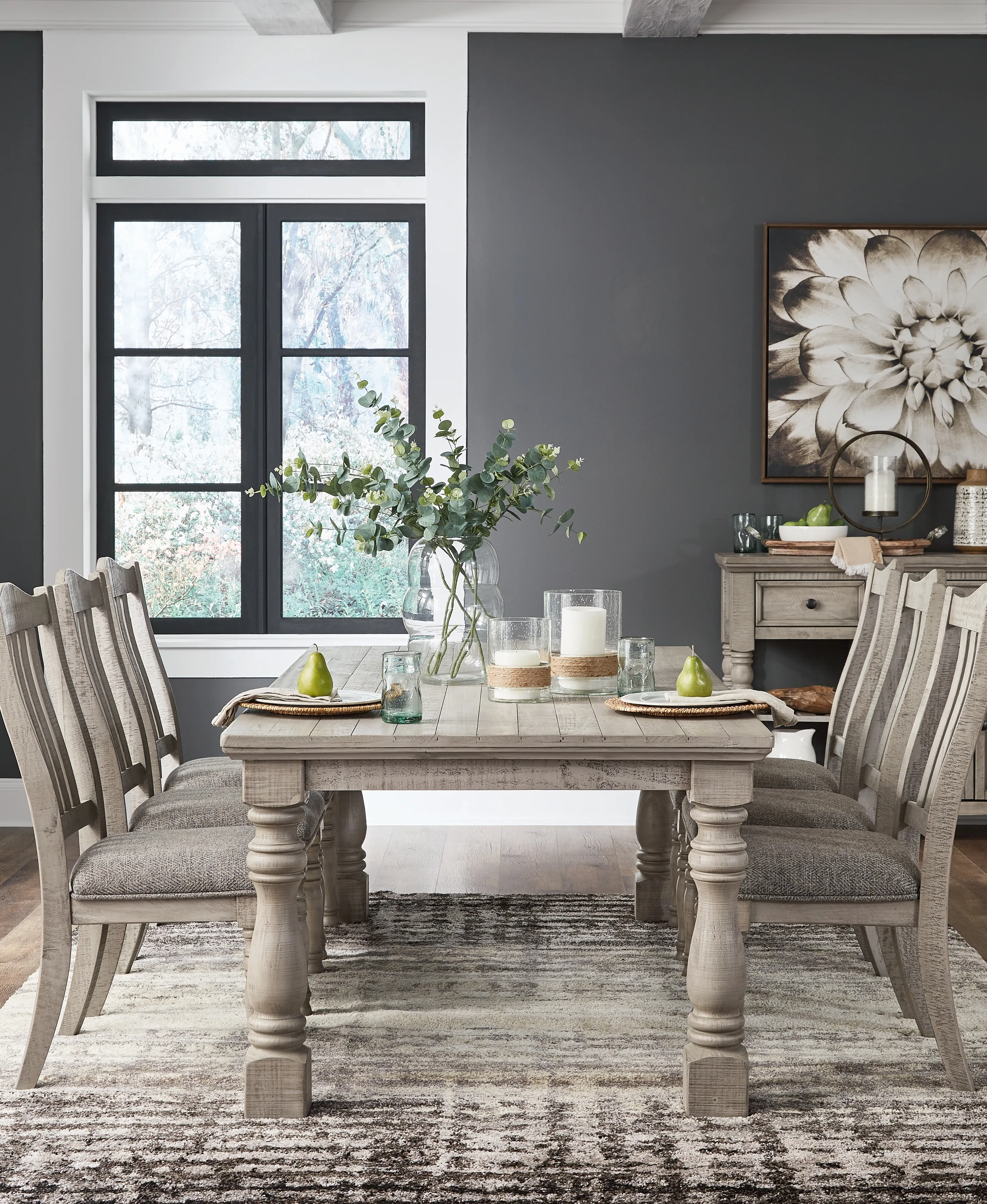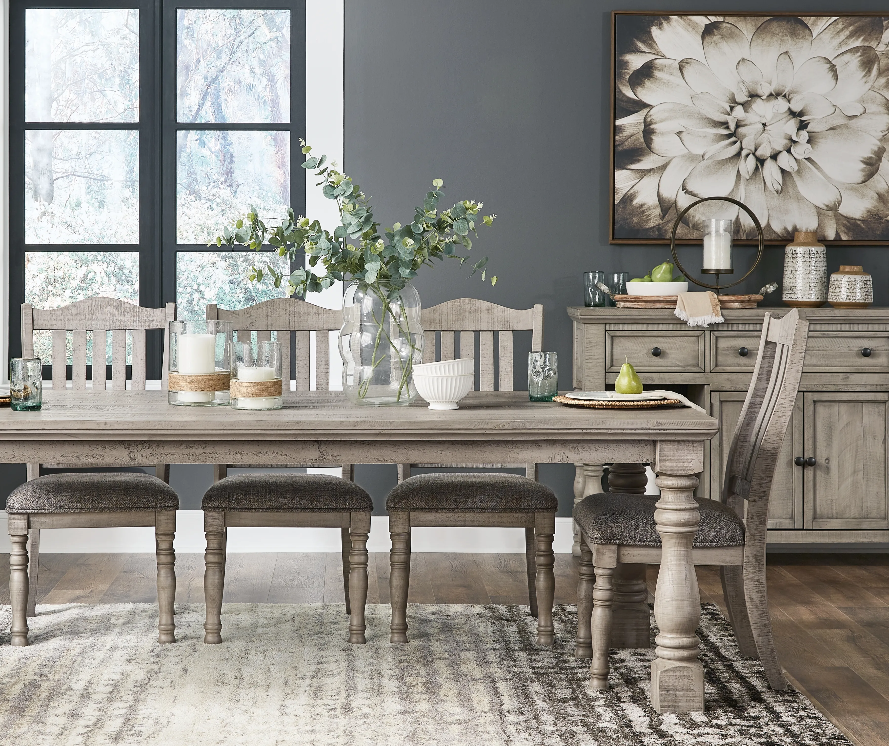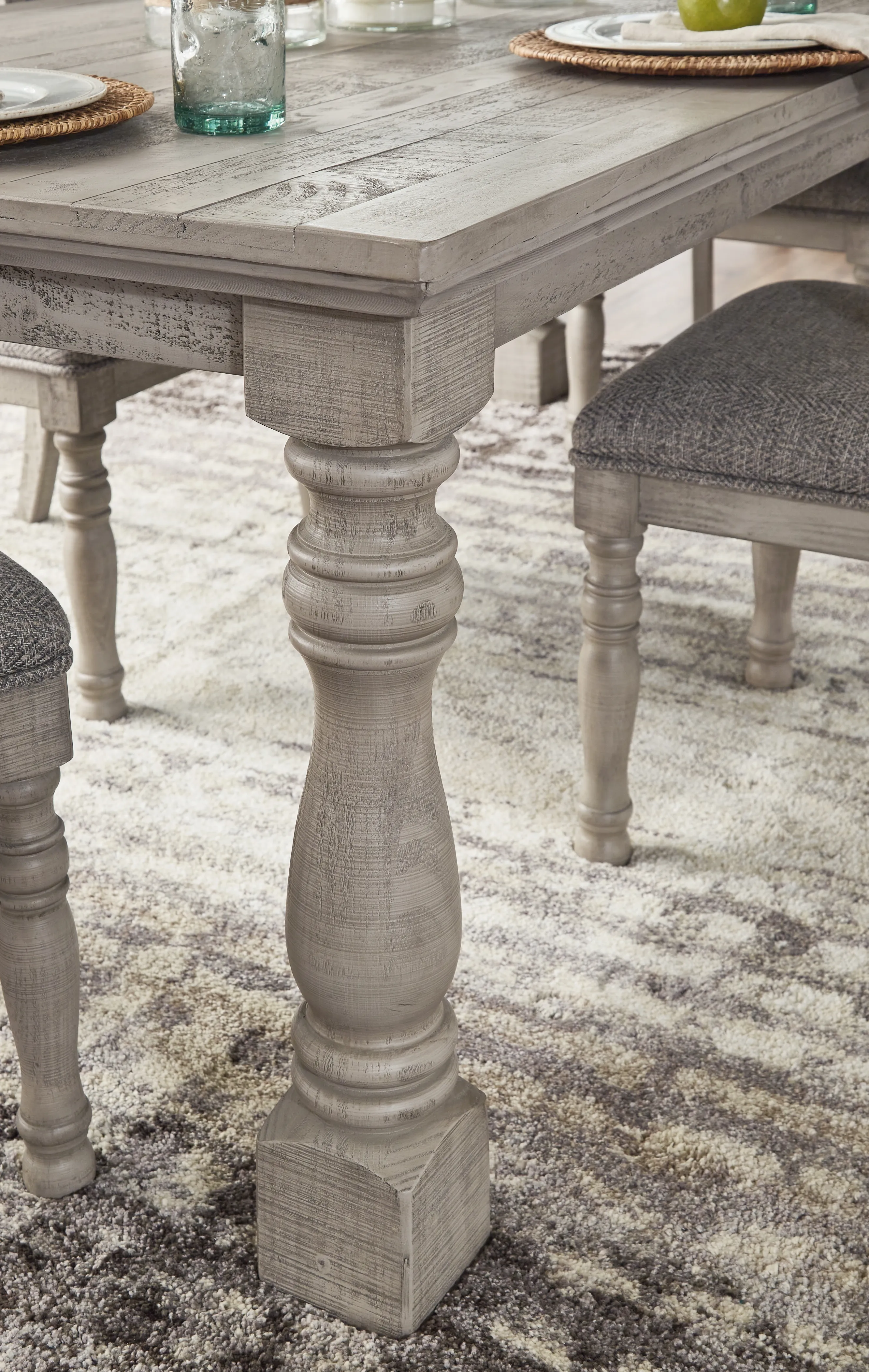 Embrace the feel of a mansion in the countryside when you revel in the romance of this rectangular dining room table. Large, turned legs and a thick planked top have a sense of stately, timeless beauty. The table’s weathered gray finish rounds out the picturesque look.