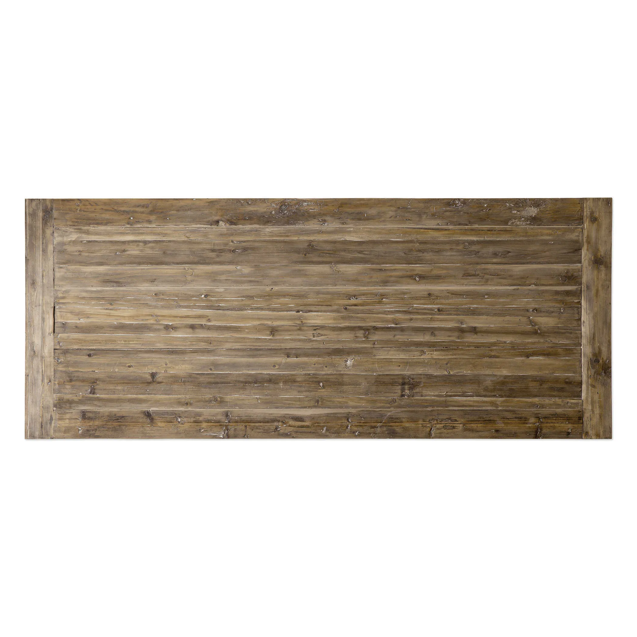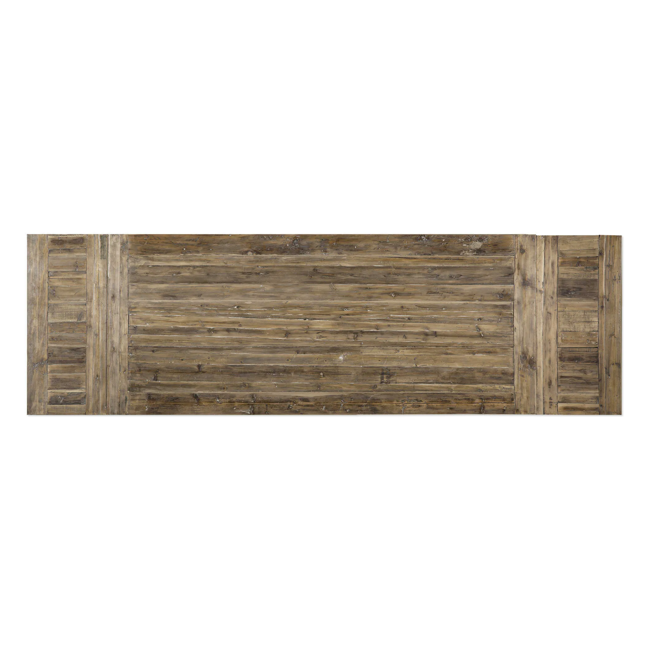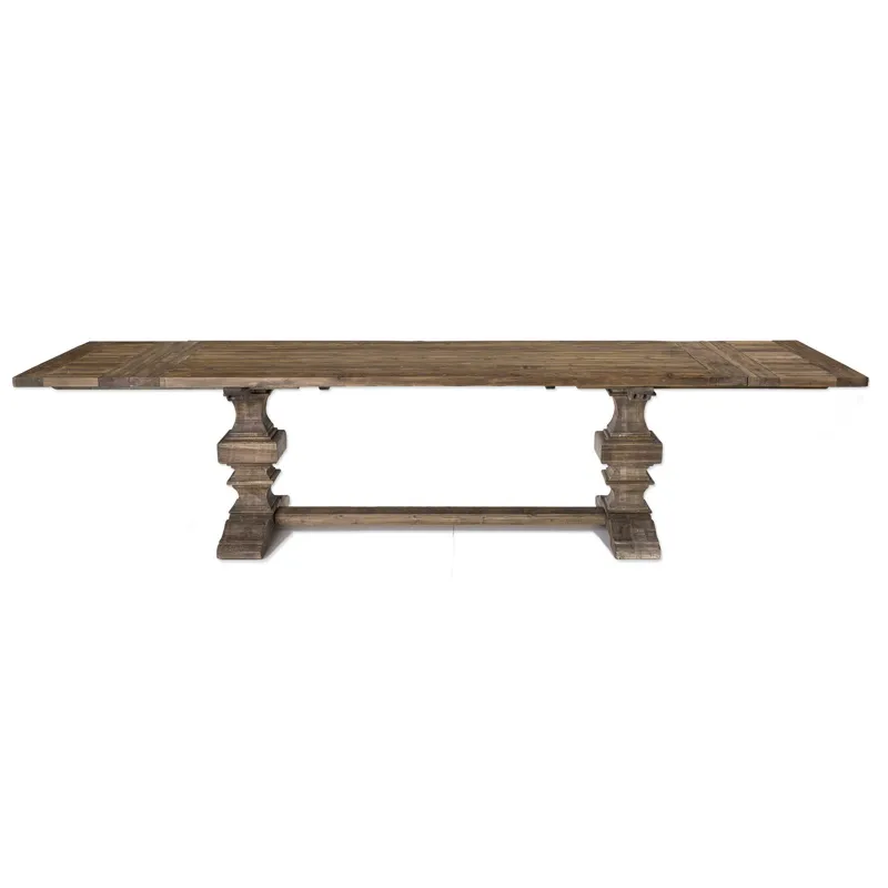Made of 100% recycled pine, this grand farmhouse table features a slatted top finished with breadboard ends, atop carved balusters, distressed and rubbed with a warm honey stain. A subtle gray wash is applied to rest in the cracks and natural recesses. Includes two 18 inch leaves that can be removed to create a 96" table. Solid wood will continue to move with temperature and humidity changes, which can result in small cracks and uneven surfaces, adding to its authenticity and character.