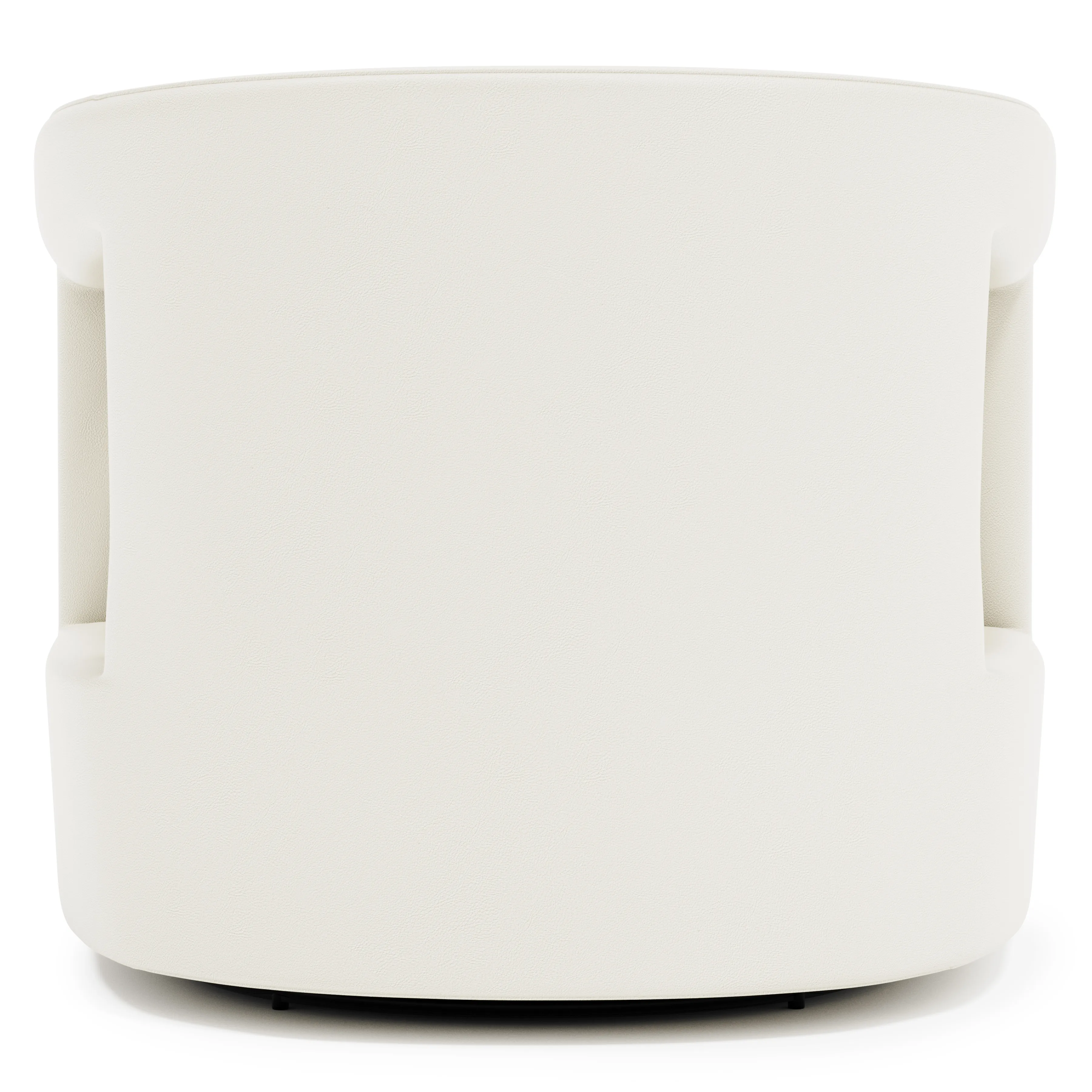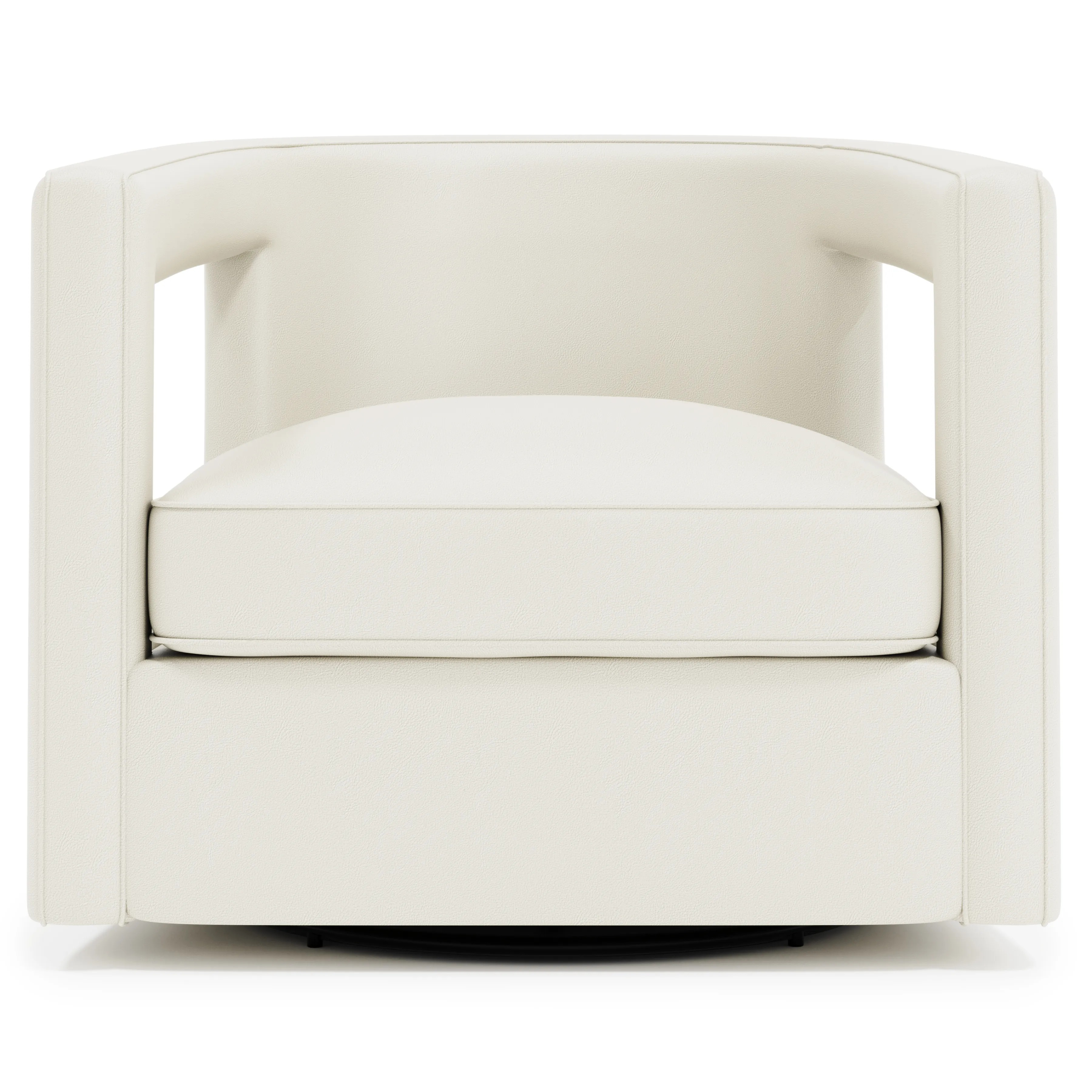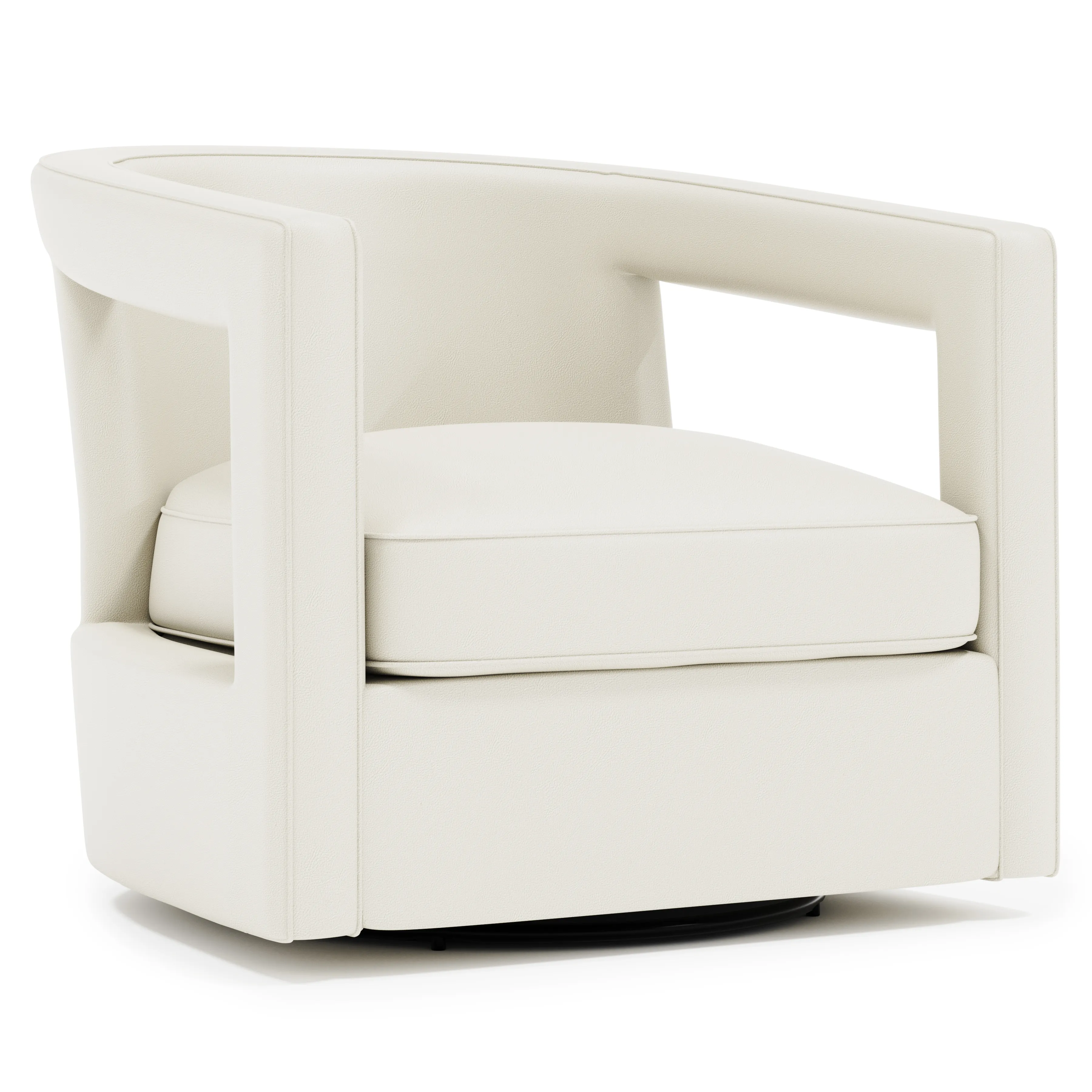 The sleek, sculptural design of the Alana leather swivel chair adds modern flair to an interior, blending seamlessly with contemporary and transitional styles. Two cutouts on either side offer a crisp, polished look. Webbing construction and spring down cushioning provide luxurious comfort and support.
