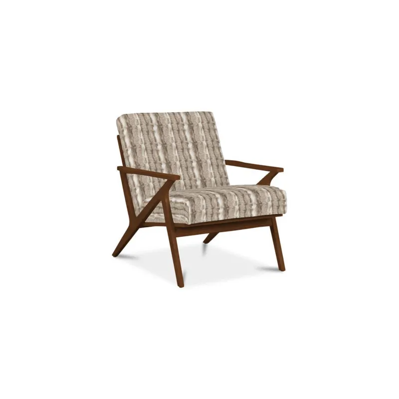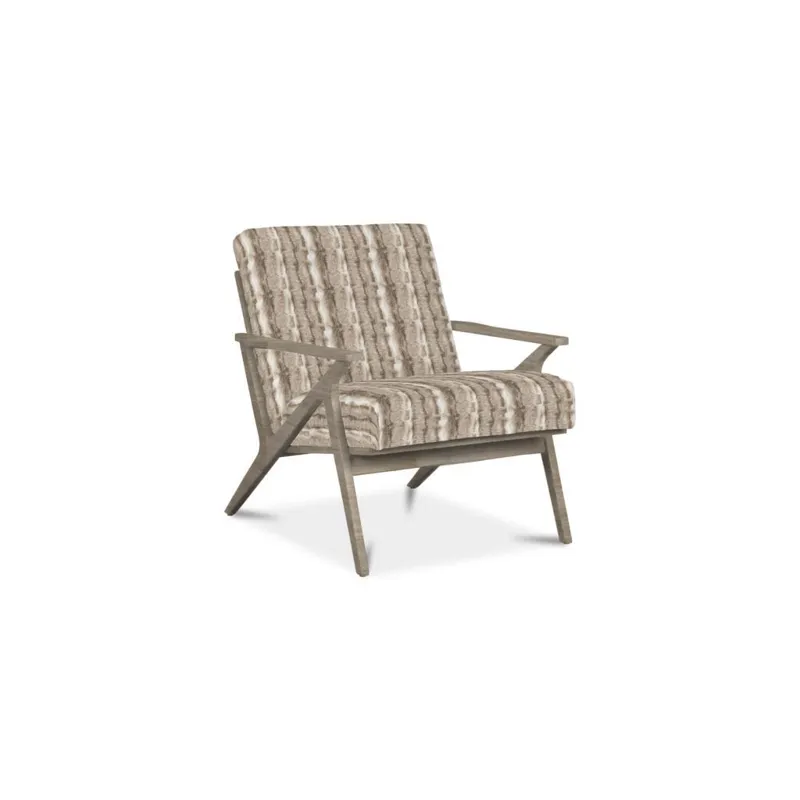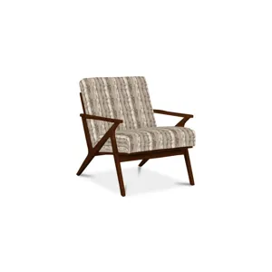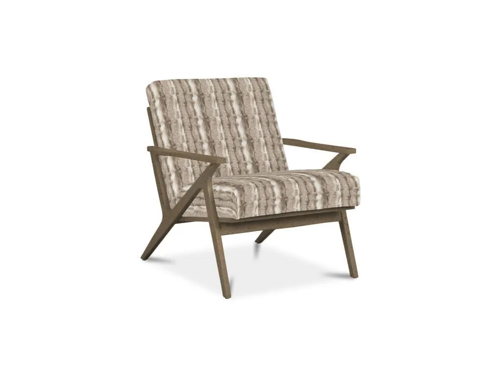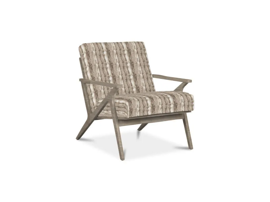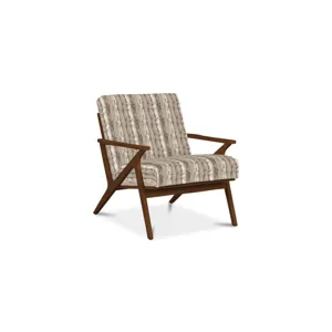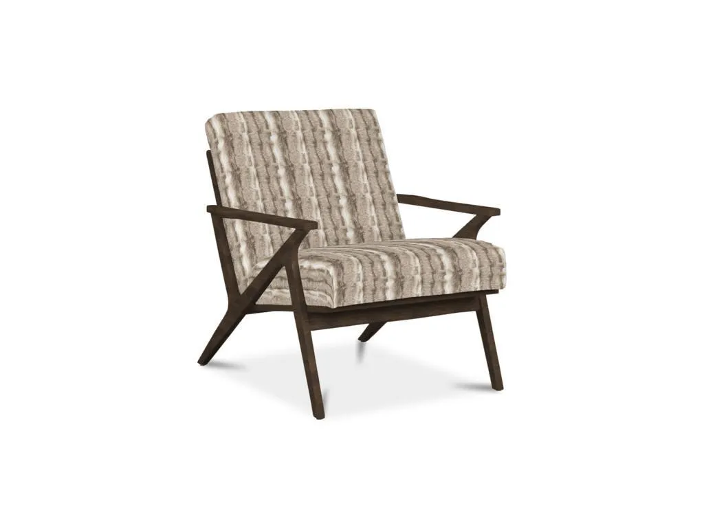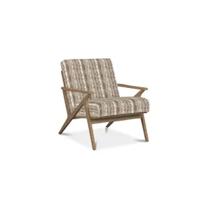 Clean lines with a nod to mid century modern styling make this chair a stand-out. It features an angular wood frame with a tight seat and back. Back of chair has vertical wood slats.