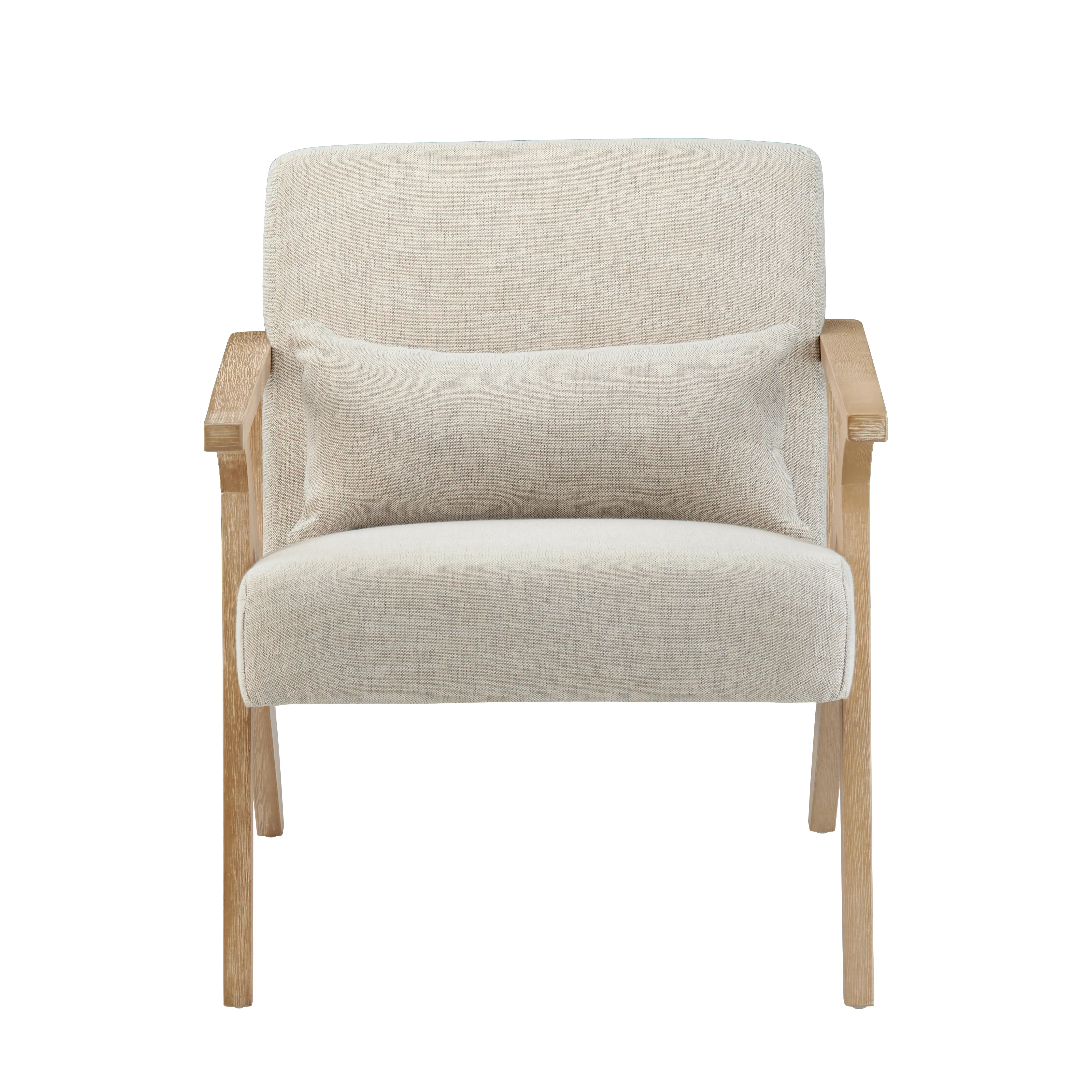 Bring relaxed Scandinavian style to any room with this mid‑century accent chair. A sculptural solid‑oak frame creates bold, angular lines while the sand‑linen cushions cradle you in laid‑back comfort. The neutral palette layers effortlessly with coastal, farmhouse, or modern decor, and a matching lumbar pillow lets you fine‑tune support whether you’re reading, streaming, or sipping an evening espresso.