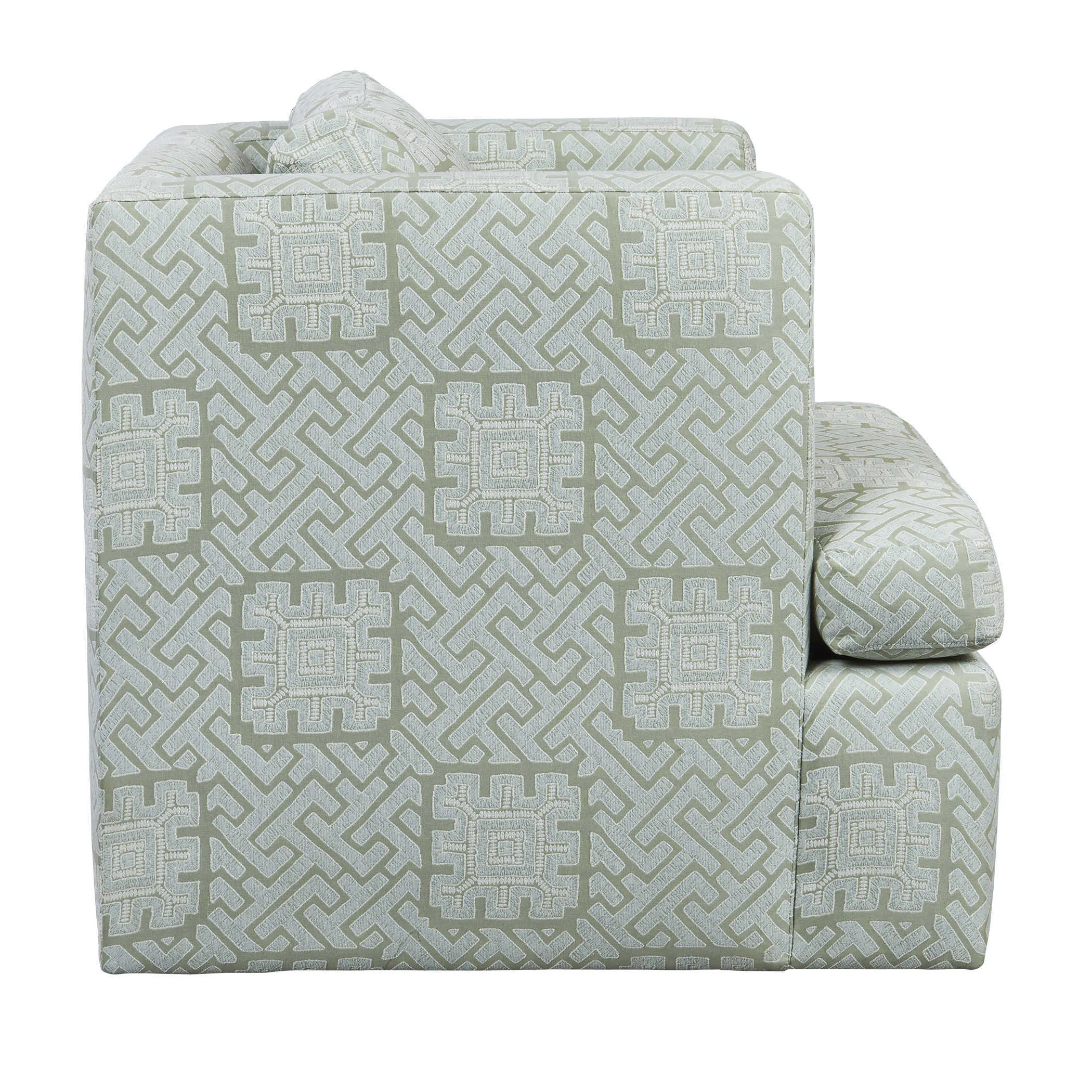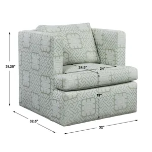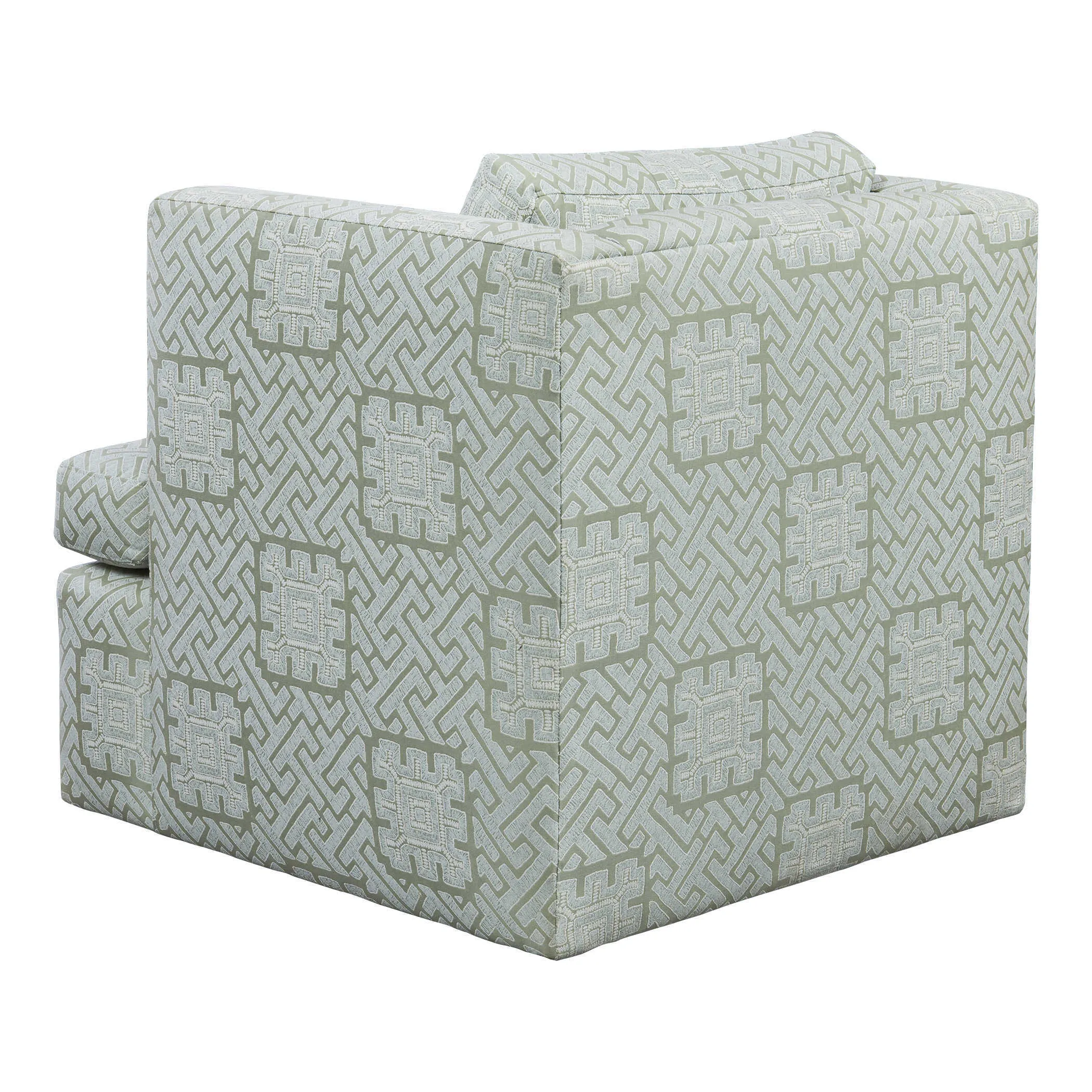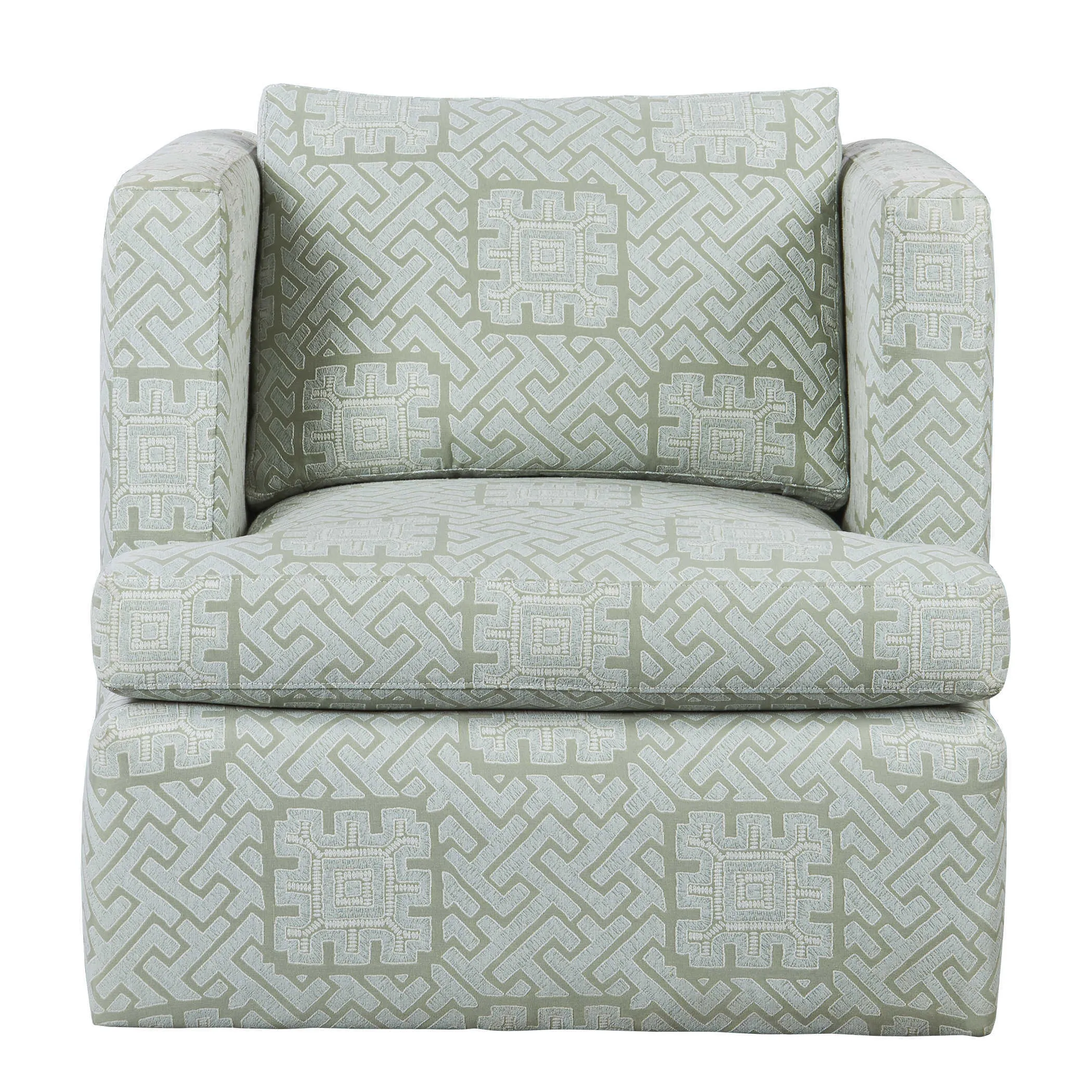 Cocoon yourself in this comfortable raised track arm chair that swivels. A solid hardwood frame is wrapped with 100% cotton and includes sinuous spring seat support. The seat cushion contains UltraCel 18/26 foam core wrapped in Trillium. The back cushion is filled with Trillium giving it all the properties and comfort of down without the required maintenance. Fully upholstered in rich celadon and seafoam colors, this performance fabric is a romantic and modern interpretation of the centuries-old maze. Made in the furniture capital, High Point, NC. Seat height is 19".