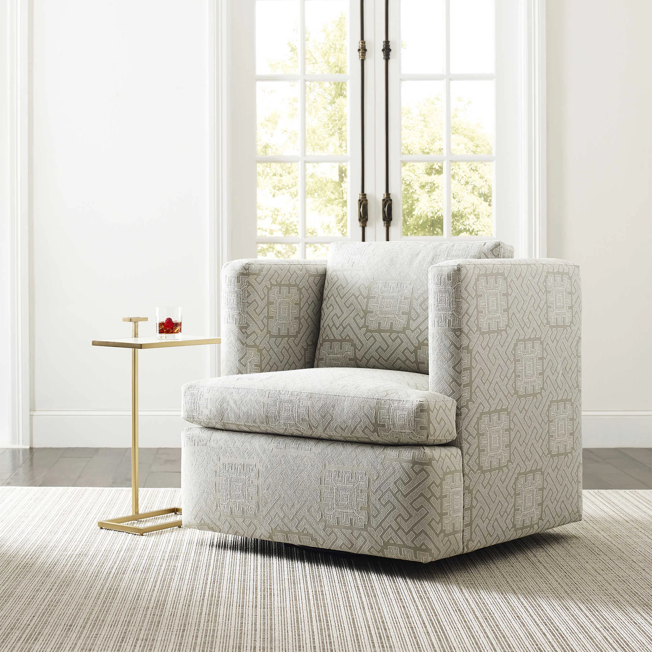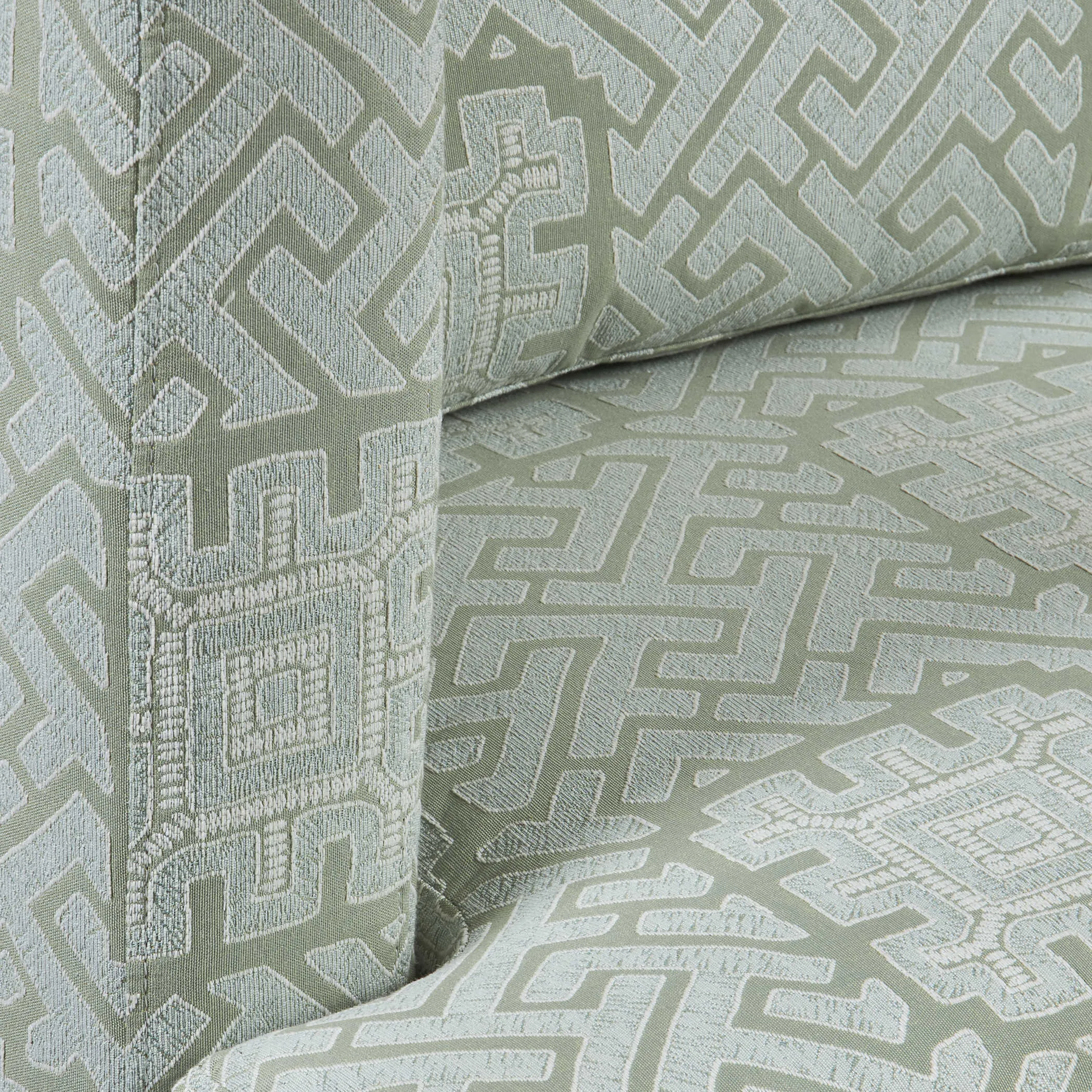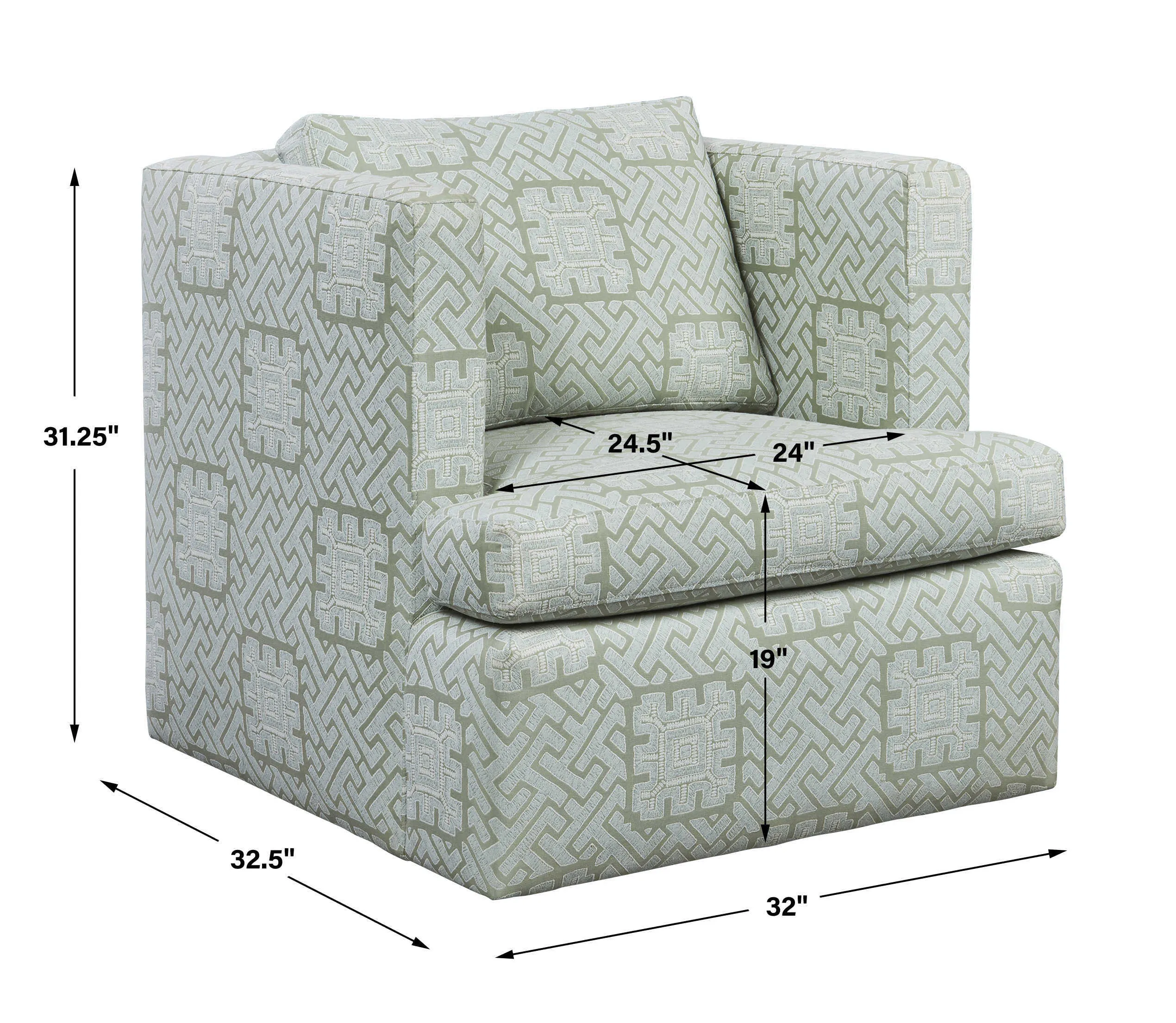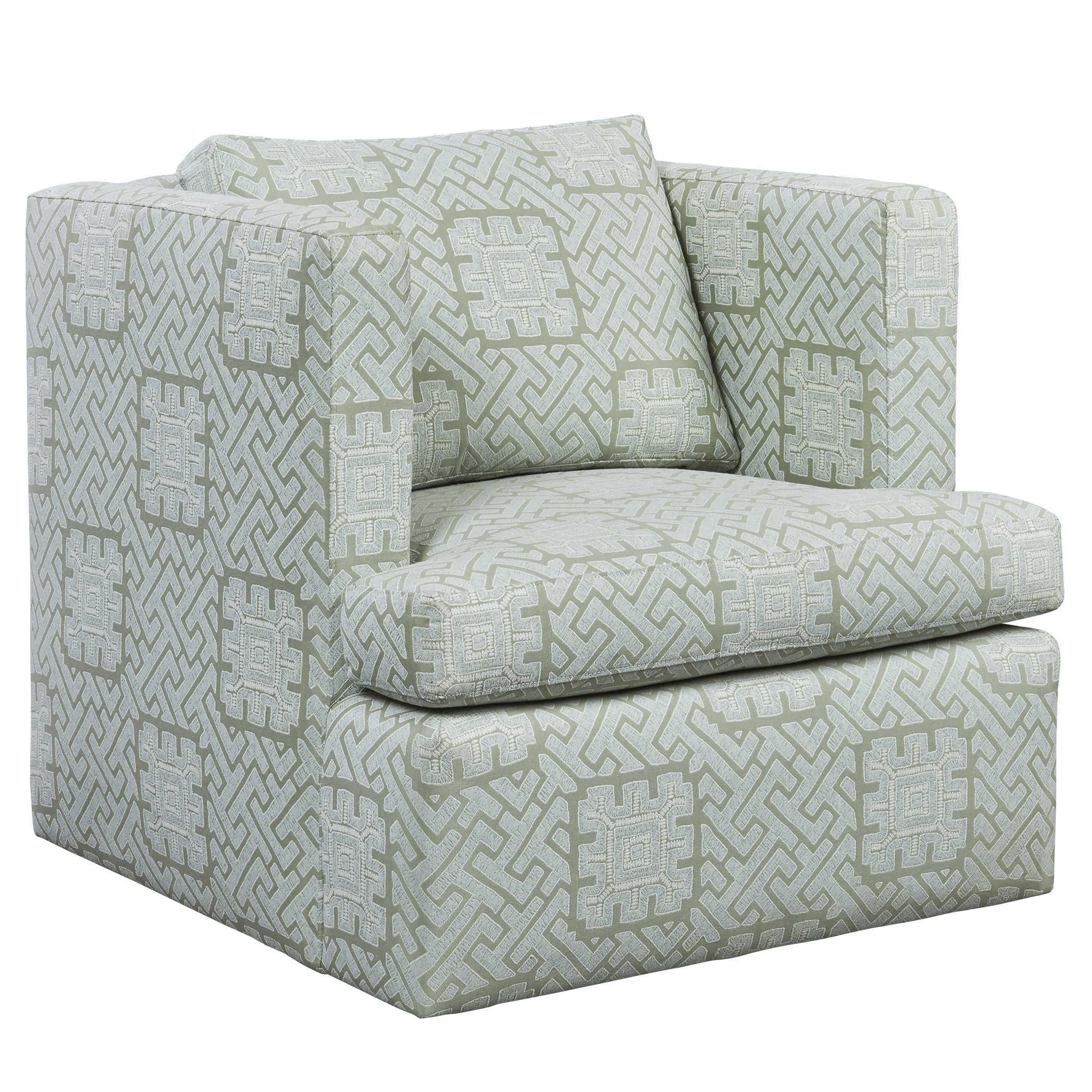 Cocoon yourself in this comfortable raised track arm chair that swivels. A solid hardwood frame is wrapped with 100% cotton and includes sinuous spring seat support. The seat cushion contains UltraCel 18/26 foam core wrapped in Trillium. The back cushion is filled with Trillium giving it all the properties and comfort of down without the required maintenance. Fully upholstered in rich celadon and seafoam colors, this performance fabric is a romantic and modern interpretation of the centuries-old maze. Made in the furniture capital, High Point, NC. Seat height is 19".