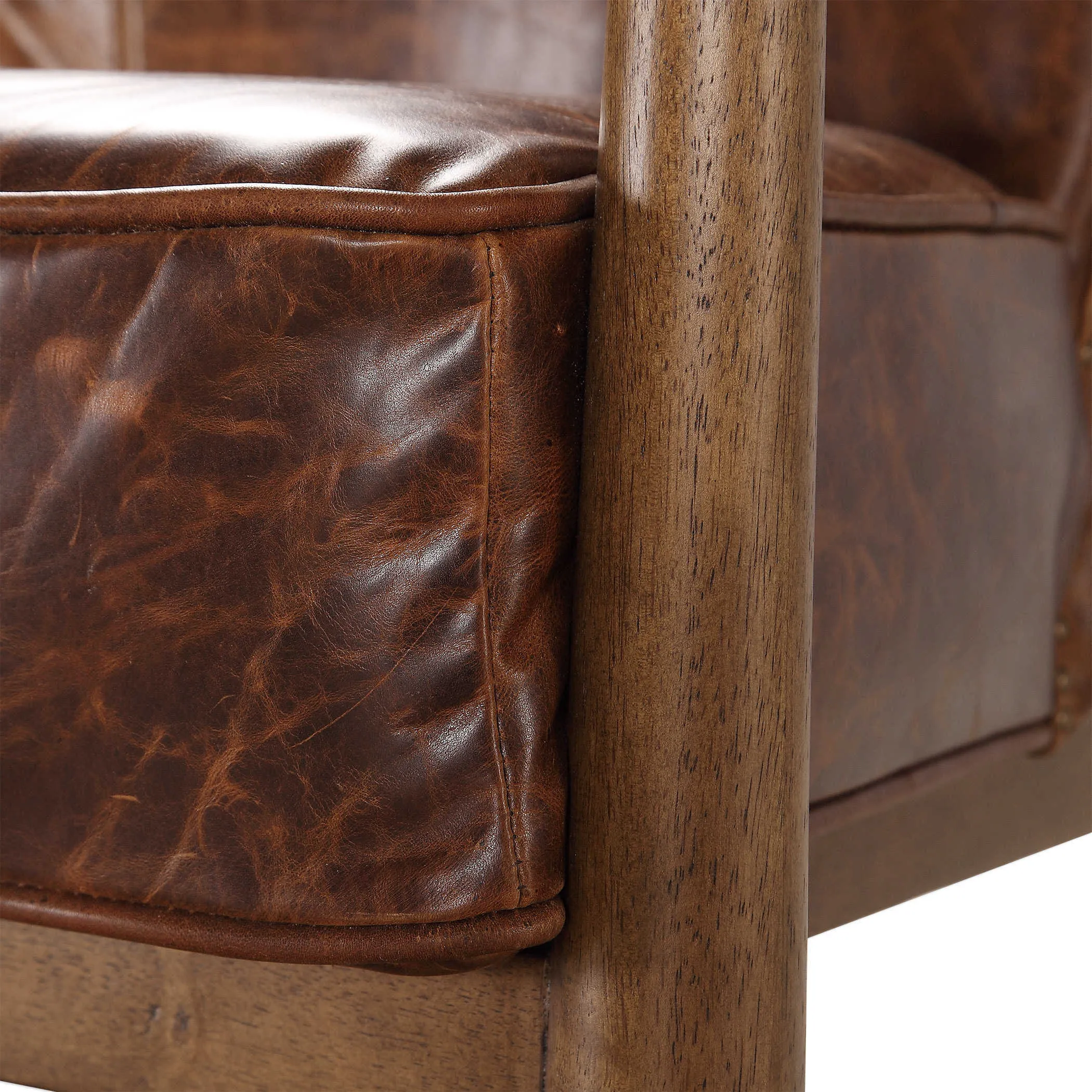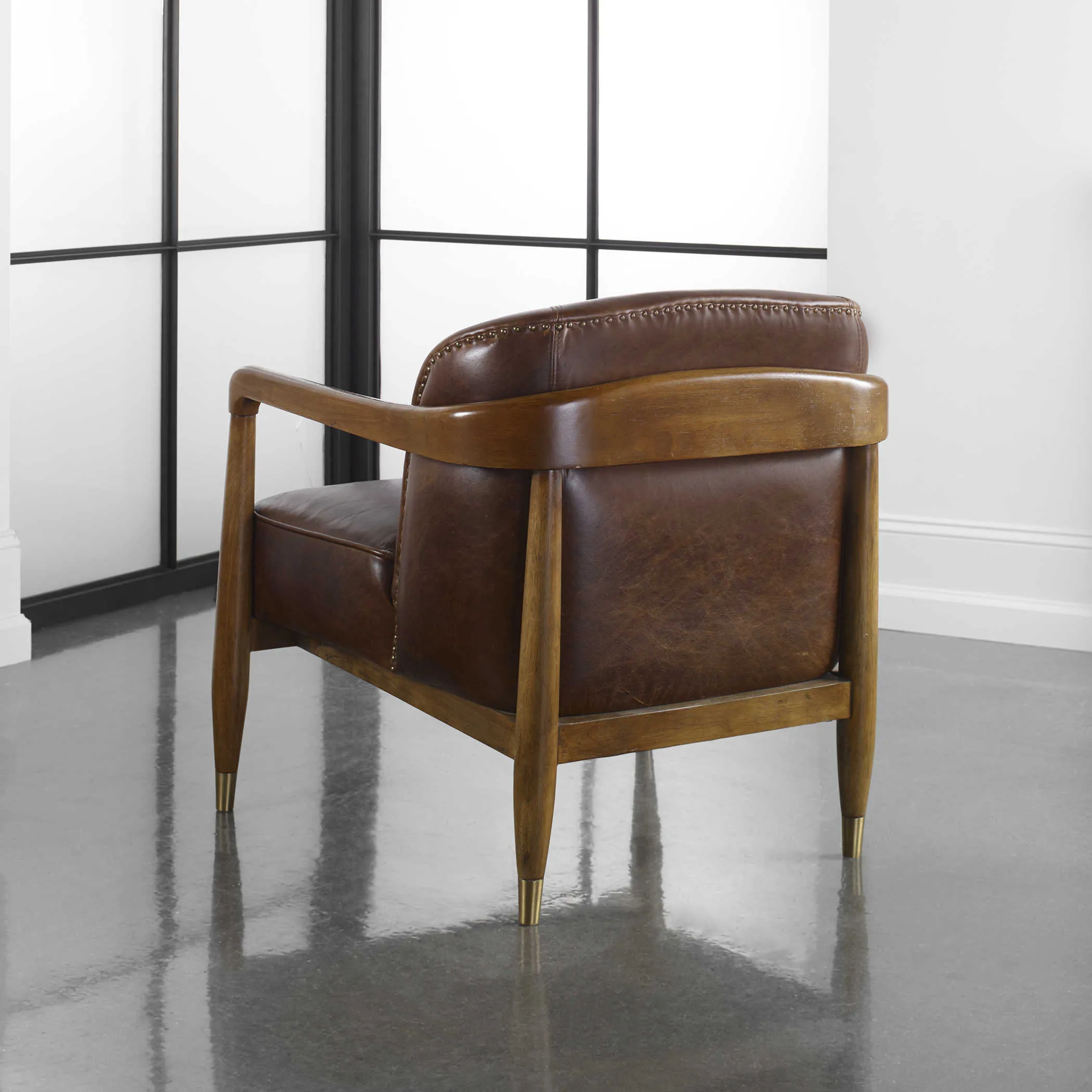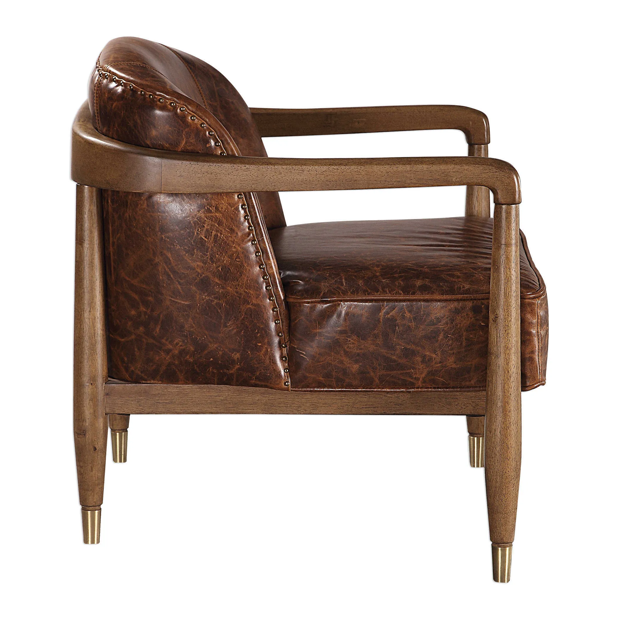 Showcased in a solid wood wrap-around frame in smooth honey, this mid century inspired chair features top grain pull up leather in cinnamon brown, finished with brushed brass feet caps. Because leather is a natural product, both texture and color will vary slightly from hide to hide and within the same hide. Seat height is 18".