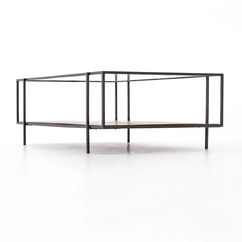 A shadowbox-style coffee table clears the way for your inner collector. Display prized possessions within a glass enclosure of gunmetal-finished iron framing and aged brown mango wood.