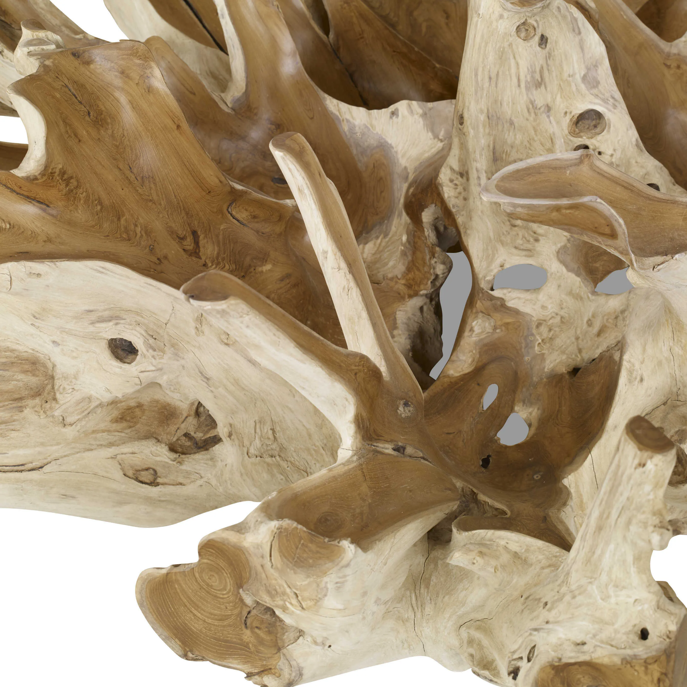 Nature has sculpted the beautiful Center Root Coffee Table. It is a stunning art piece that provides beauty and function. Made from the ball root of a plantation-grown teak tree, it is meticulously finished by artisans. Every table will vary ensuring its uniqueness. 40" x 60" glass included.