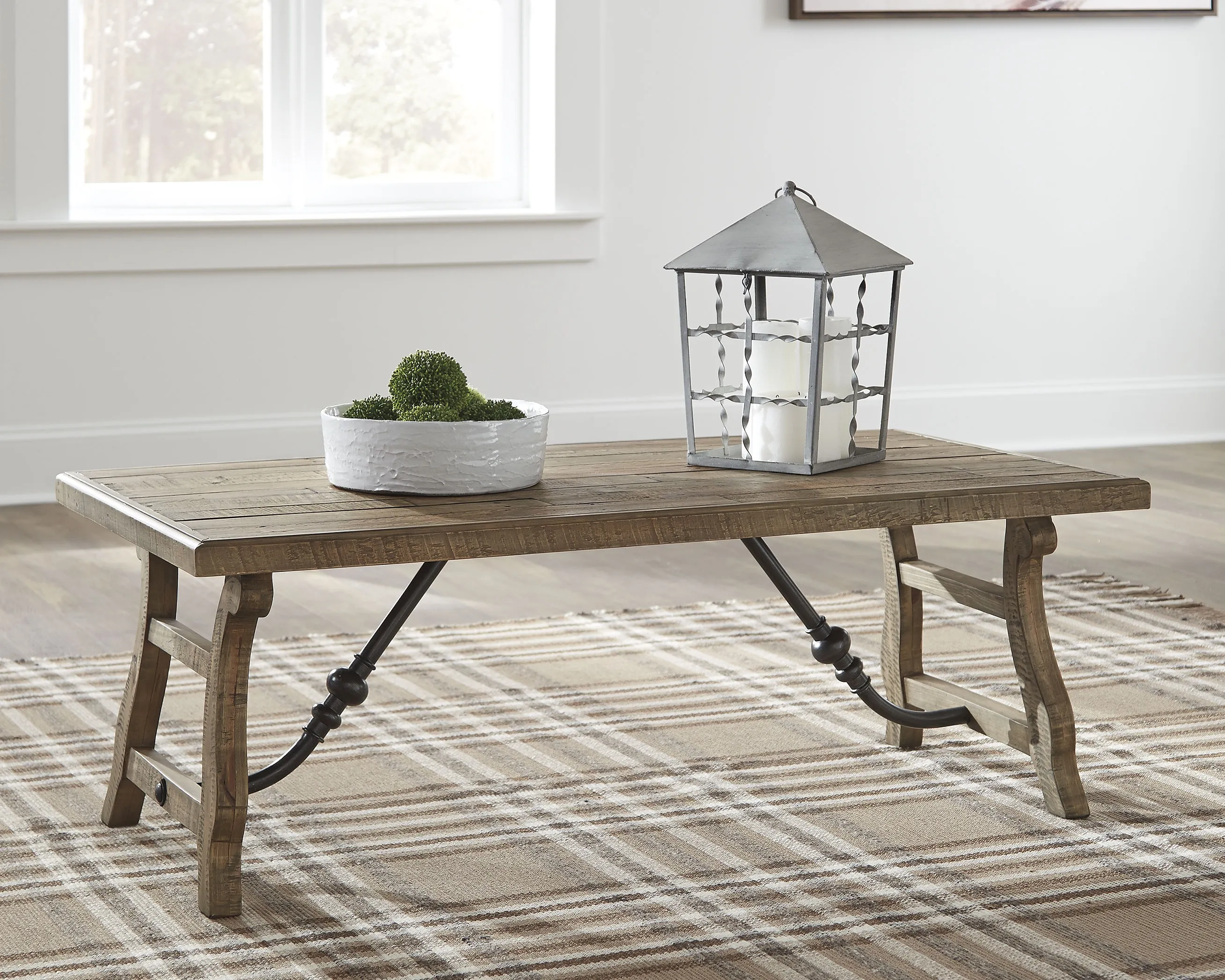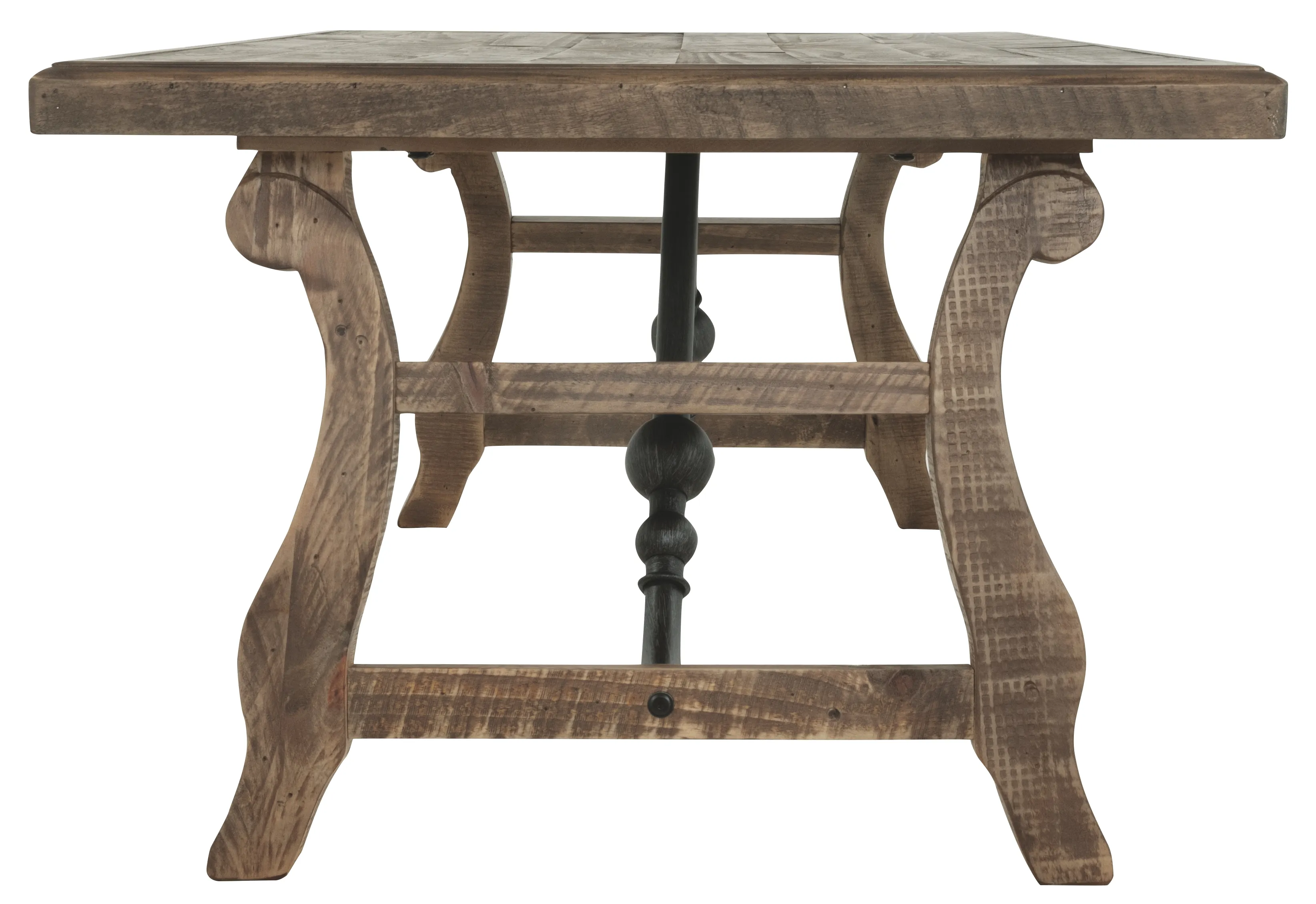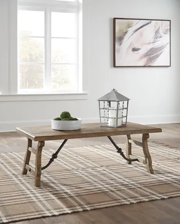 Pining for vintage-inspired beauty and quality at a price sure to entice? Be dazzled by this bench-style coffee table. It's crafted of reclaimed pine wood with a planked tabletop and decorative metal stretchers that enhance its rustic charm. The table's knotty, perfectly imperfect wood is finished with a lightly glazed effect to showcase the natural wonder.