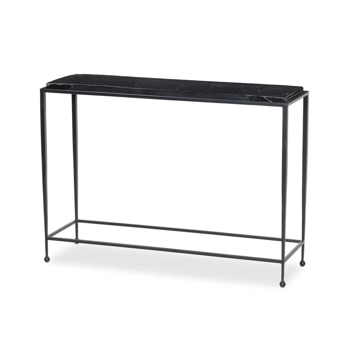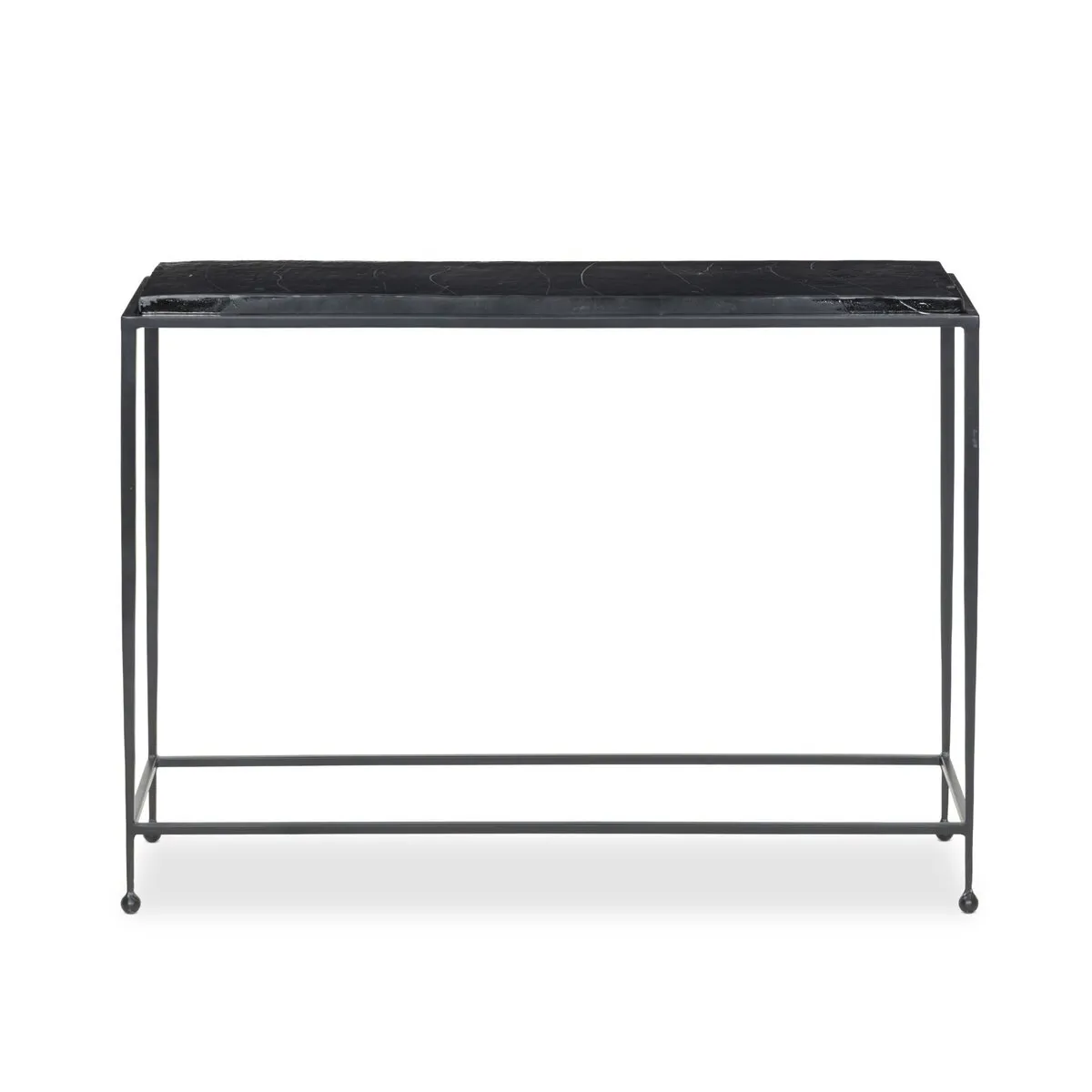 A slim, airy base of black-finished iron supports this console table of smoked black glass.
