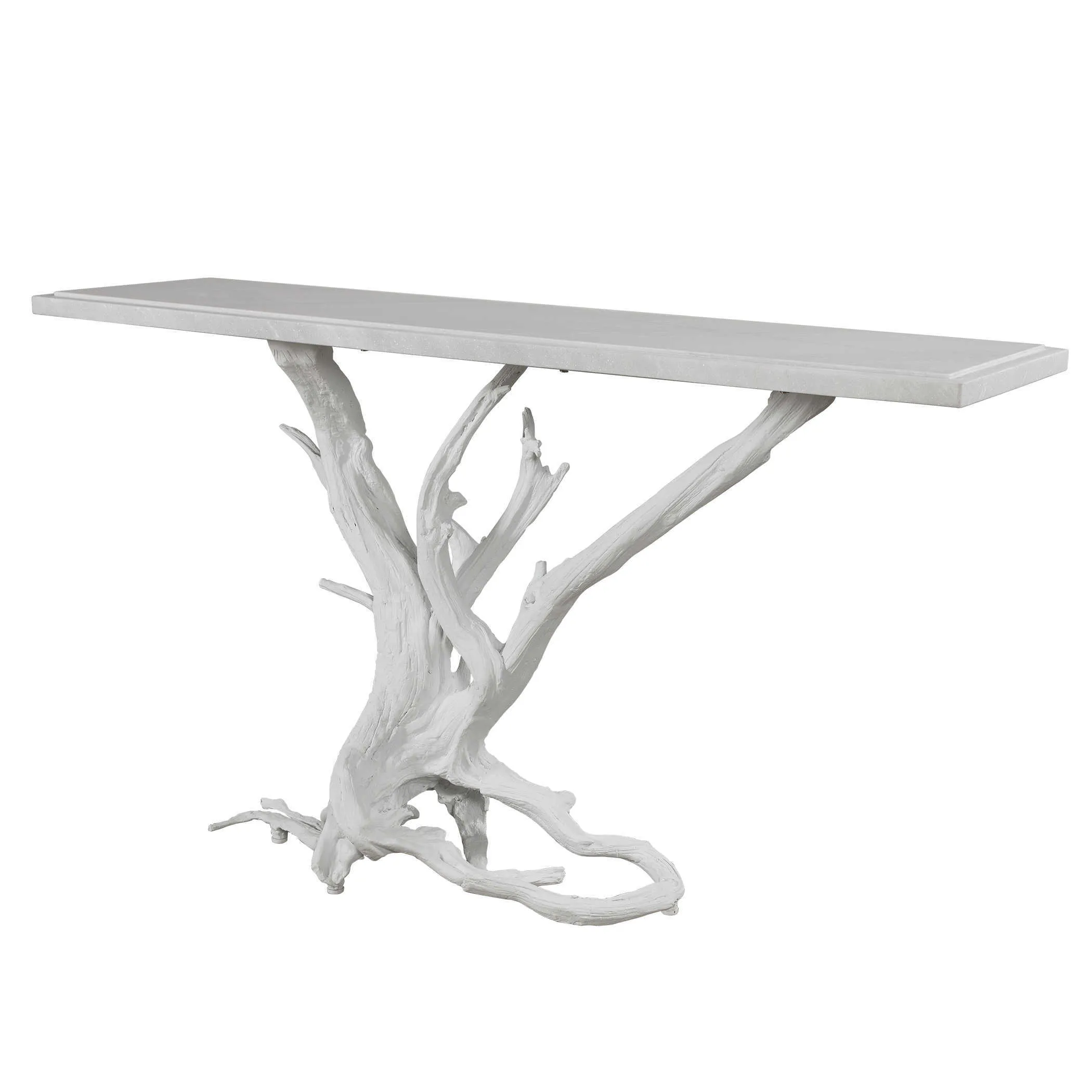 Real driftwood was cast in iron and constructed to create the striking Big Sur Table. The graceful base features authentic details and texture, and supports a white, honed marble top. True to the nature of natural materials, each piece will have unique marbling and veining throughout.
