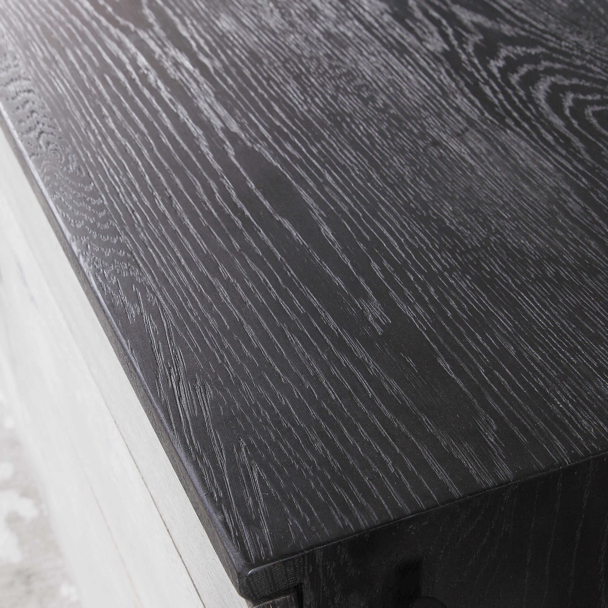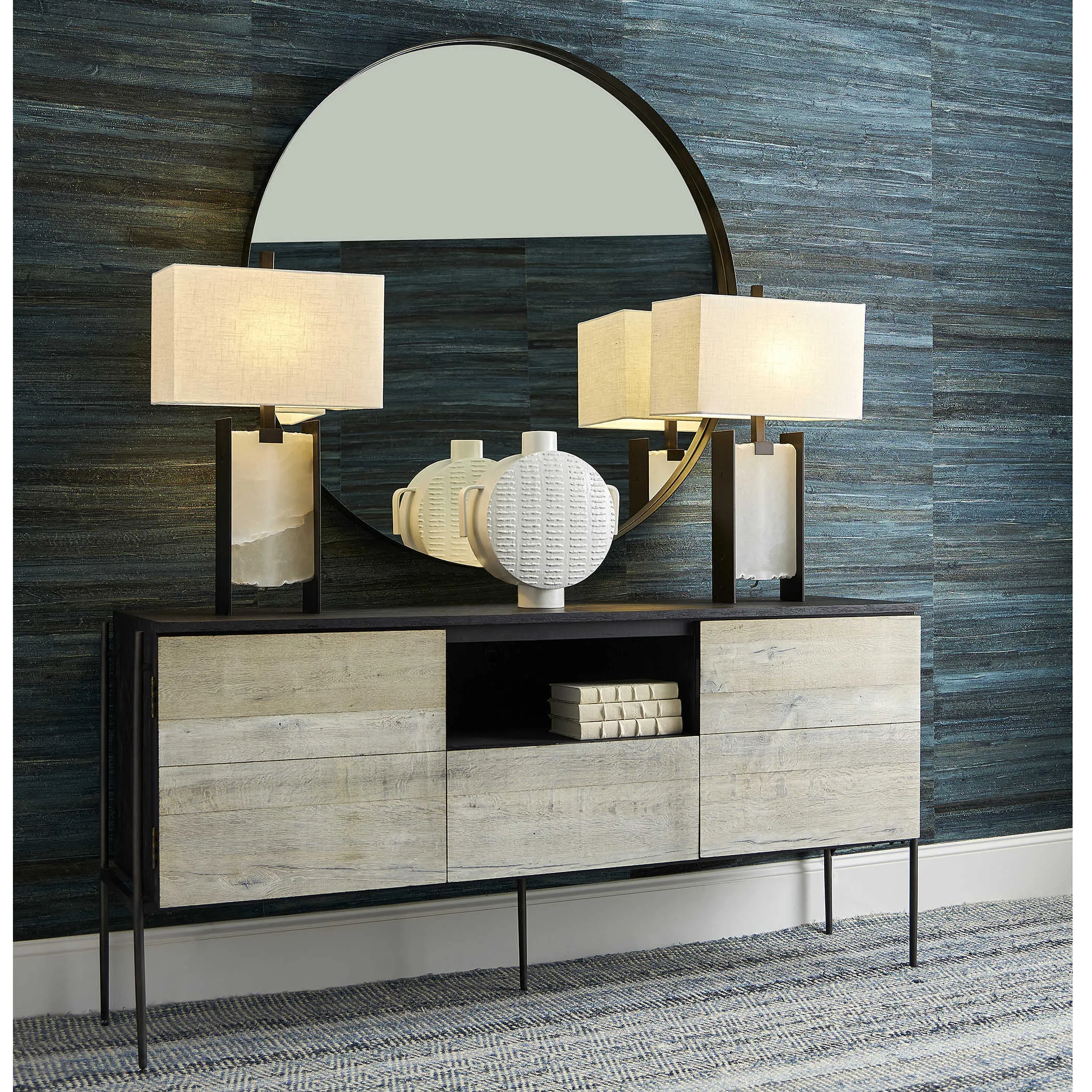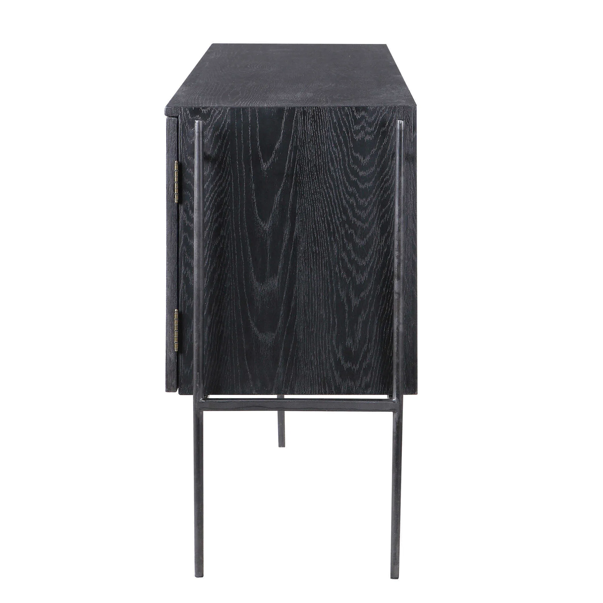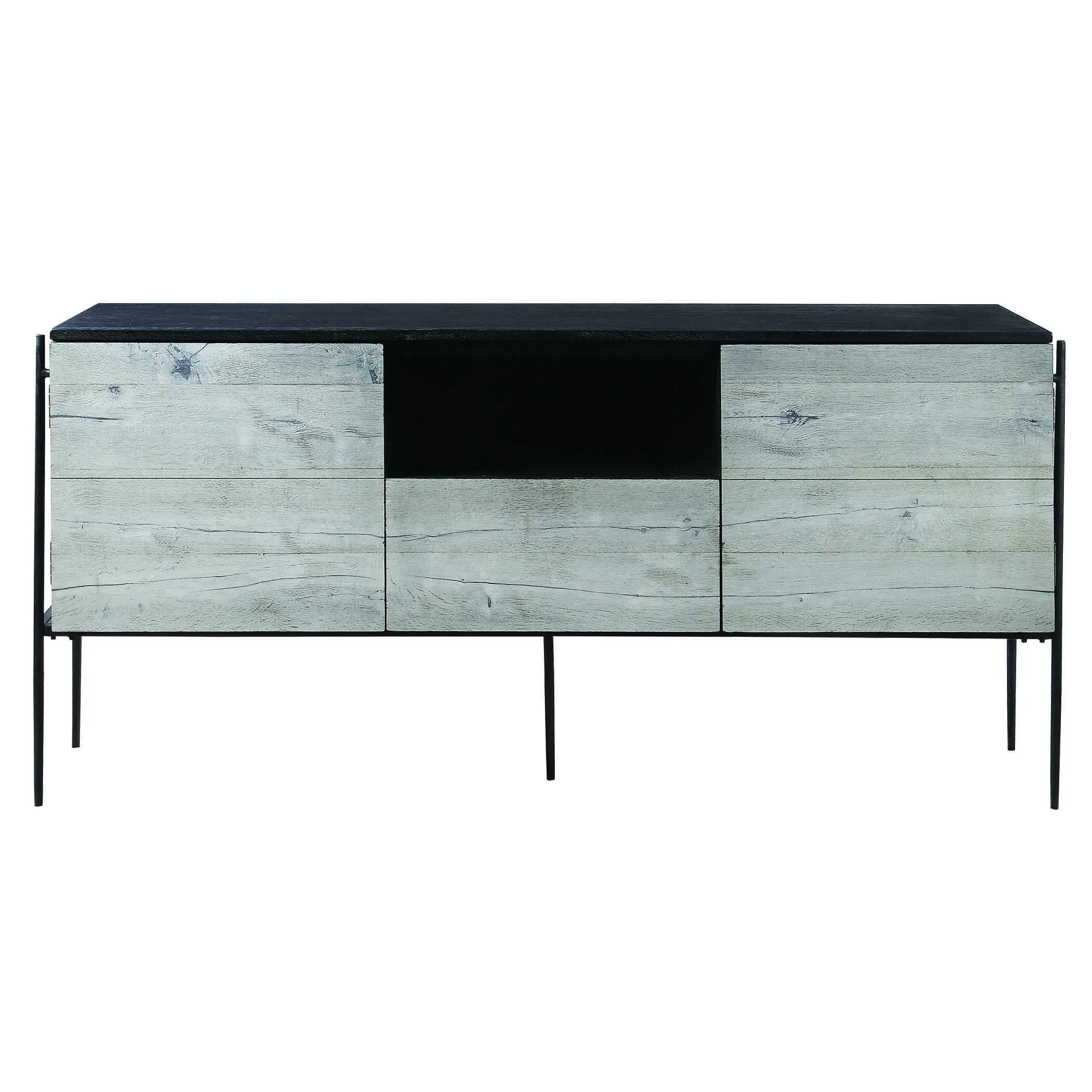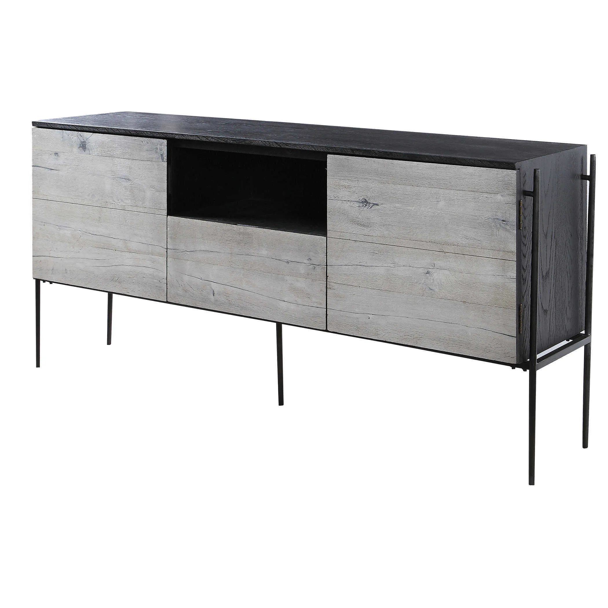 Constructed from oak veneers and solids, this media console showcases a modern two toned finish combination of a rich charcoal black and mushroom gray tones, suspended by a unique aged iron framework adding an urban flair. Perfect for use under a TV, as a sideboard, or as the focal point of a room. Each side features cabinet doors with an adjustable shelf, with one center drawer for storage, and an open area with wire management. Solid wood will continue to move with temperature and humidity changes, which can result in small cracks and uneven surfaces, adding to its authenticity and character.