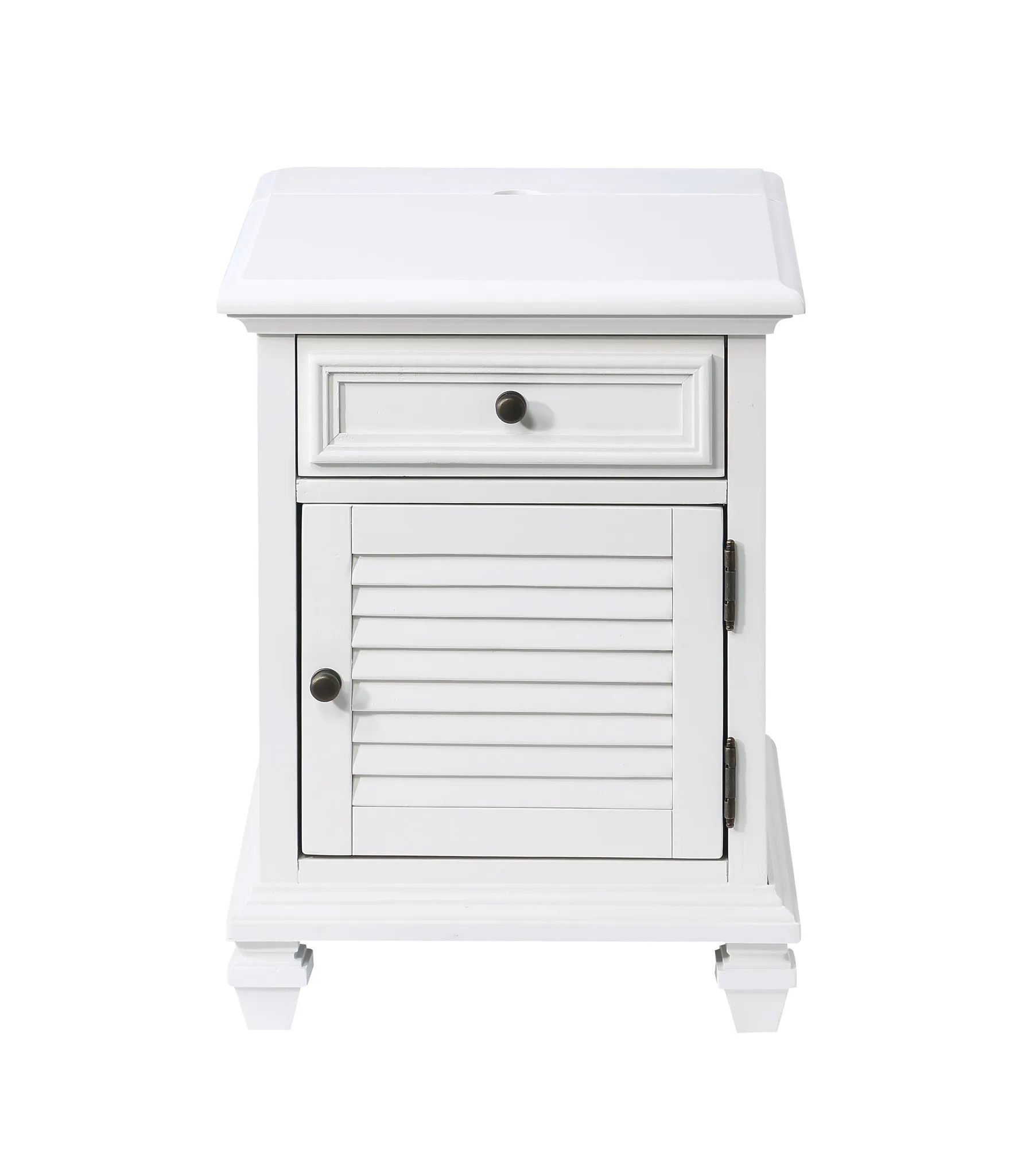 Modern farmhouse design in a compact design that fits comfortably beside a chair or as a companion piece to a Sofa and Loveseat. This Charlestown table offers looks and function with a pop-up power strip that offers convenient recharging of devices with a built-in USB recharging station. All of this is a crisp white finish with louvered doors and contemporary bun foot in a transitional package that will fit in any room.