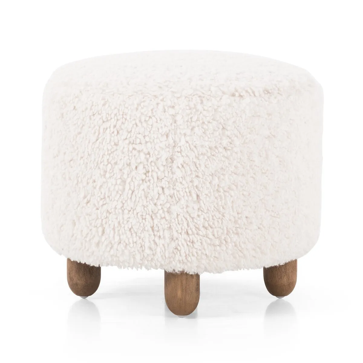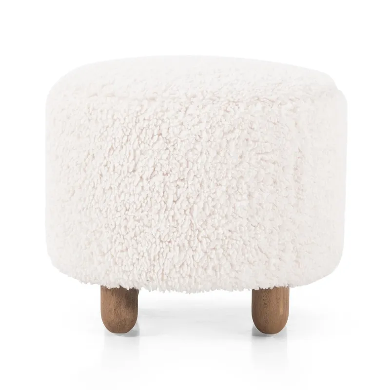 Place this round ottoman just about anywhere for a subtle retro vibe. Upholstered in a faux Mongolian shearling with a high pile fur. Parawood legs are wirebrushed for a warm, vintage feel.