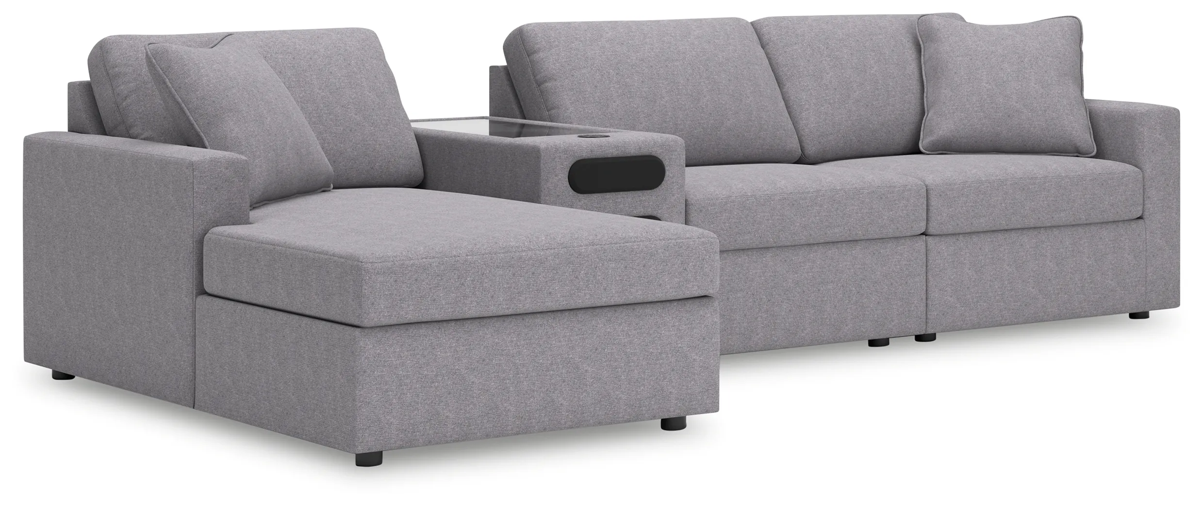 Includes 4 modular pieces: left-arm facing corner chaise, armless chair, audio console with storage and right-arm facing corner chair