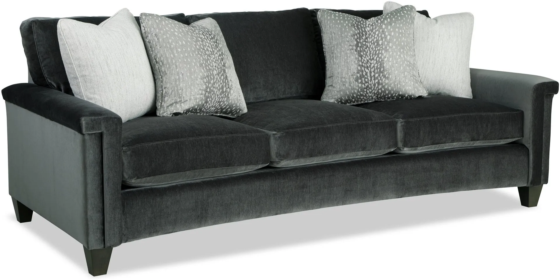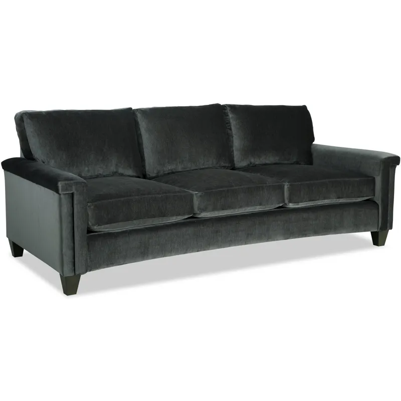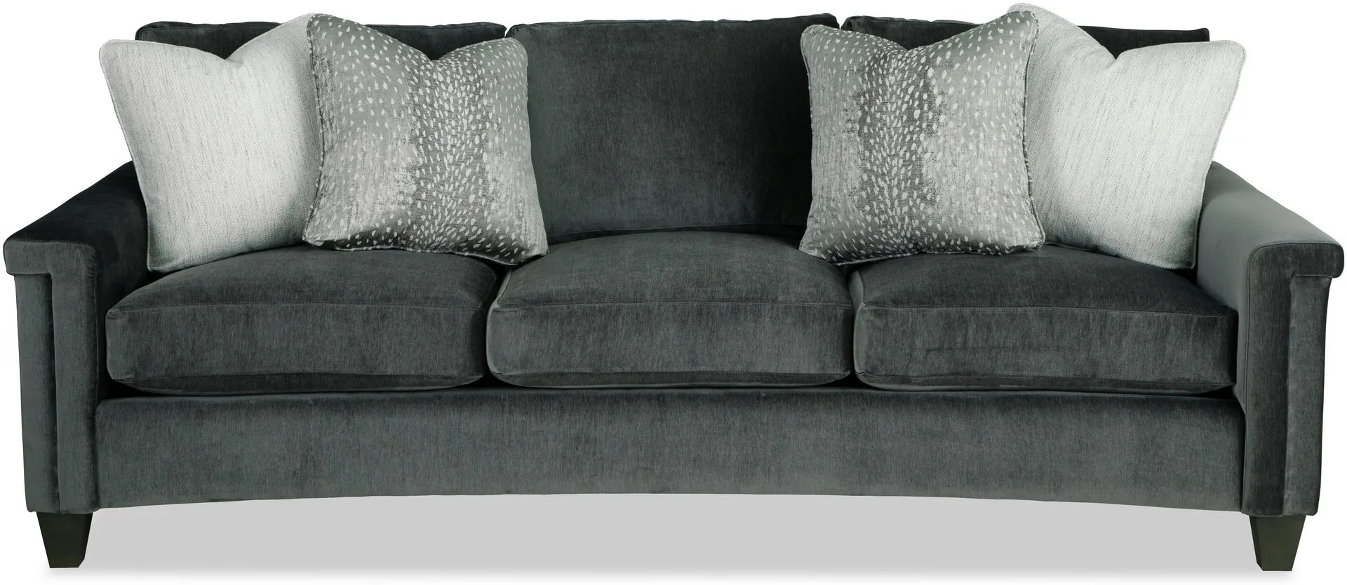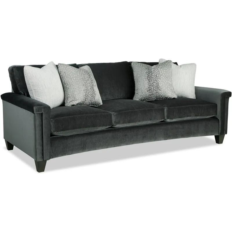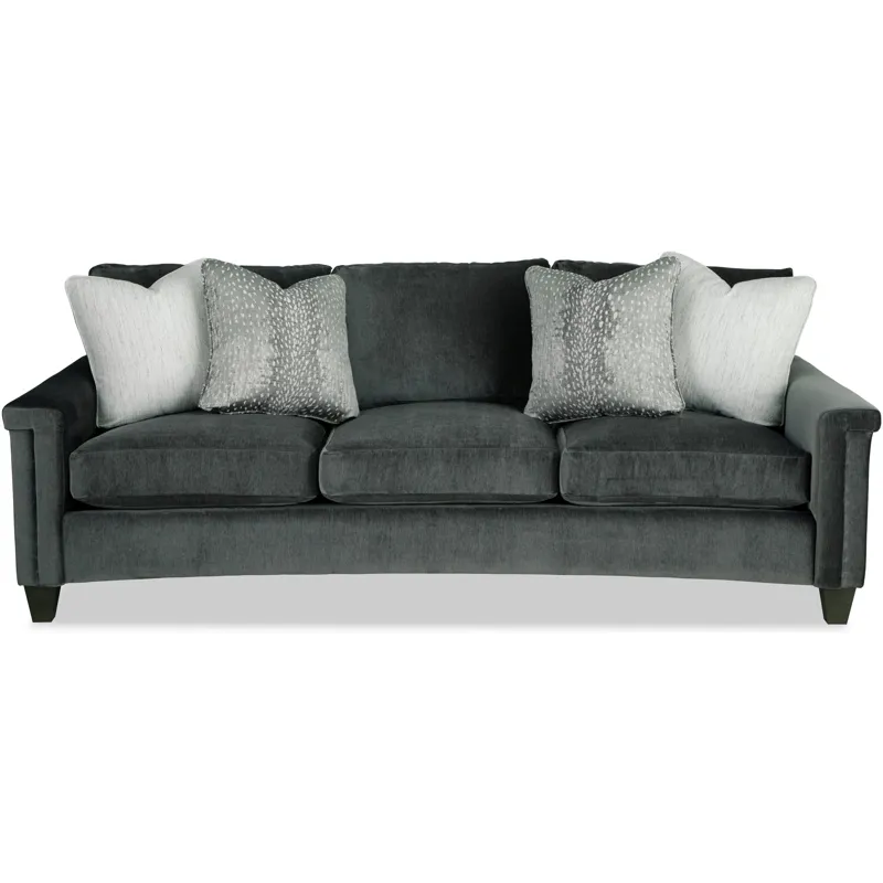 Dramatic shaping is the hallmark trait of this elegant curved-front sofa. It features a unique padded arm treatment, tapered legs, and French seaming as well as Blend-Down seating and loose back pillows. Two pairs of toss pillows standard. Also available are the matching loveseat, chair, swivel chair, and ottoman.