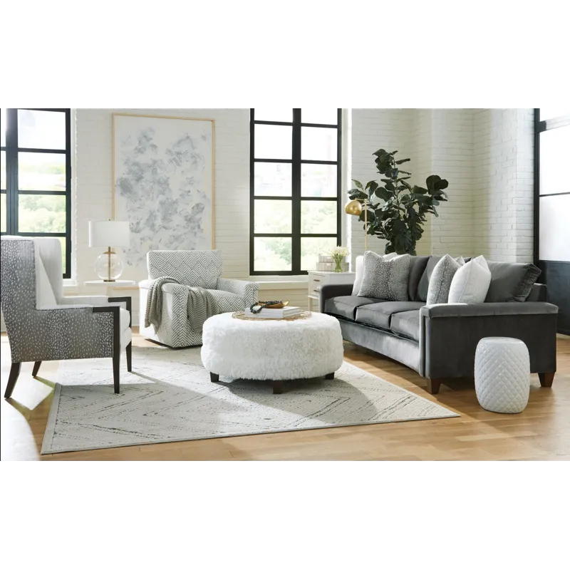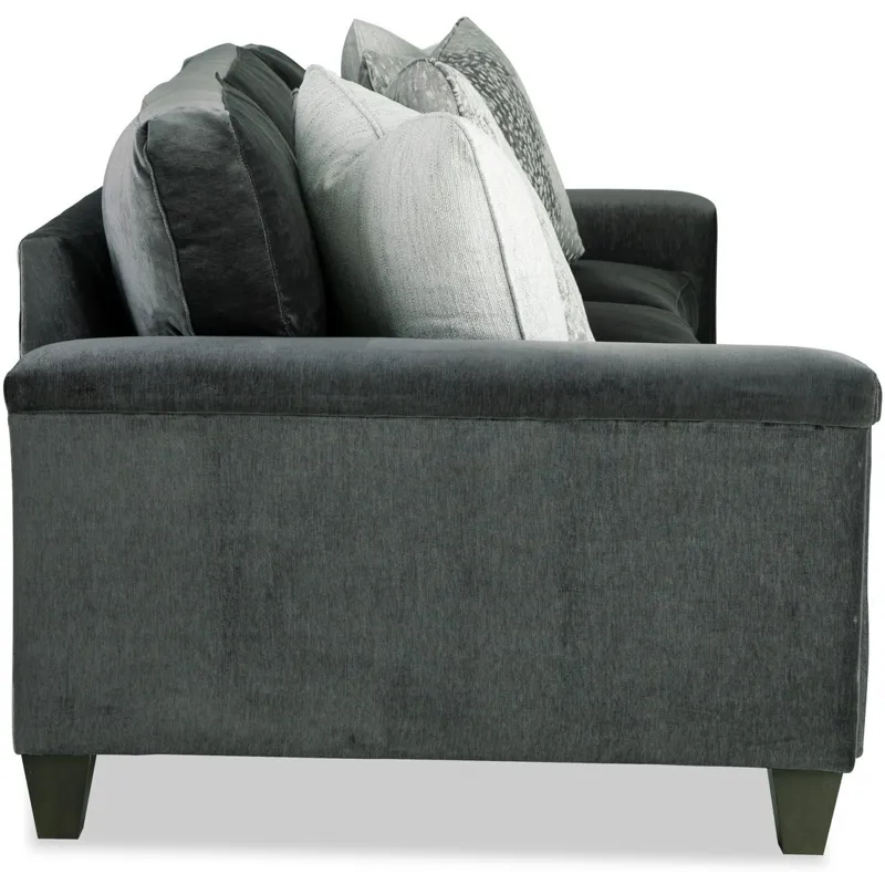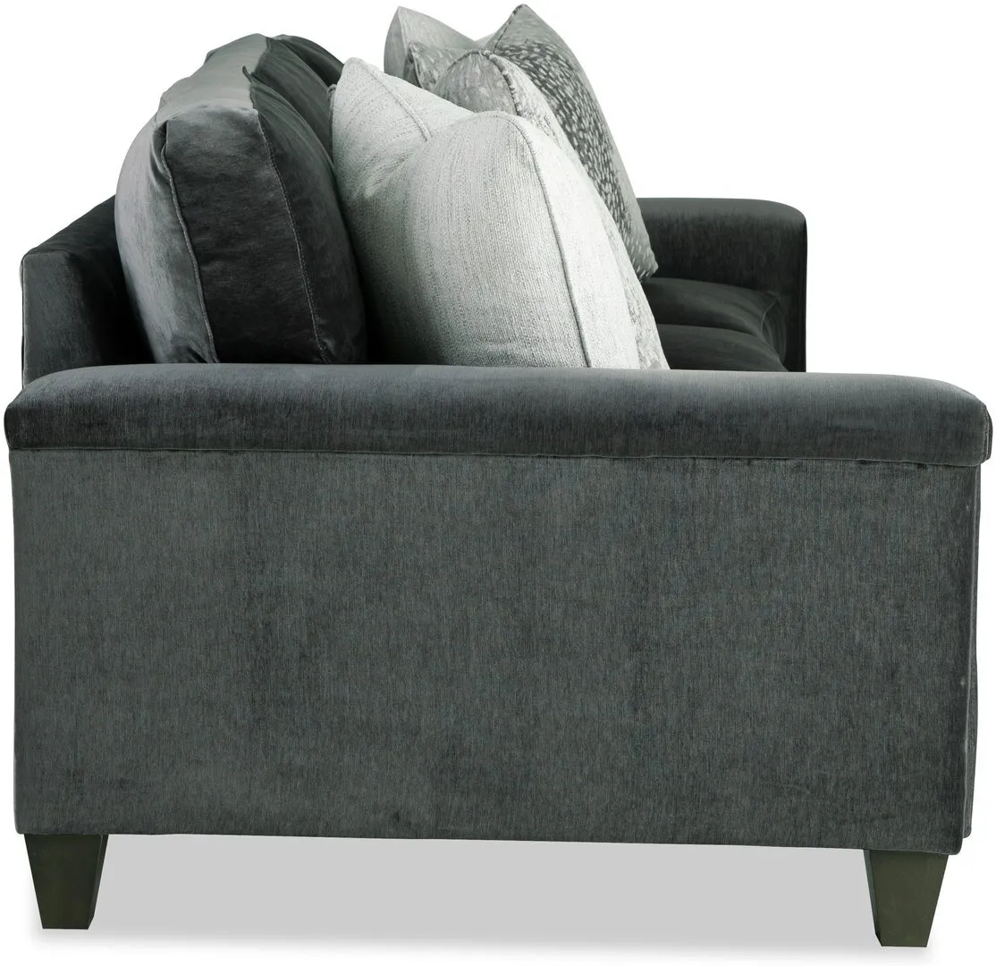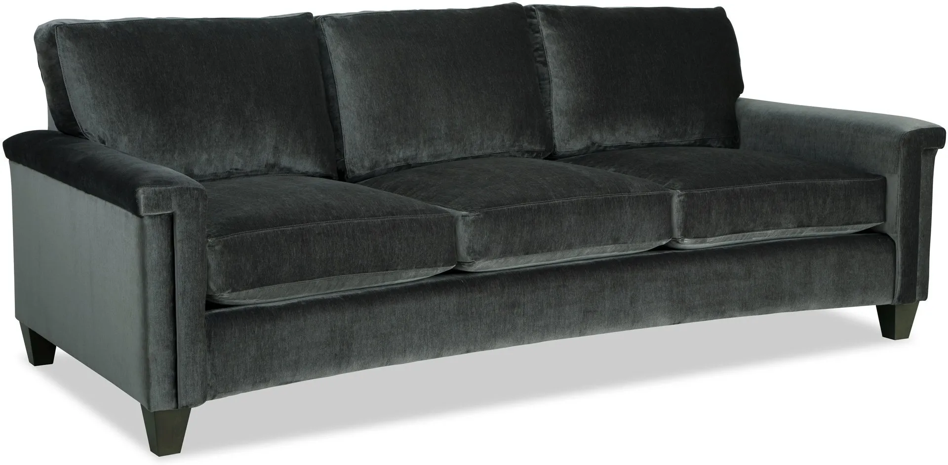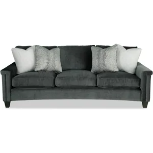 Dramatic shaping is the hallmark trait of this elegant curved-front sofa. It features a unique padded arm treatment, tapered legs, and French seaming as well as Blend-Down seating and loose back pillows. Two pairs of toss pillows standard. Also available are the matching loveseat, chair, swivel chair, and ottoman.