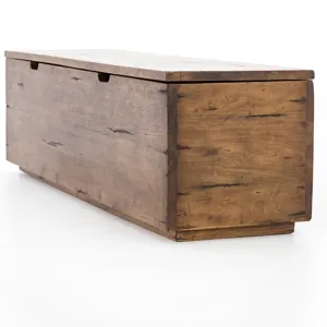 Rich, reclaimed woods deliver depth beyond streamlined shaping. Warm brown tones reveal natural knots and graining for a distinctively found feel. Spacious trunk space perfect in entryway or at the foot of the bed. Plinth base adds a modern touch.