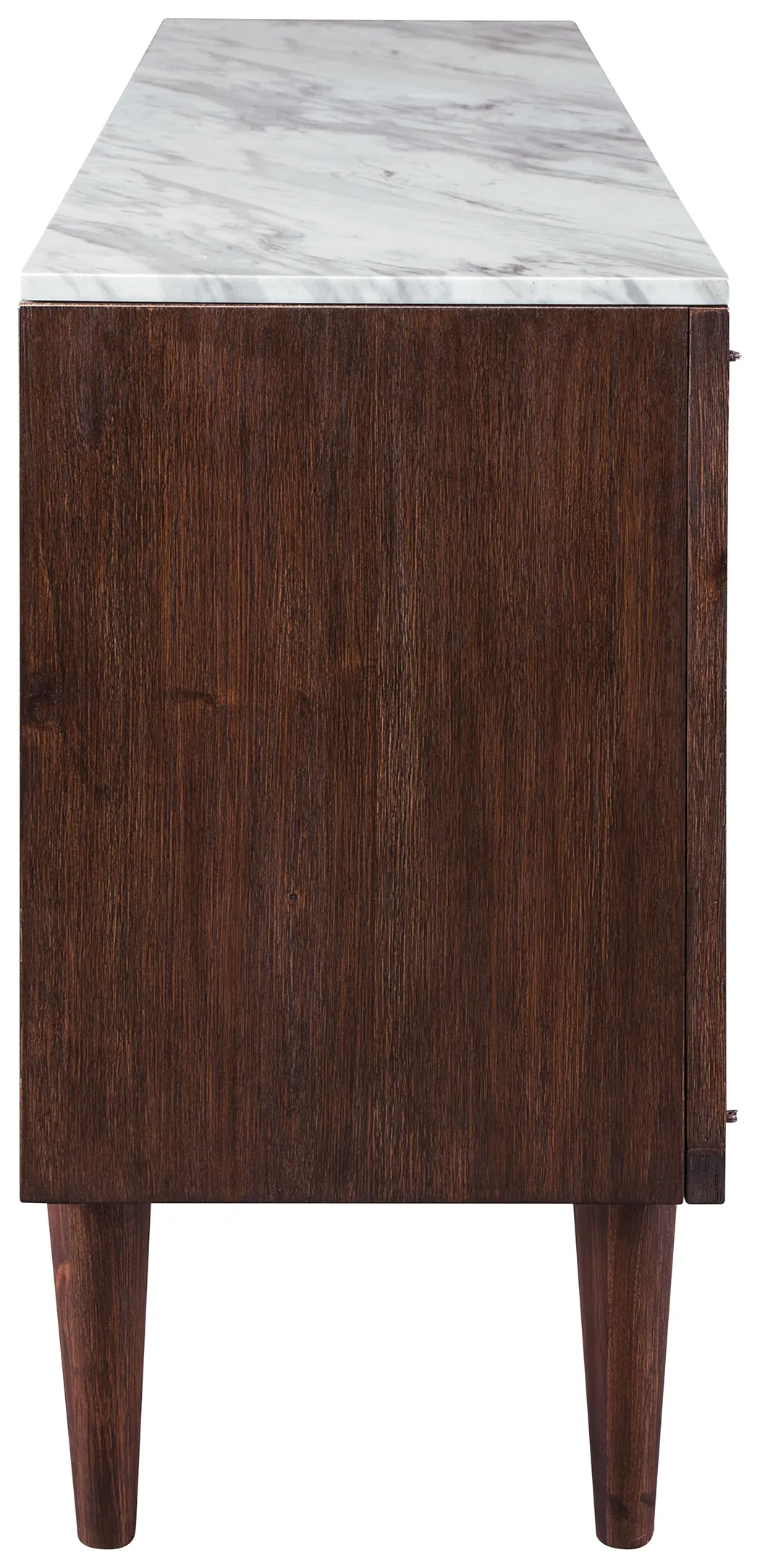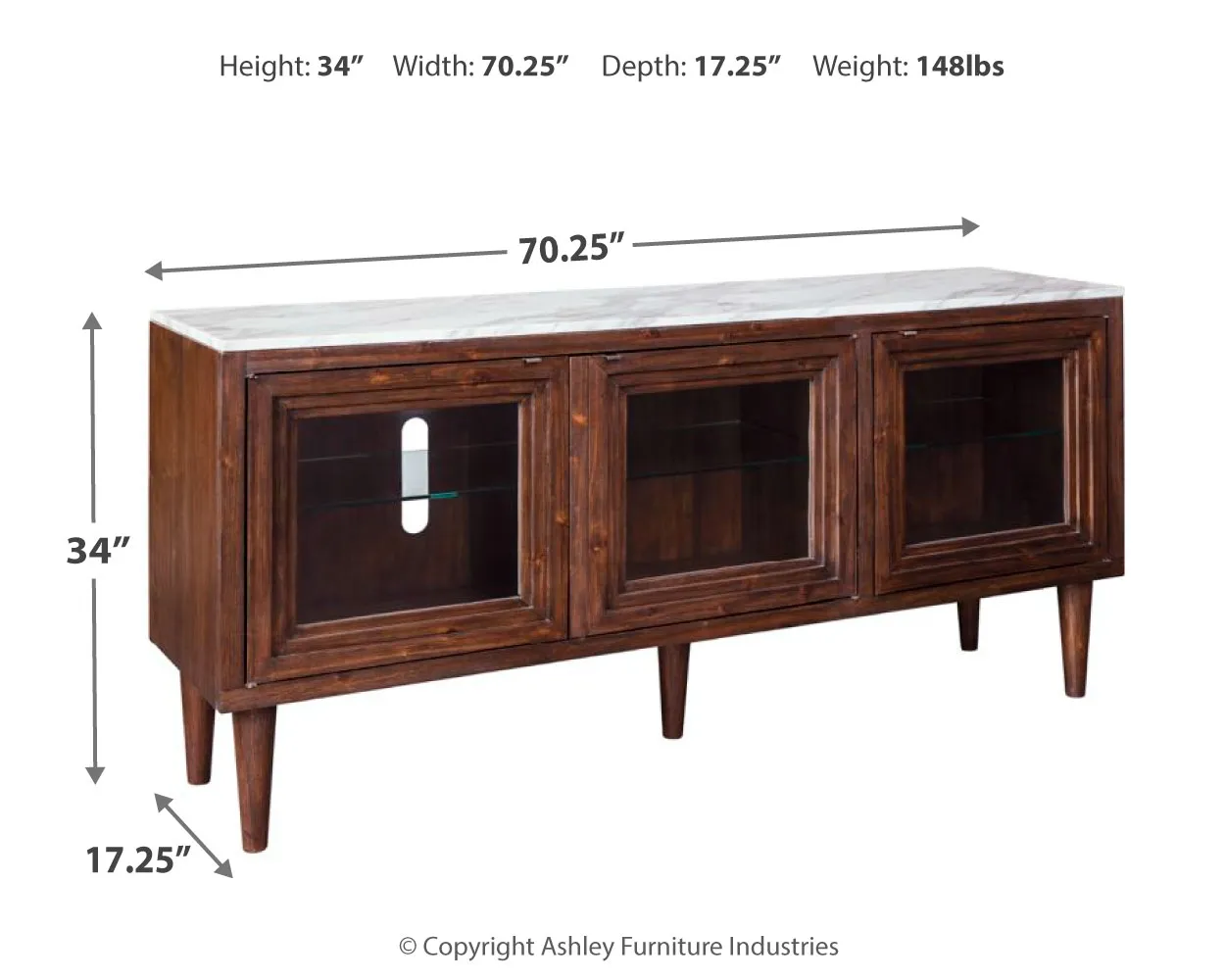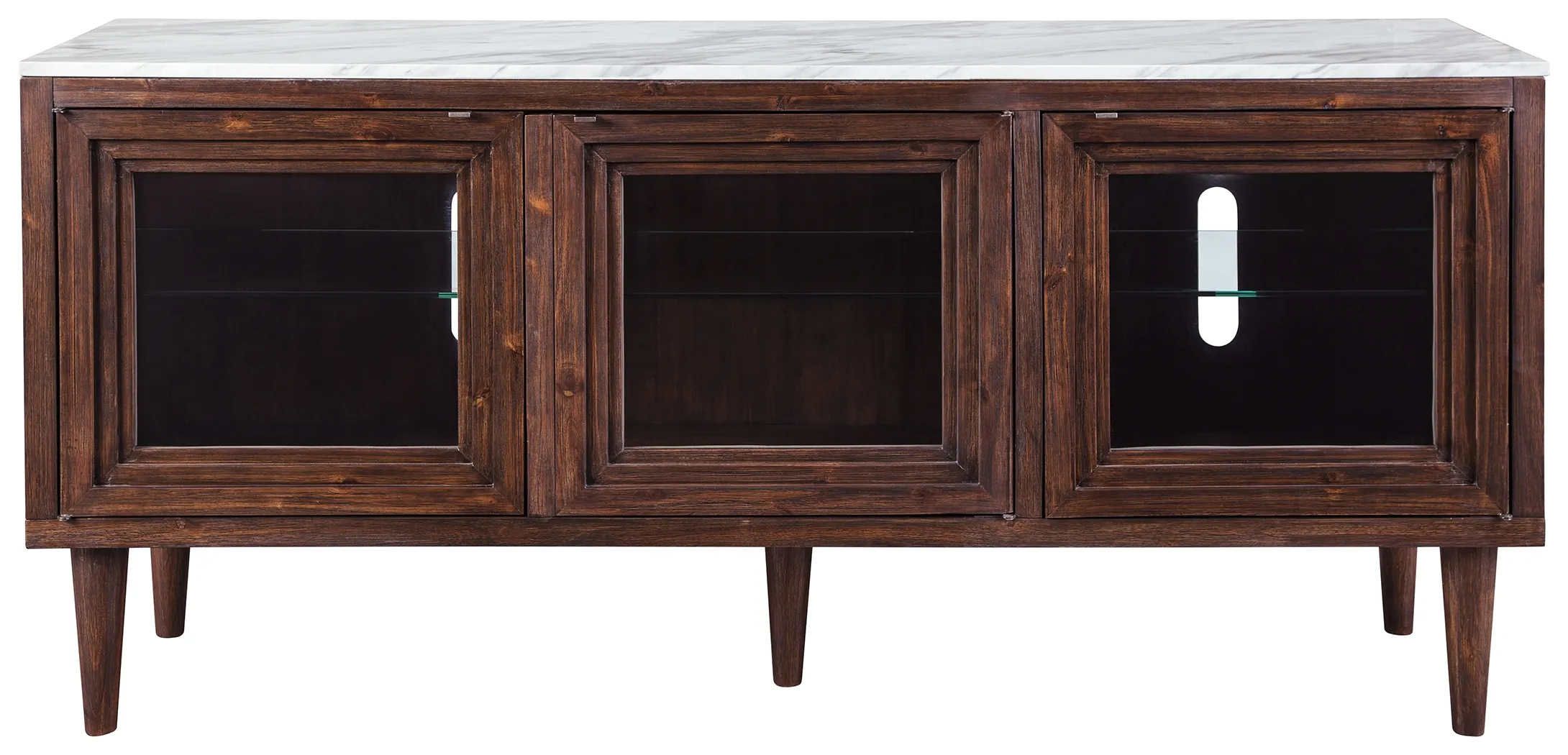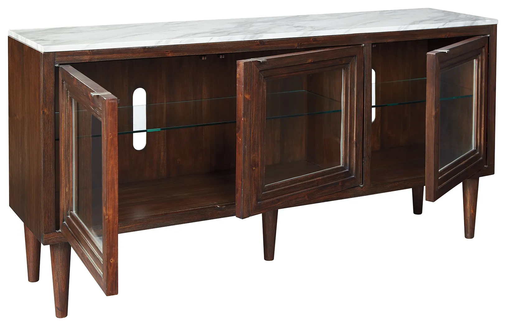 Accentuate your taste for the finer things with this richly styled accent cabinet. A mighty functional piece that's a welcome addition everywhere from the entryway to the living room or dining room, this striking cabinet-with adjustable shelving behind glass-front doors-is equal parts form and function. There's even a cutout for wire management, making this accent cabinet with faux marble top a high-design TV stand option.