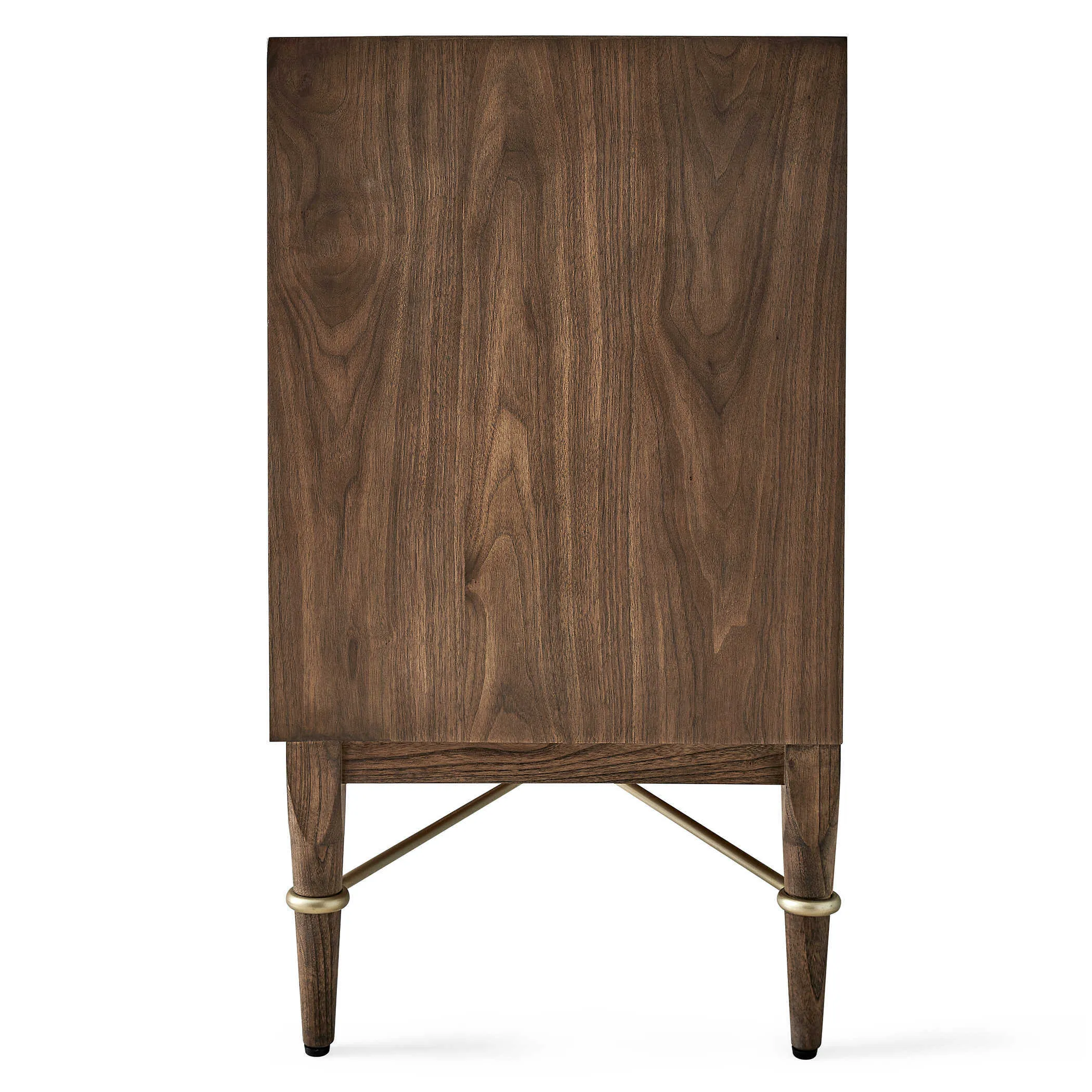 Made of American walnut the matte finish recalls mid 20th century Swedish furniture. The extensively designed console design reinterprets inspiration from many sources creating a fresh new look full of interesting details. Decorative hardware is made of solid brass. Each pair of doors conceal one adjustable shelf and wire management.