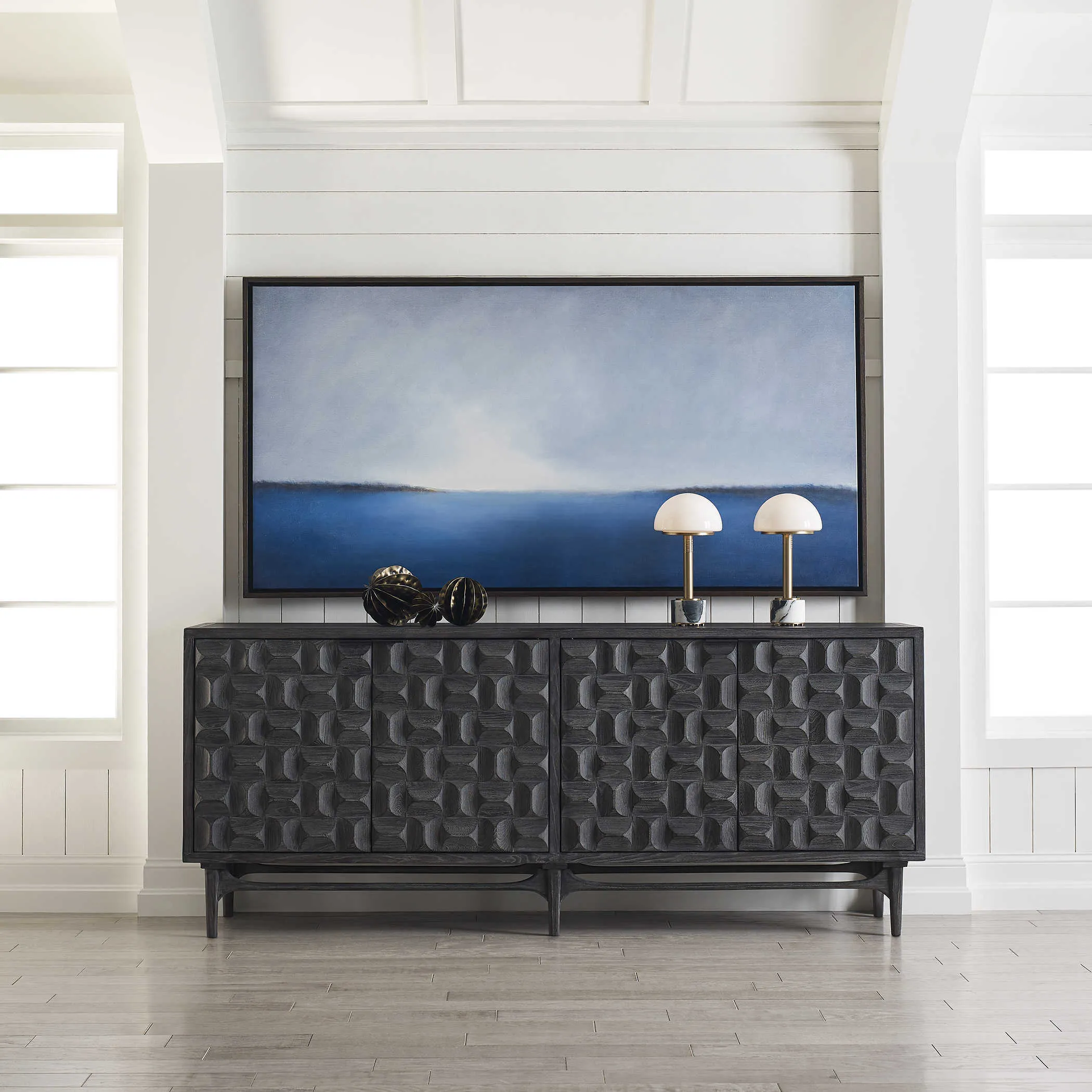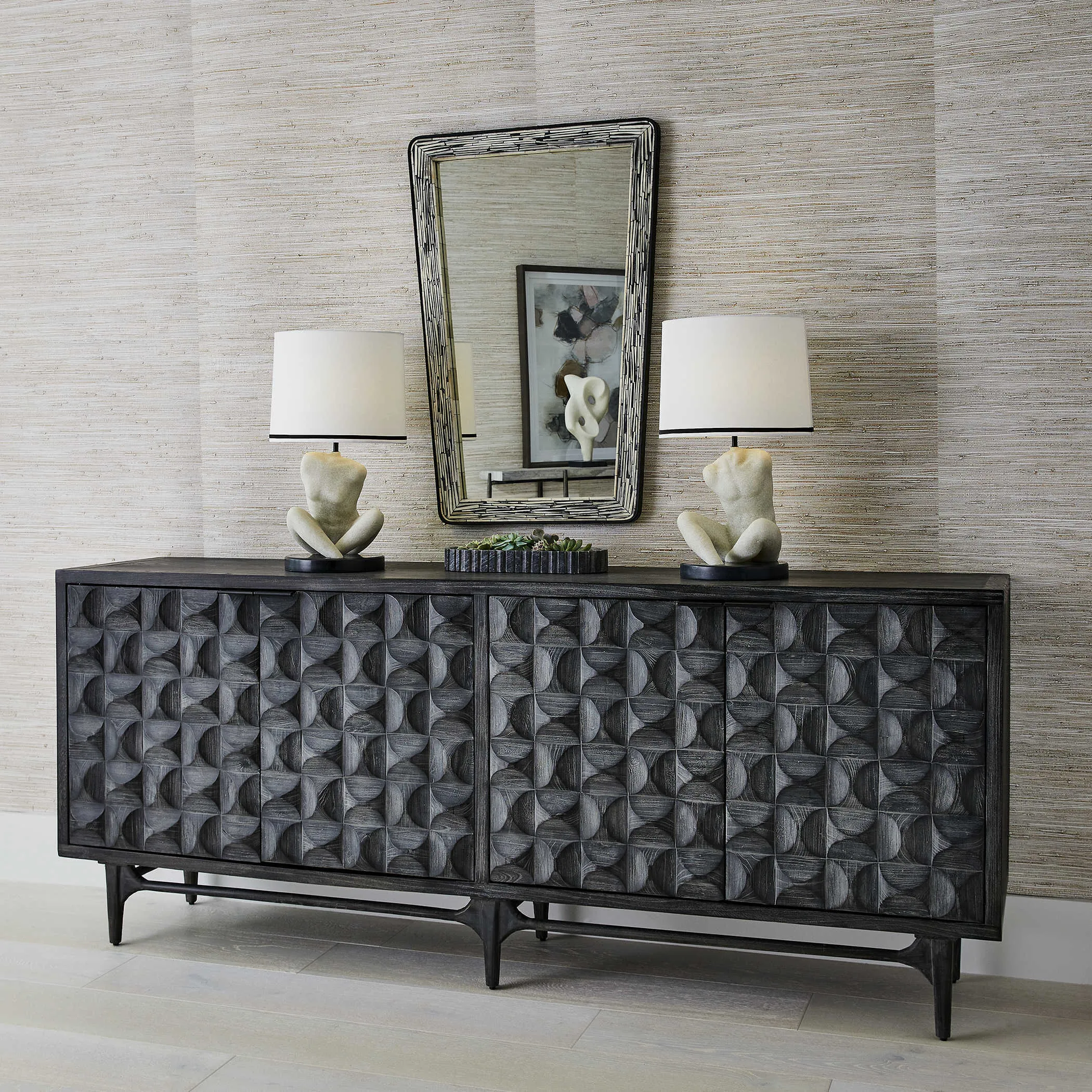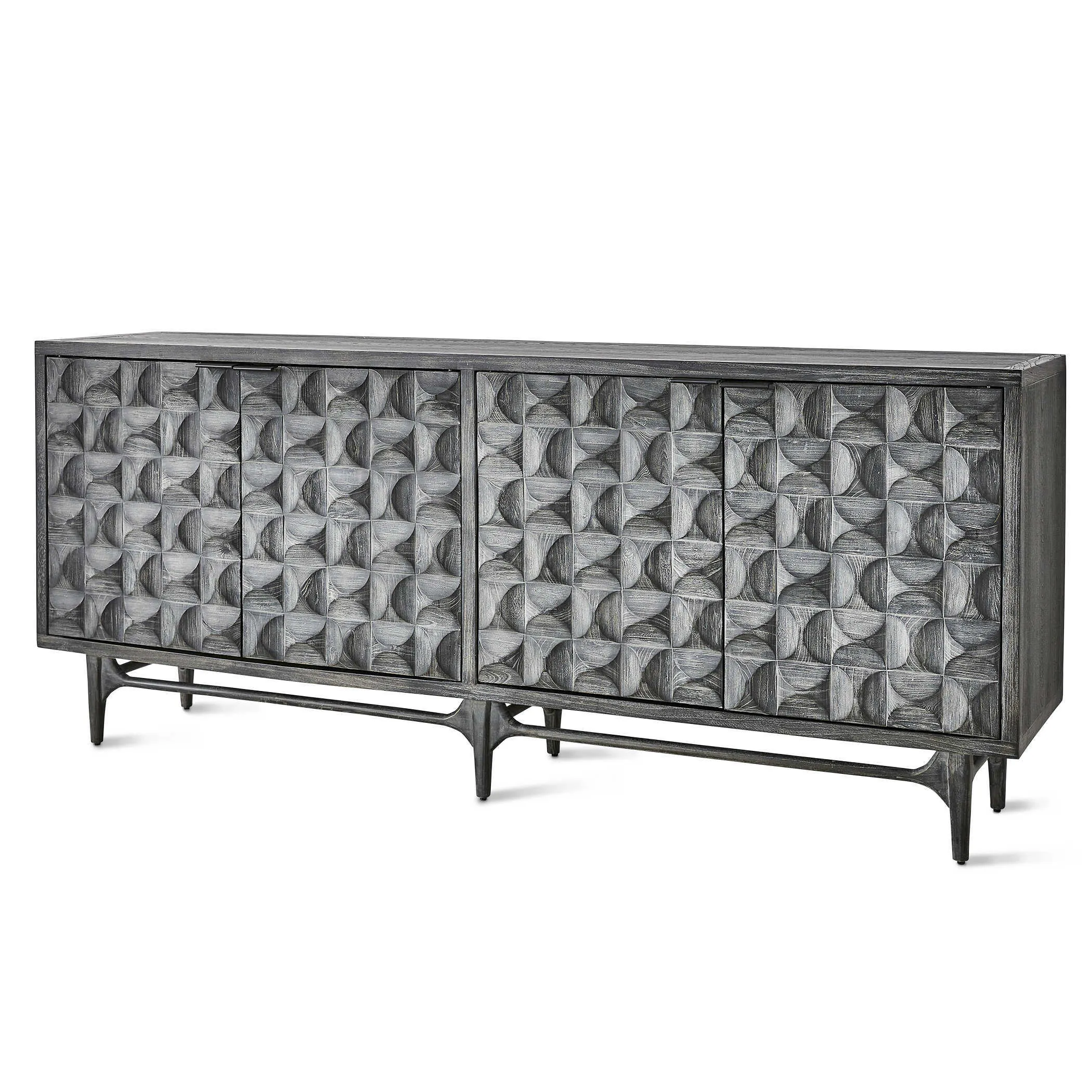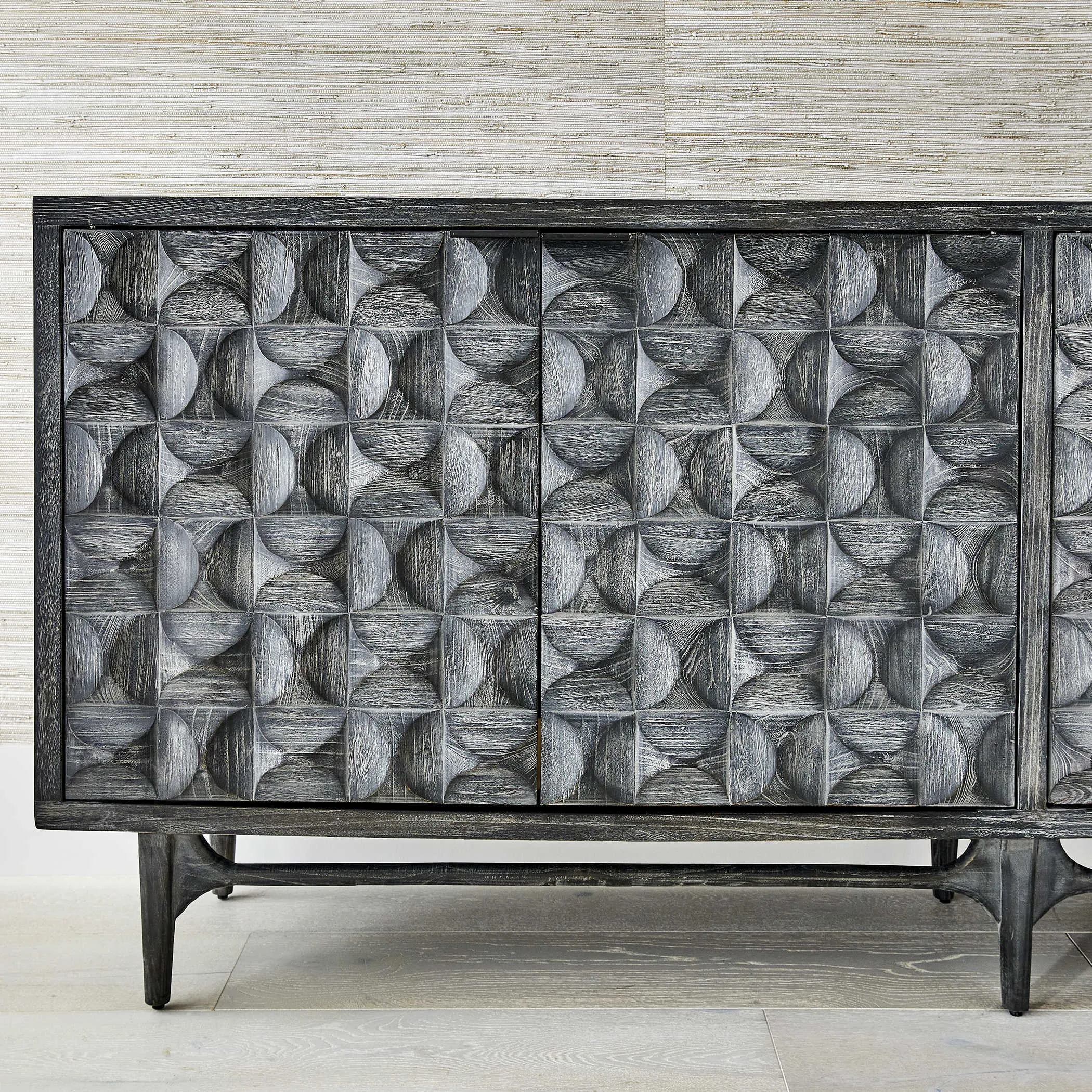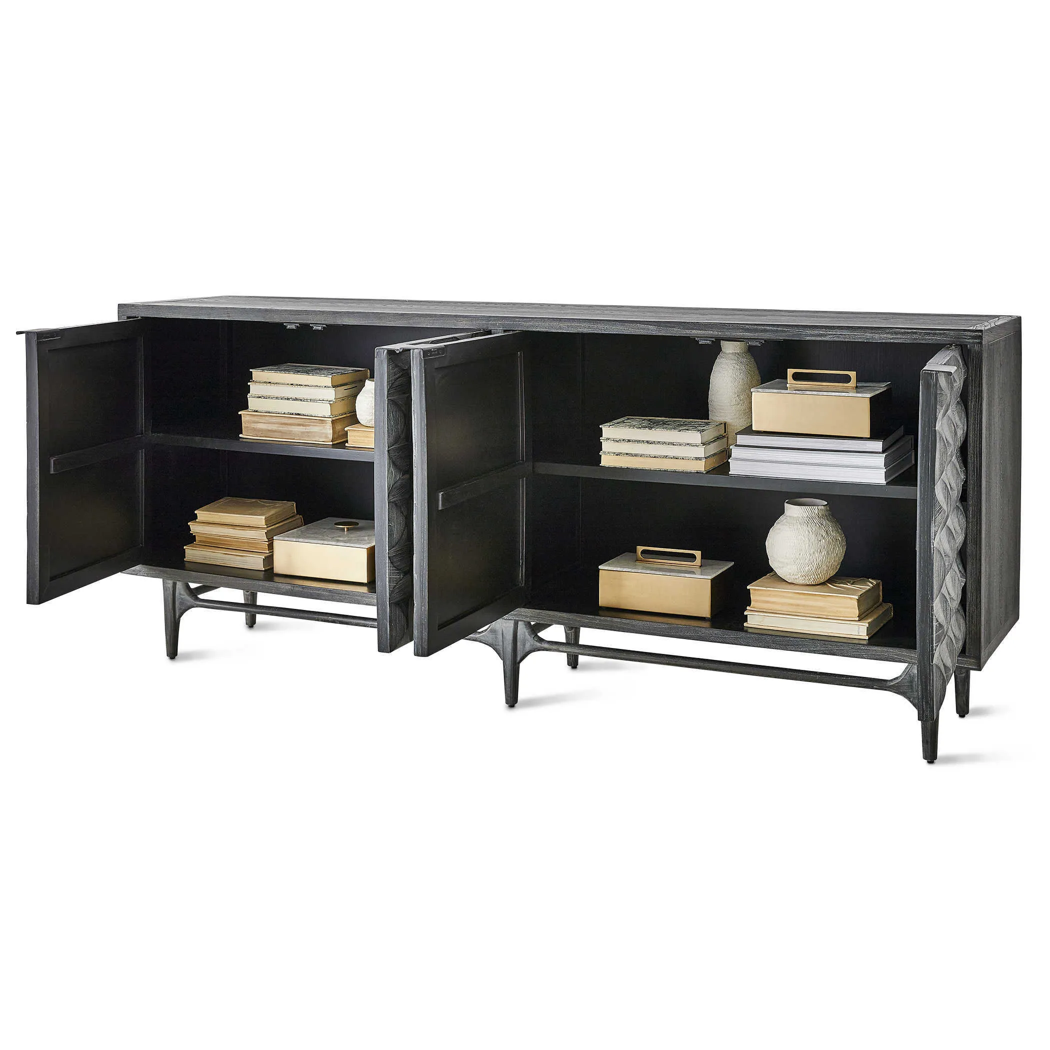 The Foursquare Cabinet cleverly conceals four doors behind its interchanging three-dimensional pattern. Discreet metal handles contain ridges for easier gripping, and the two long shelves inside are adjustable. Carved of solid elm wood and veneer, in a black ceruse finish, the cabinet appears to float on its six carved legs.