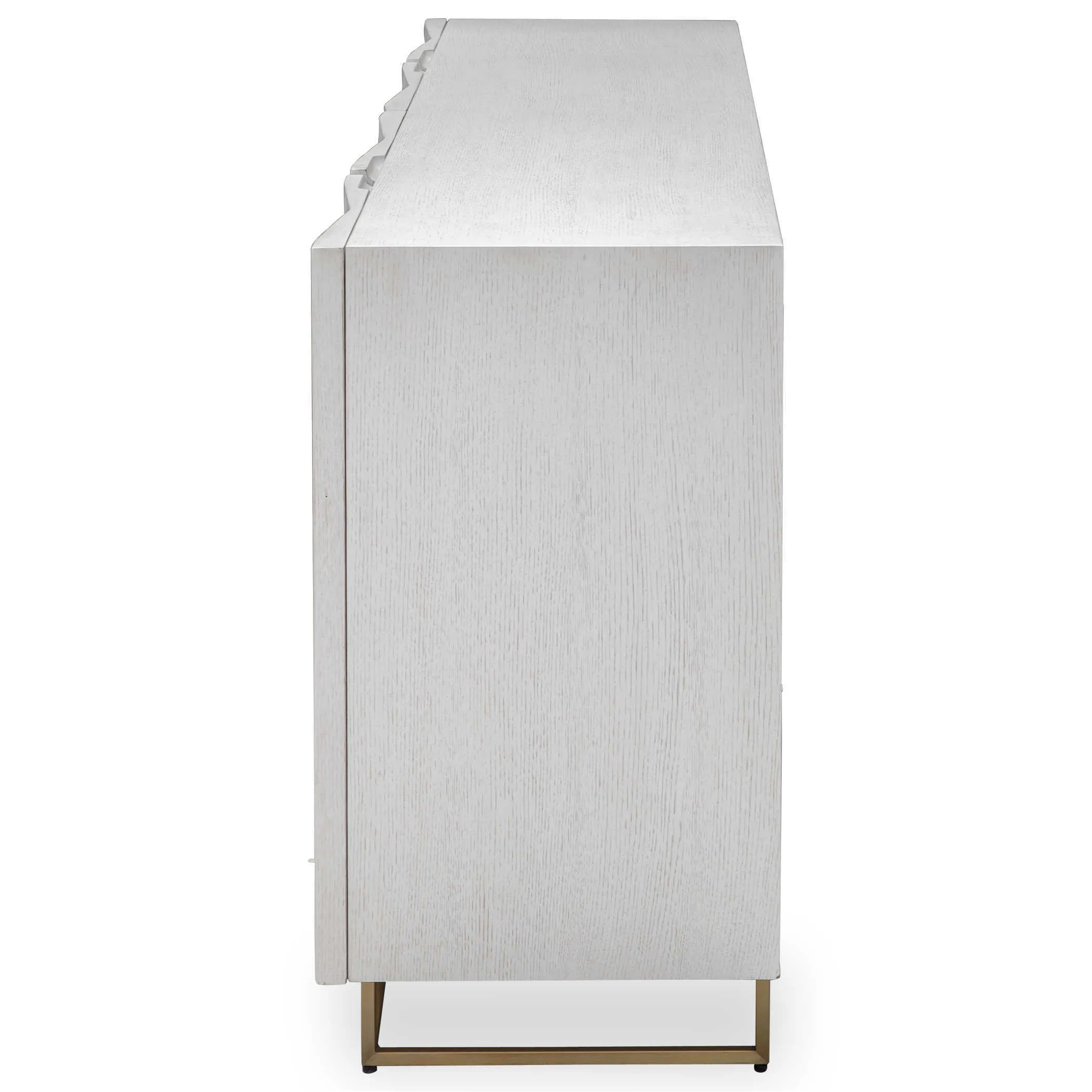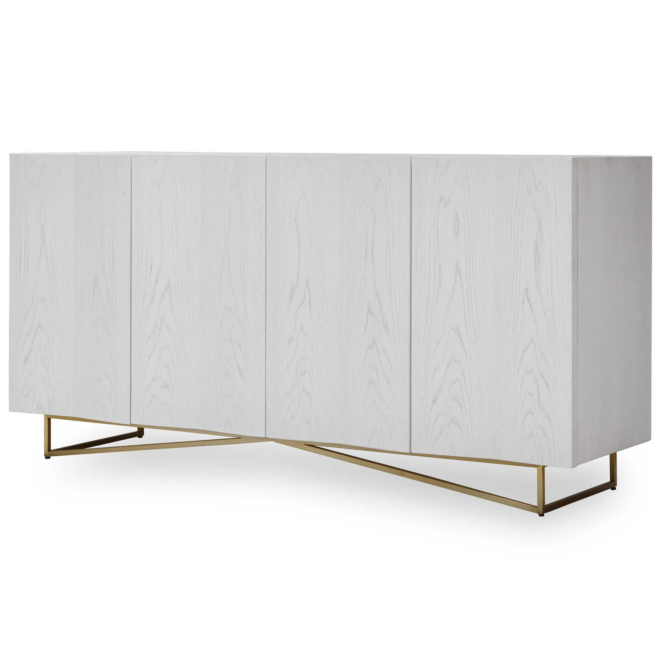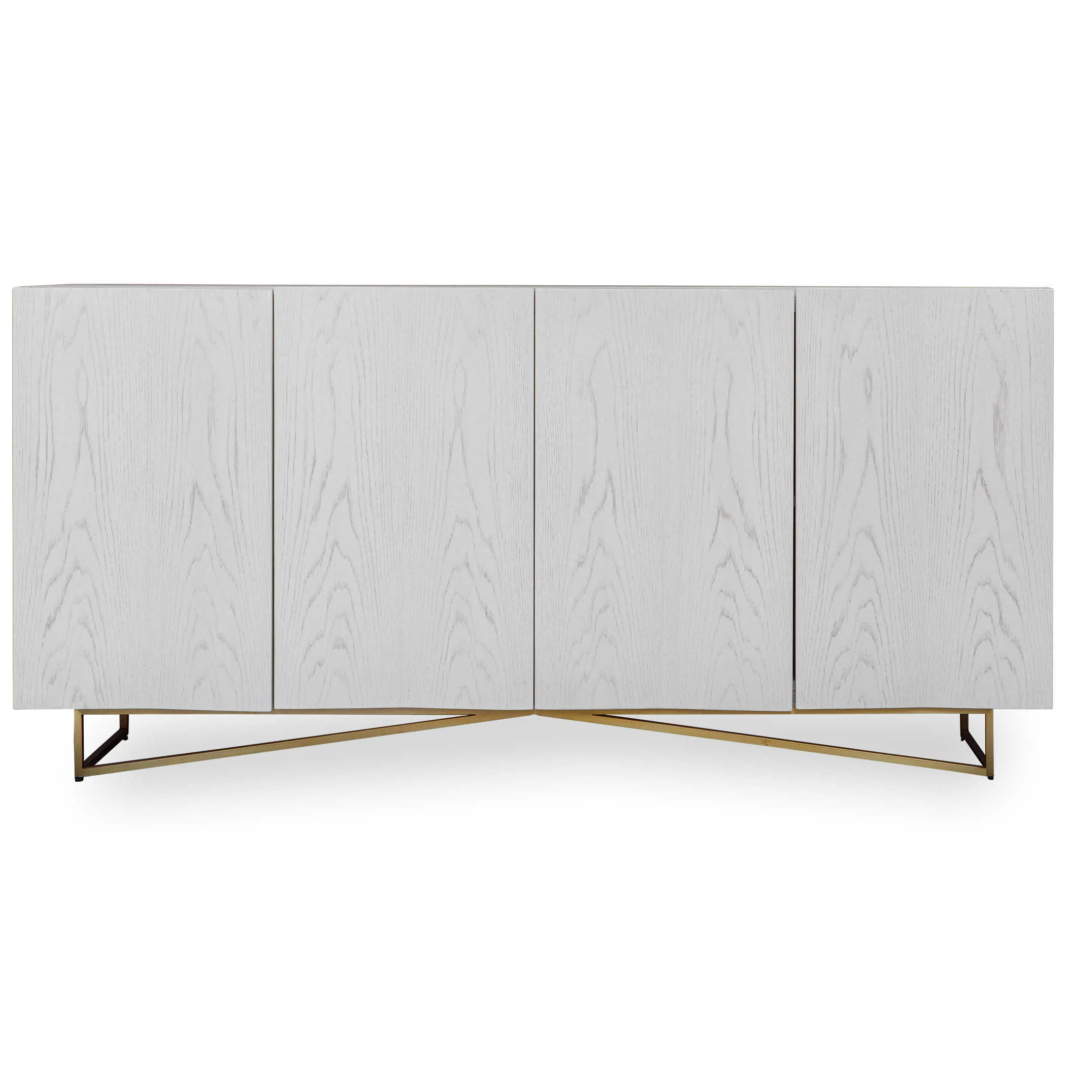 A clean and modern statement with understated style, featuring inverse beveled doors resting on a simple stainless steel base in plated brushed brass. The exterior is finished in a lightly distressed ivory over oak veneer featuring beautiful cathedral grain patterns on the front. Perfect for use as a sideboard or under a TV. Both the left and right side have one interior adjustable shelf and wire management.