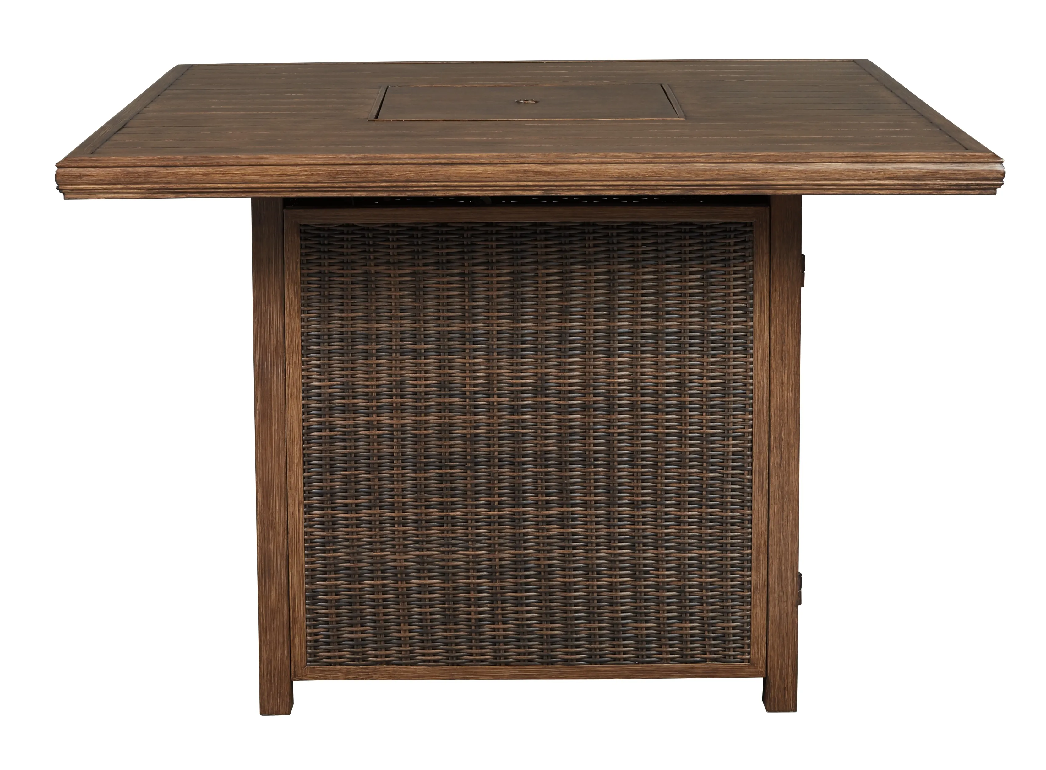 Paradise Trail Bar Table with Fire Pit: Turn your backyard space into your own piece of paradise with this outdoor table with fire pit. Though this outdoor table looks remarkably like wood, it's made of sturdy, rust-proof aluminum that's perfectly suited for al fresco living. Enhancing the rustically refined aesthetic: side panels accented with all-weather, handwoven resin wicker. The result may look high maintenance, but rest assured, this outdoor fire pit table is anything but. With the press of a button, ignite a flickering flame that dances over a bed of glass beads. And with room for up to eight, it's one highly accommodating outdoor bar table. (56 x 56 x 39)